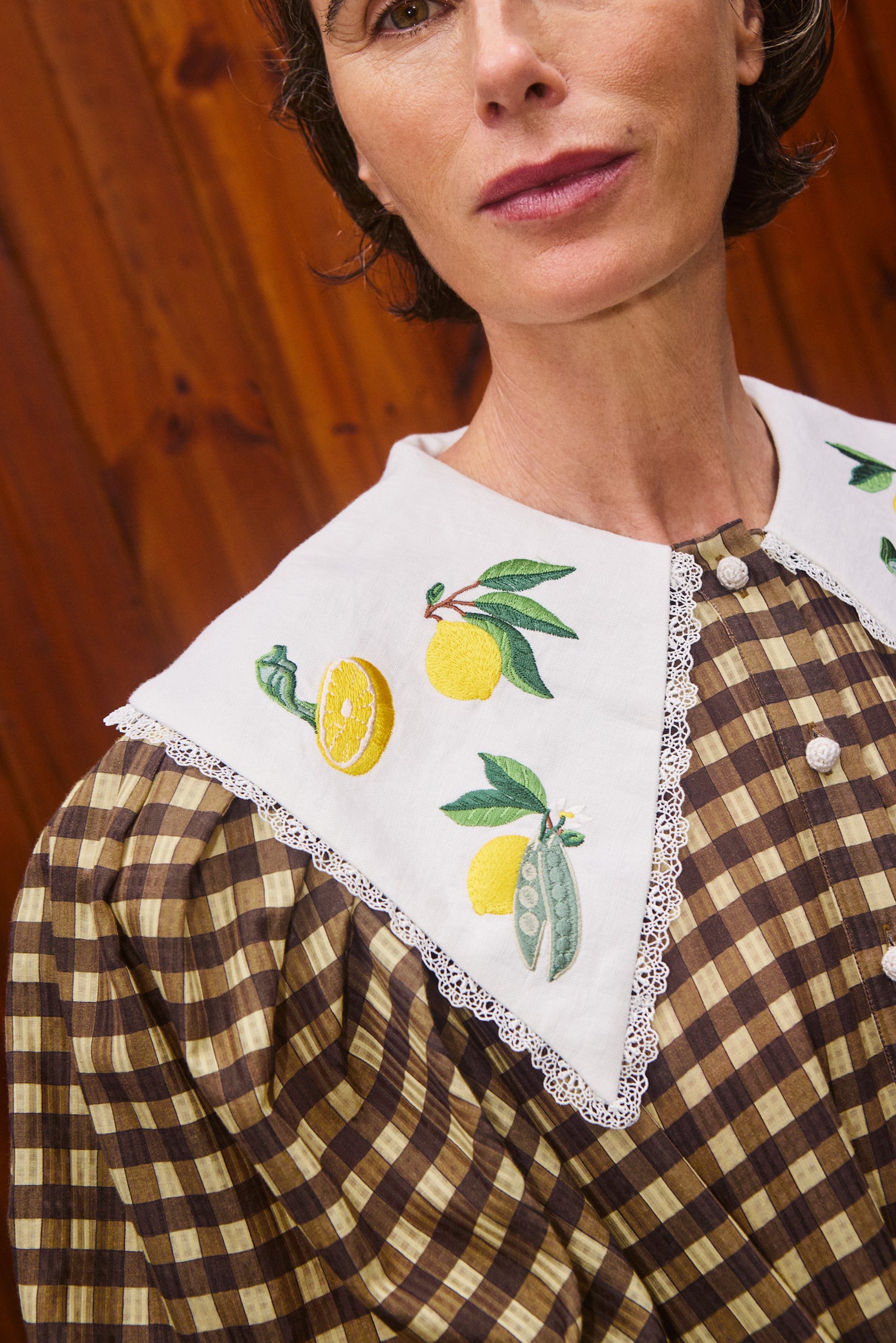 Divine embroidered midi dress crafted on a silk organza. Love this exaggerated collar and embroidery detail. True to size.