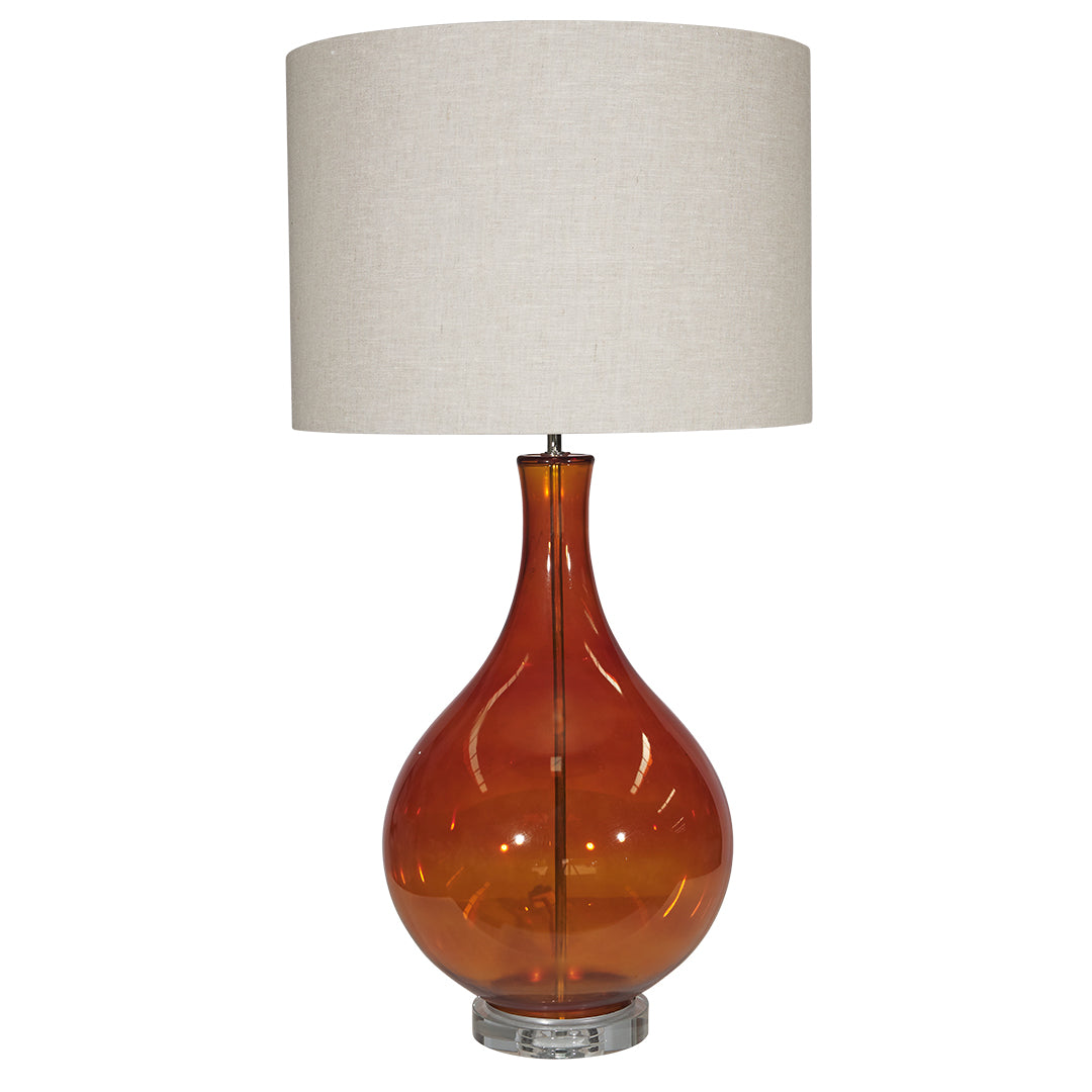 The Babylon Amber Lamp is a stunning statement piece boasting a beautiful amber glass body, transparent base and natural tone drum shade.