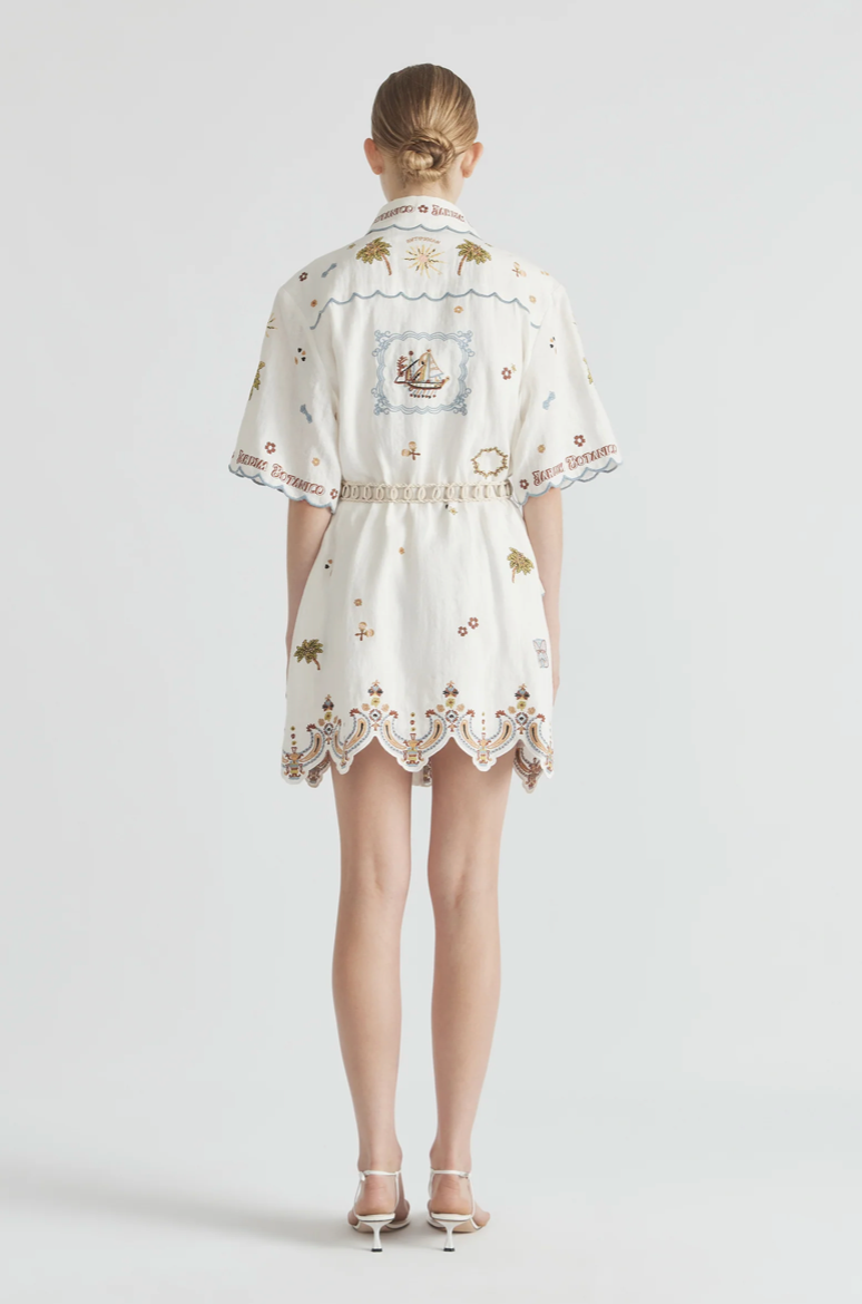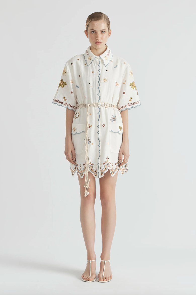 The Bombora Short Shirt Dress honours Antipodean’s affinity for other-worldly iconography. Crafted with original in-house placement embroidery, hand-drawn by our founder, this short dress is an ode to utility dressing. With short sleeves and a hand made belt, it blends functionality with style seamlessly. The concealed placket and side seam pockets add practicality, while the feature waist belt and unique Carnival-inspired hemline accentuate the silhouette. Elegantly embrace adventure in this versatile piece.