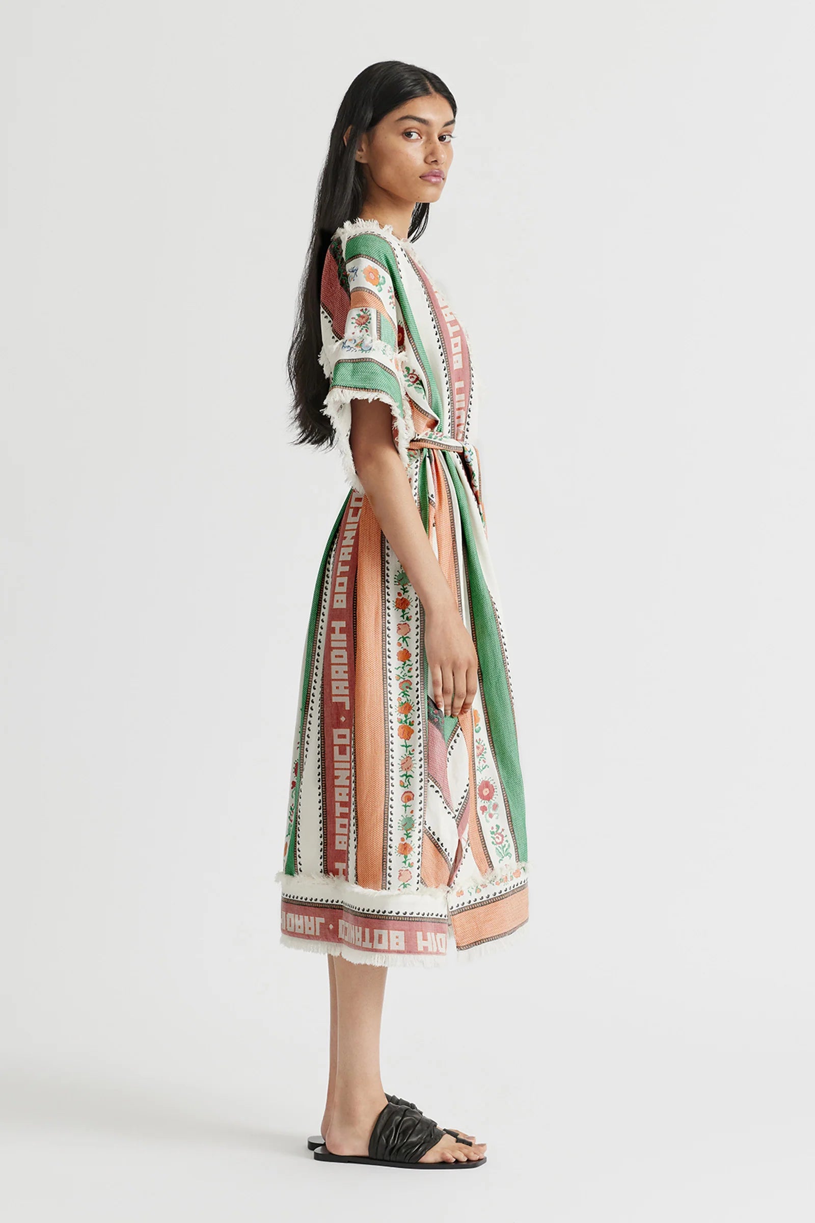Embrace the art of Resort dressing with the Jardim Botanico Fringe Short Sleeve Kaftan by Antipodean. Brought to life with an exclusive print, meticulously hand-drawn by our founder. This short-sleeved kaftan features a flattering V neckline and Resort ‘25’s signature fringing detail at the collar, cuff, and hem. Relaxed yet elevated, revel in the ease of artisanal elegance with every wear.