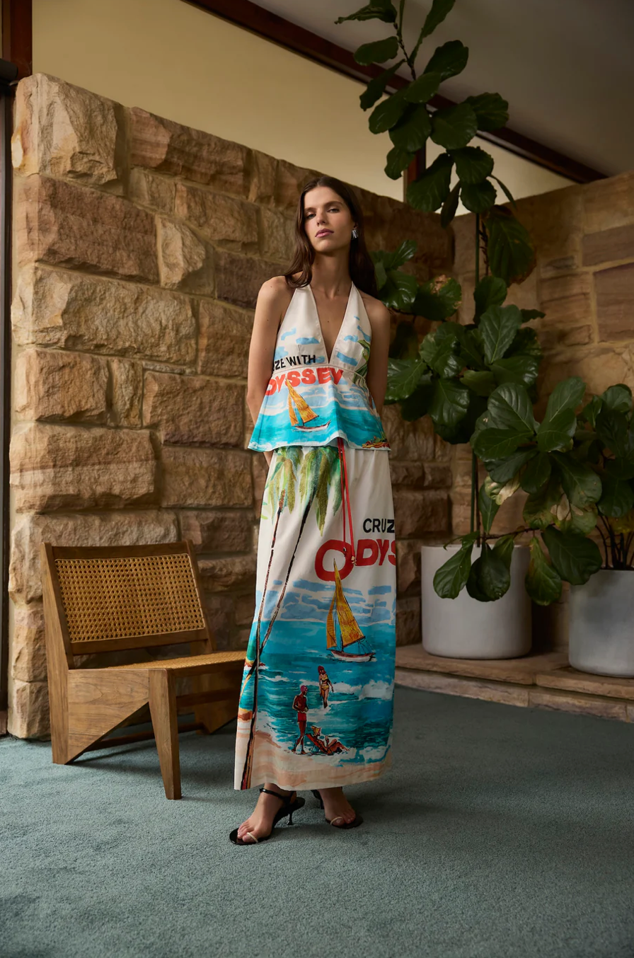 The Cruze Back Tie Top is a study in ease and colour. Featuring our original hand-painted Cruze print, it captures a nostalgic coastal scene of sailboats, palms, and sunlit waters in painterly shades of turquoise and coral. Crafted in a breathable cotton, the design features a deep collared neckline, soft peplum hem, and adjustable ties at the open back for a sculptural fit. An effortless piece designed for long summer days by the sea.