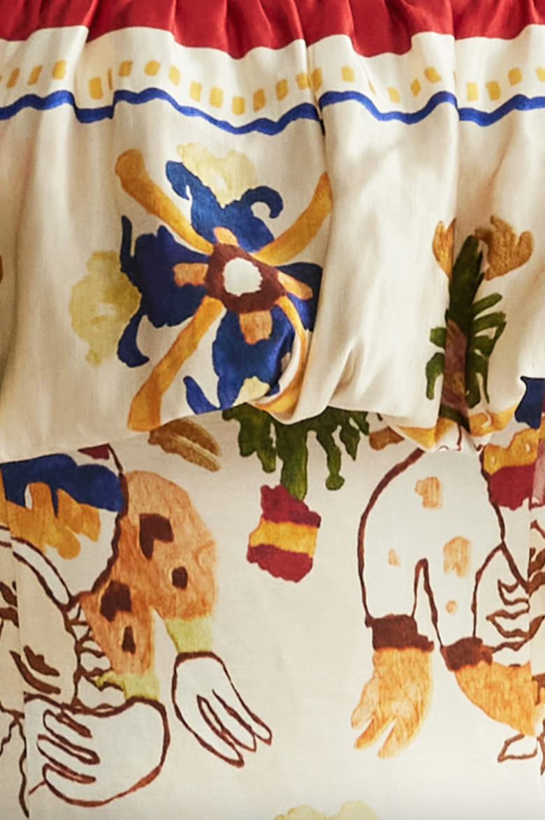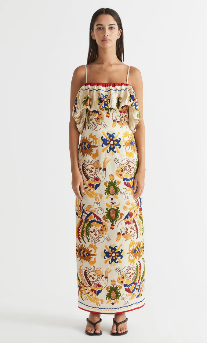 A must-have piece for the Spring Summer ‘24 season, the Dancer Frill Neckline Gown by Antipodean pays homage to enchanting new territories. Artfully charmed with an air of sophistication, the dress features an original in-house placement print, hand-drawn by our founder. Crafted from an elegant silk linen fabrication, the flattering waist detail accentuates your silhouette gracefully while the bubble frill adds a layer of sartorial drama. Complete with a centre-back zip entry and high back vent for ease of wear and movement, adjustable thin straps for a customized fit, and fully lined for comfort.