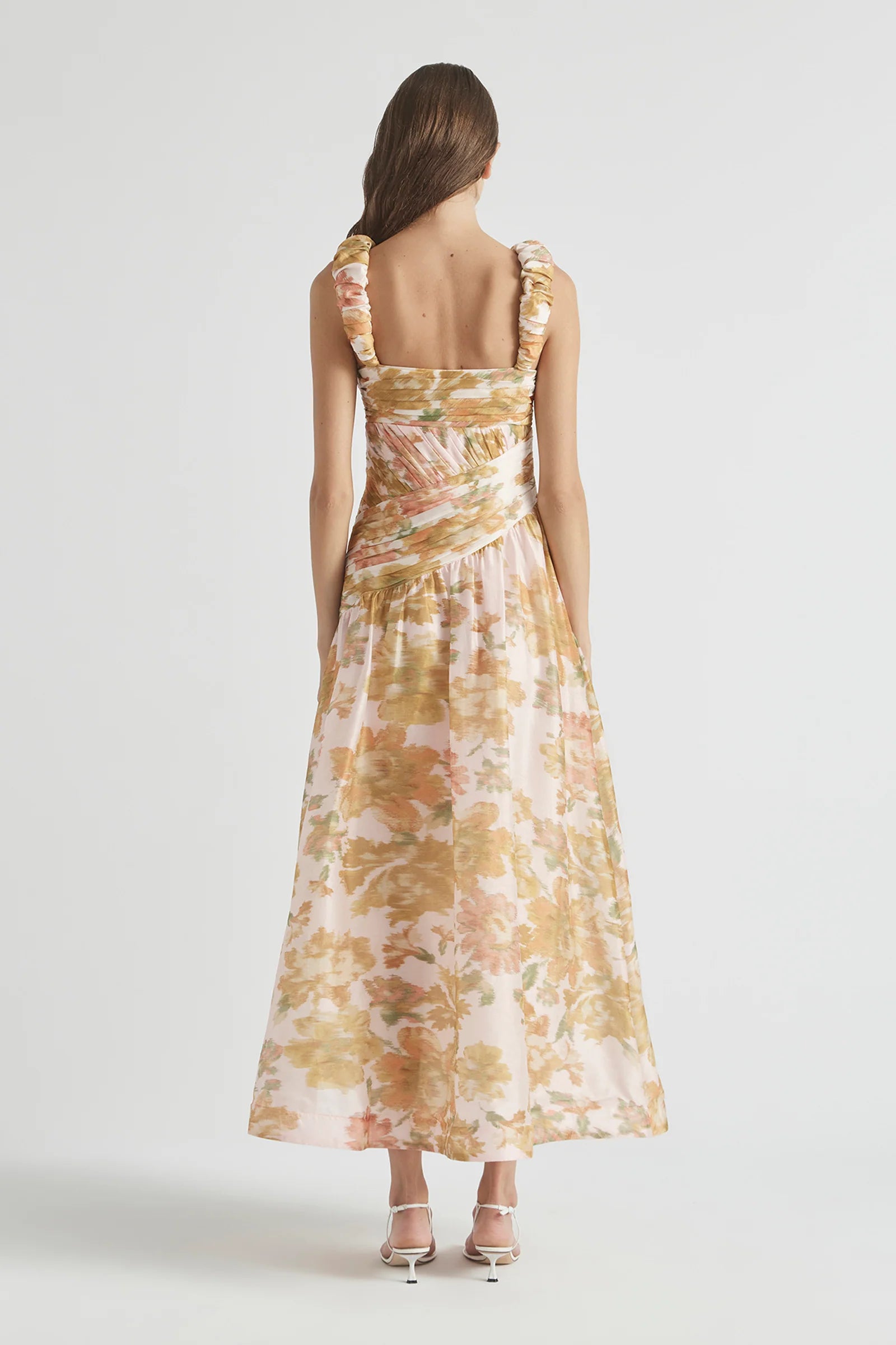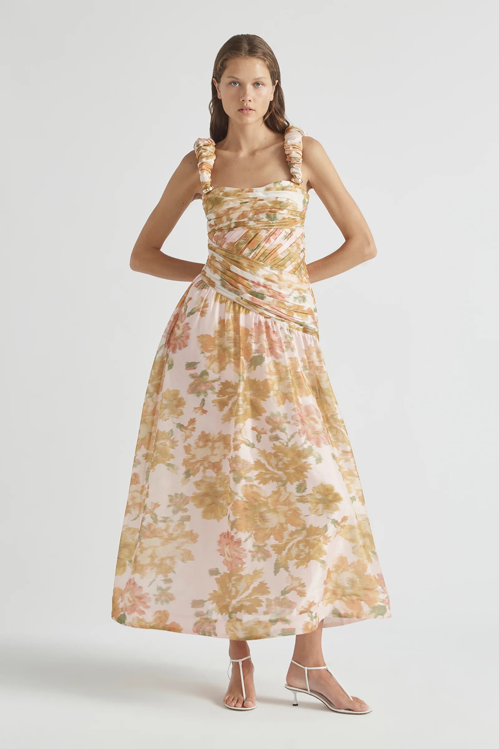 The Rouched Strap Gown is a show-stopping piece crafted in lustrous silk cotton organza and spliced with an exclusive in-house print hand-drawn by our founder. Designed with a fitted bodice, delicate tucks, and rouching at the straps, it flows into a full skirt finished with a crinoline hem for dramatic movement. With a side seam zip for ease, it’s perfect for garden parties, weddings, or special dinners. Style with strappy heels or statement flats to complete the look.
