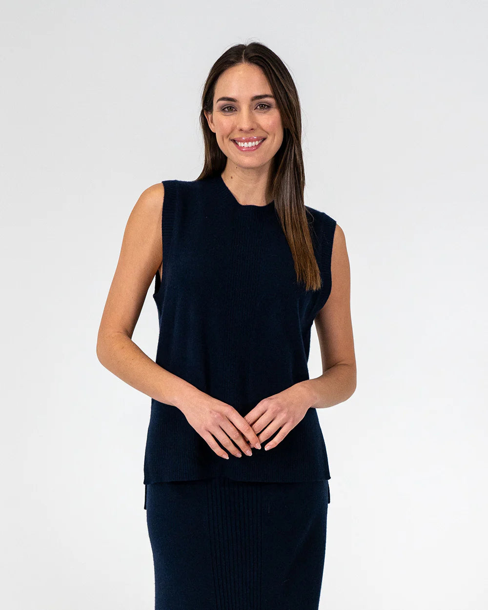 The Alana Vest is a 12 gauge plain knitted vest with a centre front ribbed detail. The vest features a crew neck and a split hem. The split hem making it ideal to wear out over a skirt or trousers or can be completely tucked in. The Alana Vest is perfect for layering over shirts or blouses or equally can be worn as an item on its own. A soft, seamless layering staple, this vest is knitted in a plain stitch for a flattering fit and is crafted from wool cashmere blend for a tactile finish.