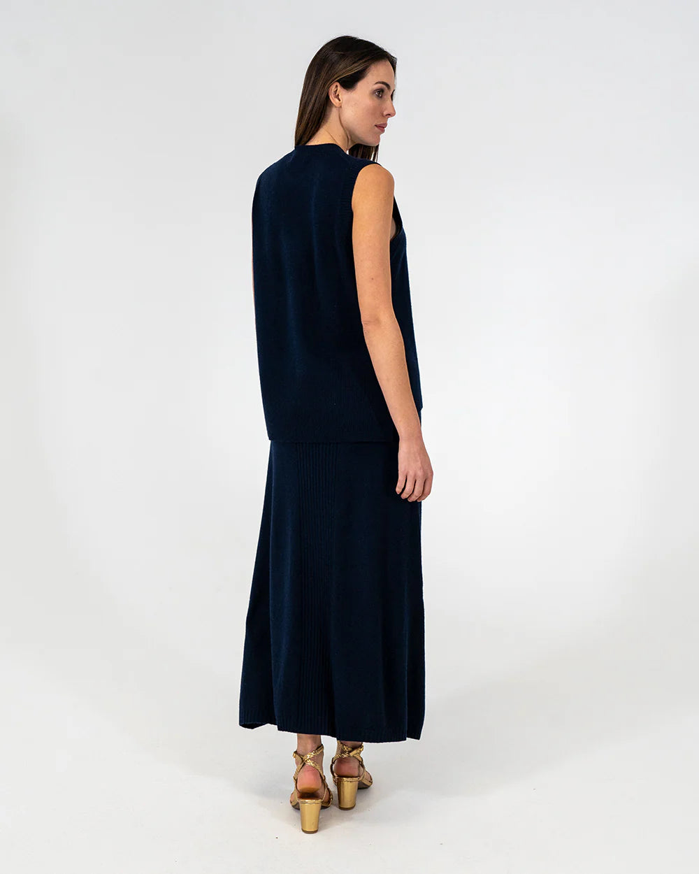 The Harriet Ribbed Skirt is 12 gauge plain knitted skirt. The A-line shape is finished with a ribbed elastic waist and ribbed detail on the hem. The skirt features a plain knit structure with a ribbed detail down the centre front, and is extremely comfortable on the body. This Harriet Ribbed Skirt is an integral player in building polished weekday and elevated weekend looks, and is crafted from an easy care merino wool and cashmere blend yarn.