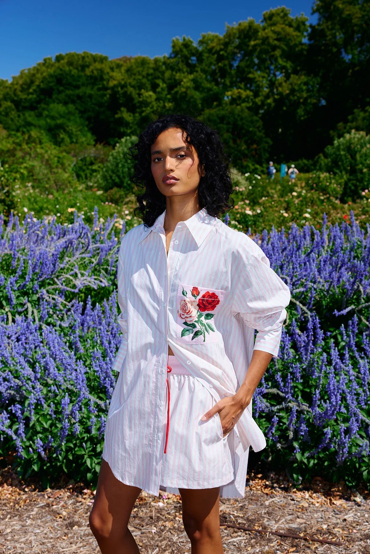 Introducing Aston Studio's Buddy Shirt, an oversize classic collared shirt in the exclusive Lapis Stripe cotton poplin featuring a contrast Hibiscus locker loop detail. Crafted with a point-collared neckline, a front white pearl button, and a pocket at the chest. The shirt showcases the signature ASTON branding placard on the yoke.