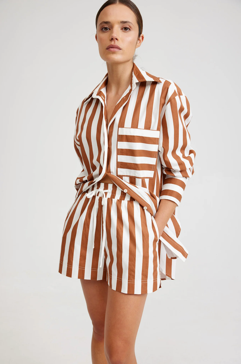 The Harvey Short in Cigar/Optic stripe cotton poplin features elasticised waist with Optic tie detail and curved wide stitched hem detail.