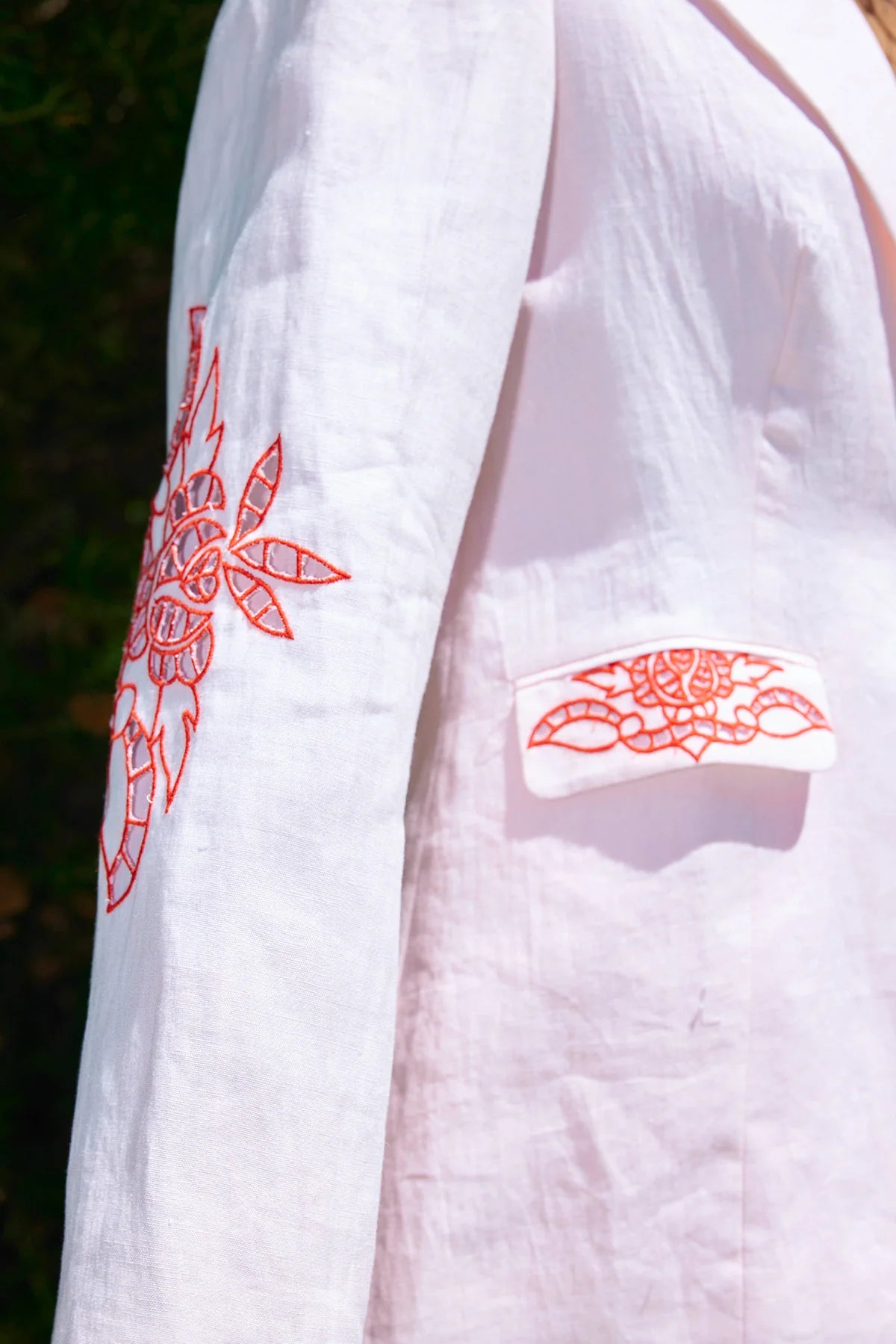 A beautifully crafted piece, classic baby pink elevated with a pop of red embroidery. True to size x