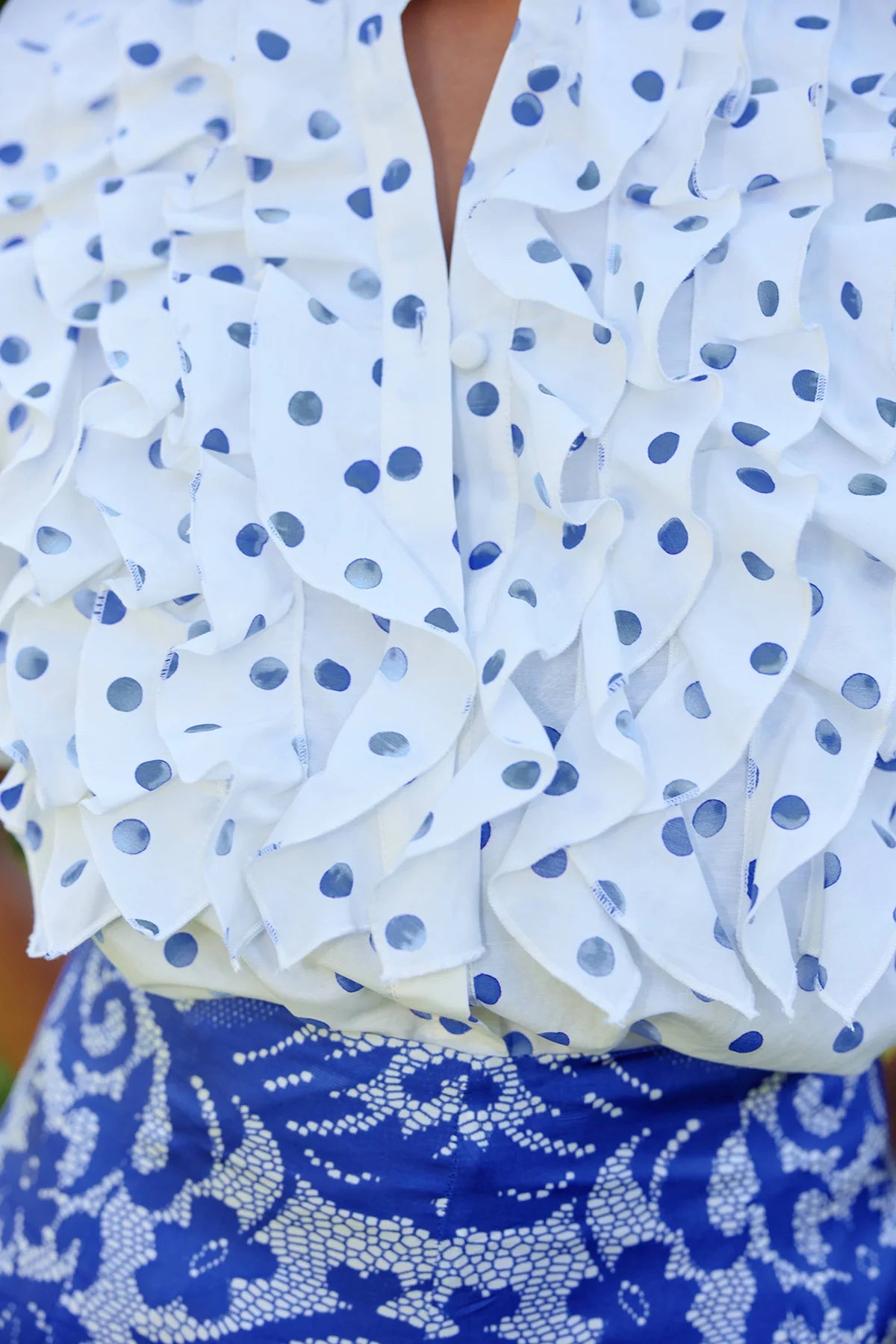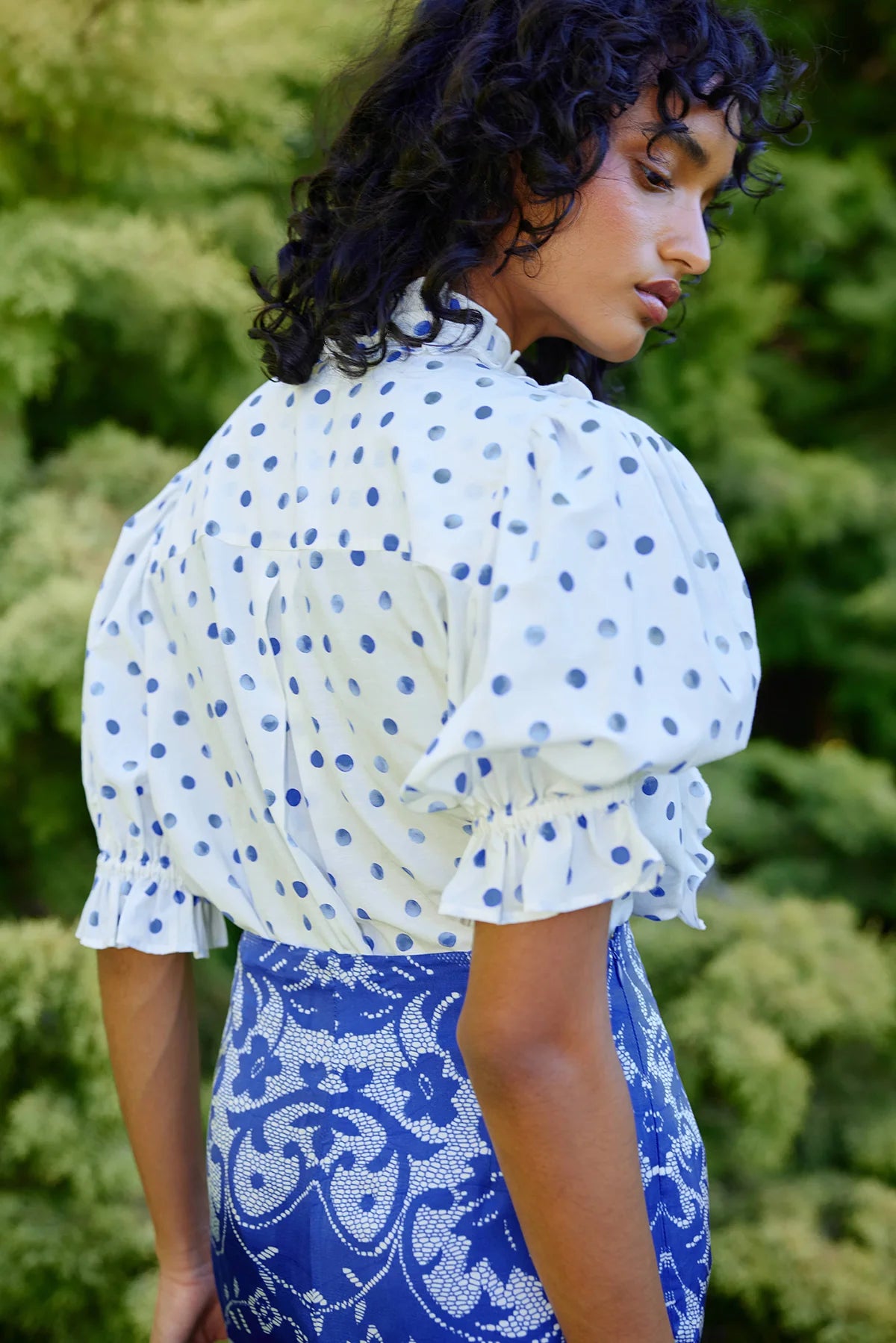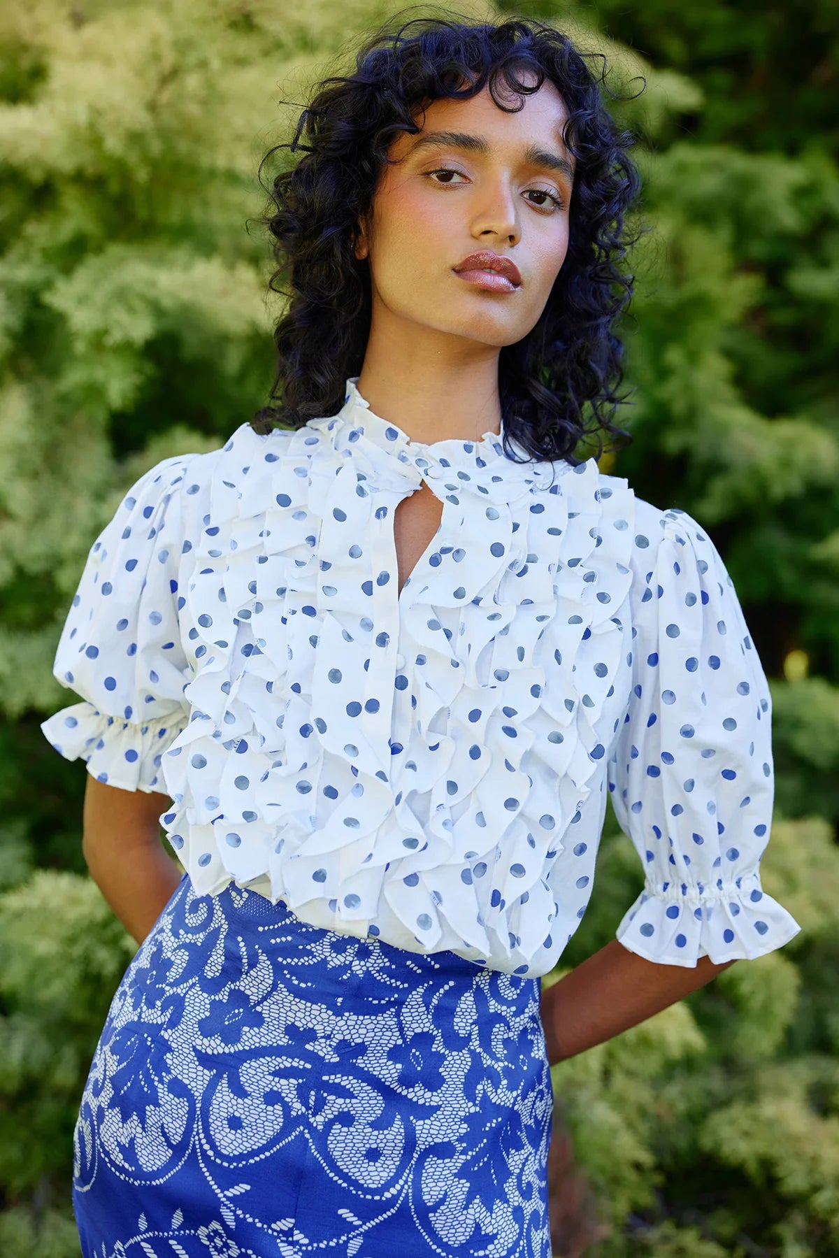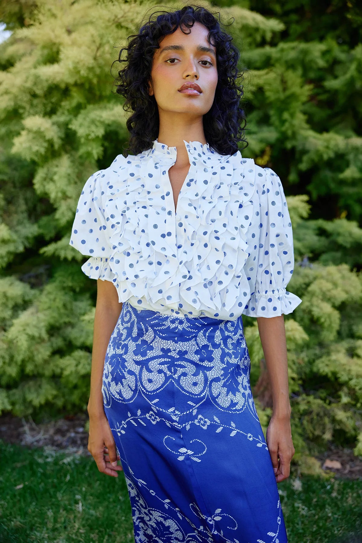 The Mavis Blouse in Antique Royal Polka Dot is a short sleeve blouse crafted from a refined silk-cotton blend with feminine front ruffle detail. Pair the Mavis Blouse with a high-waisted midi skirt or tailored pants for a sophisticated silhouette.