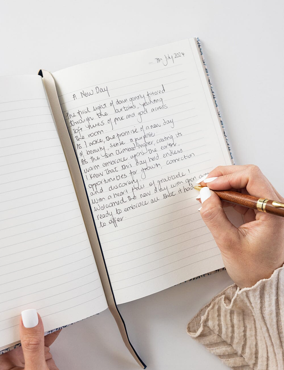 Our new beautiful linen bound journal features gold foil printing, gold gilded edges, decorative internal covers, satin ribbon markers and two hundred heavyweight pages printed on chlorine-free pure wood fibre paper.