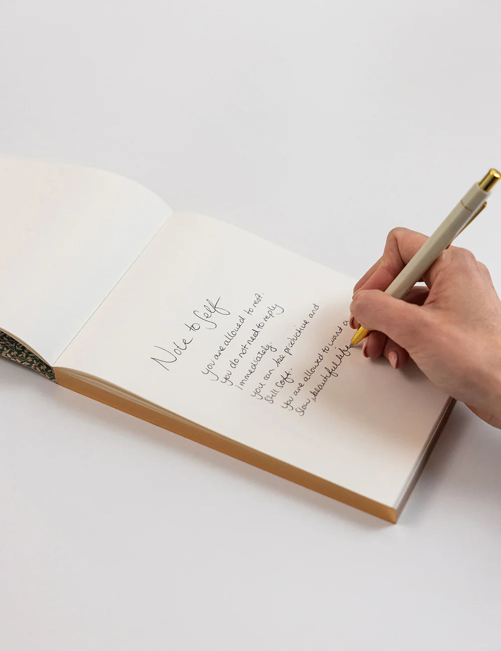 Featuring 100 heavyweight tear off blank pages. Bound with a gummed edge, and full heavyweight wrap around cover. Removable Gold Foil printed Bellyband and gold foil and gilded edges.