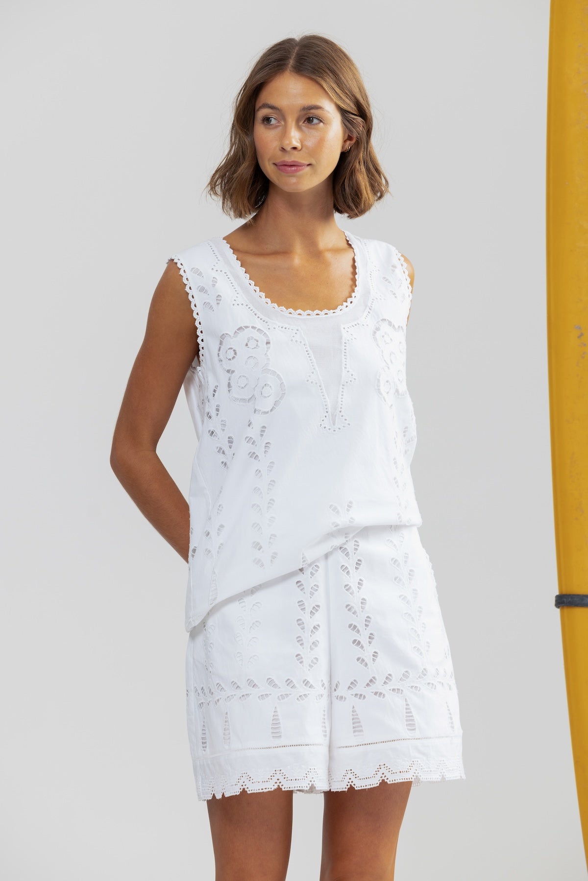 FRESH MINT. Perfect with everything. Sweet, fresh & very pretty. Best served with a side of sandy toes & iced water with lemon slices. These embroidered cotton shorts are the very pretty bottom half to your summertime uniform - with a comfy elastic back, sweet scalloped edges, and pockets for shells (no phone, digital detox all summer). White shorts for summer always. Pair with the HOMEMADE LEMONADE tank for the full citrus-spritz effect.
