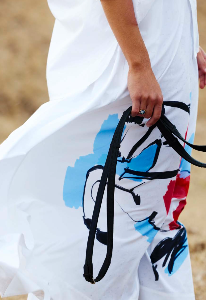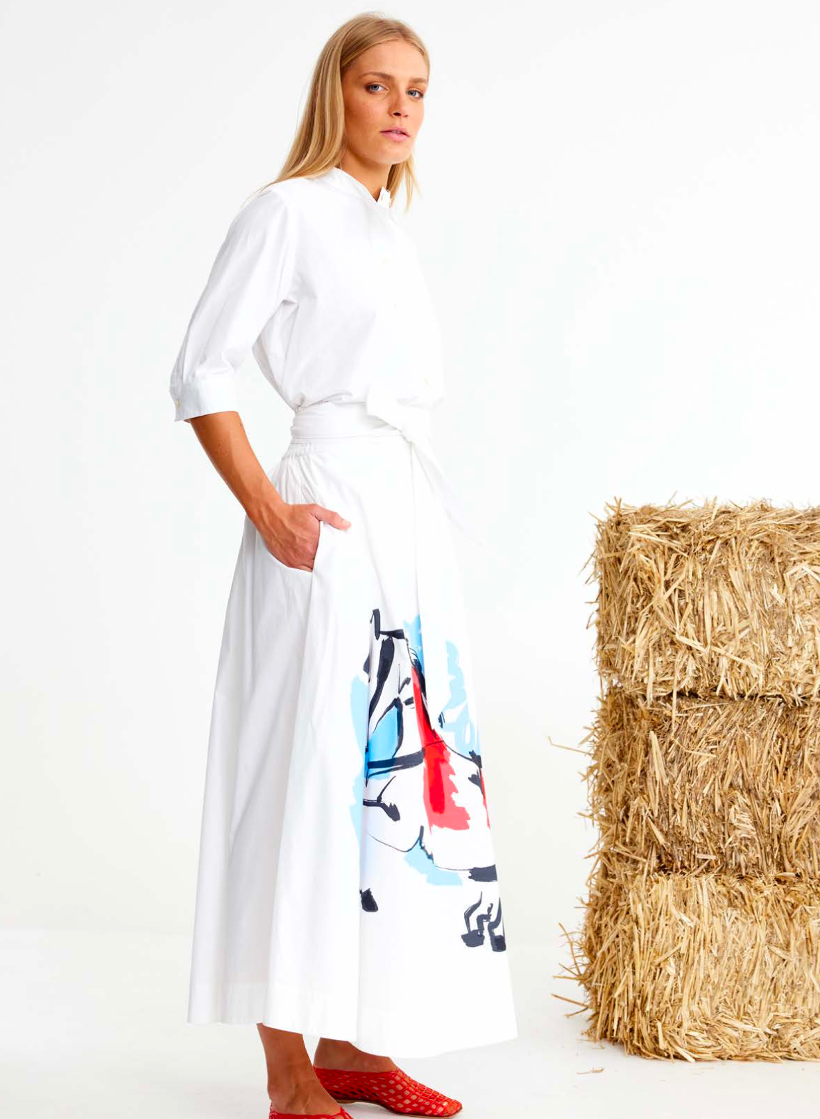 The Pesade is a dressage position in which the horse stands on hind legs with the forelegs in the air. (We do this daily with our arms at the state of house / child / life.) Huge circle bias cut skirts are trending & we love ours with our ‘Picasso Pony’ print in full expressive stride. The crispest whitest cotton poppin poplin with side pockets. Get off your high horse & into this skirt.