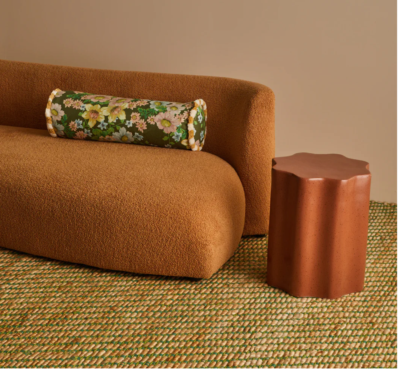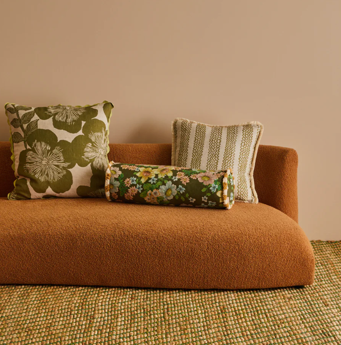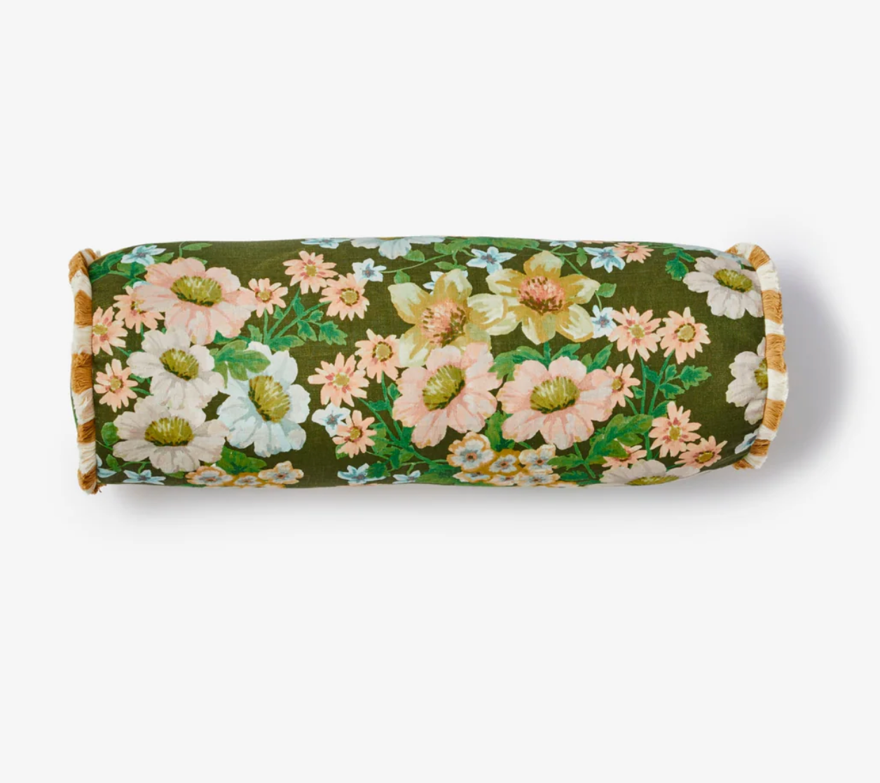 In olive green linen, this bolster cushion features the dainty floral forms of our Buttercup print. A refined, garden-inspired shape for beds or sofas.