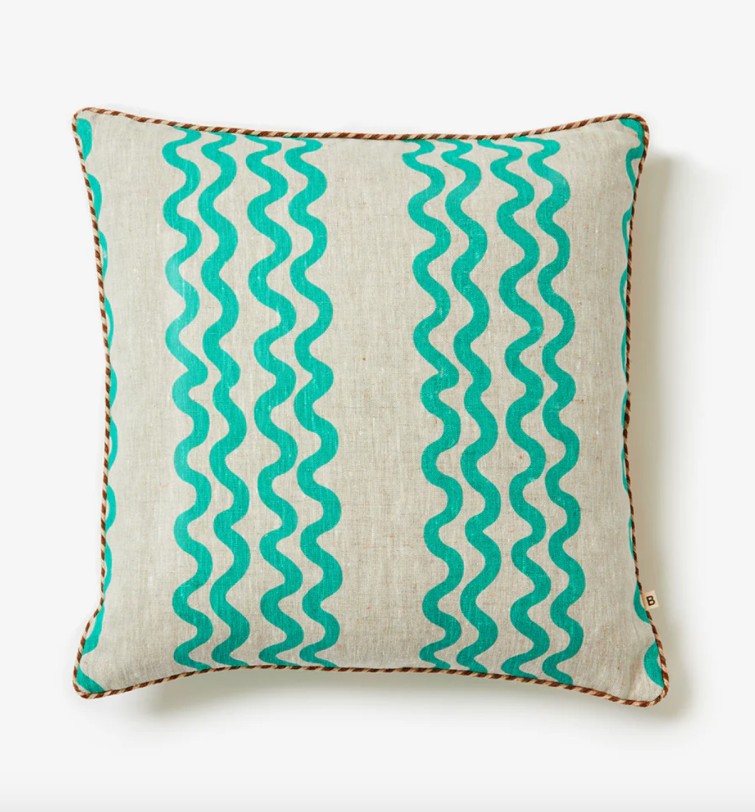 Our Double Waves Bright Green 50cm cushion features original artwork by Bonnie printed on oat linen. The reverse of the cushion features the same design.