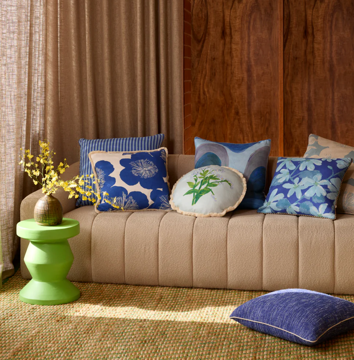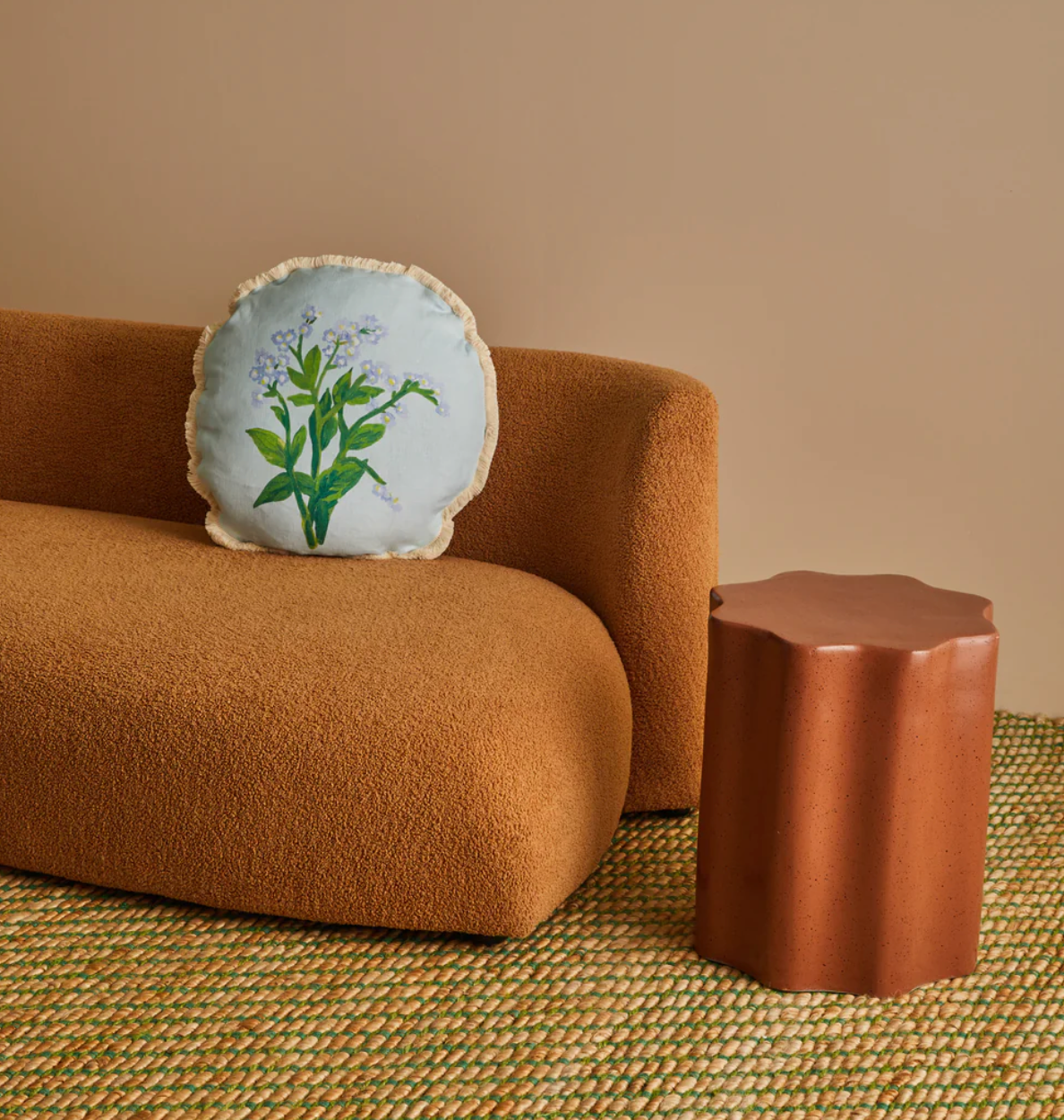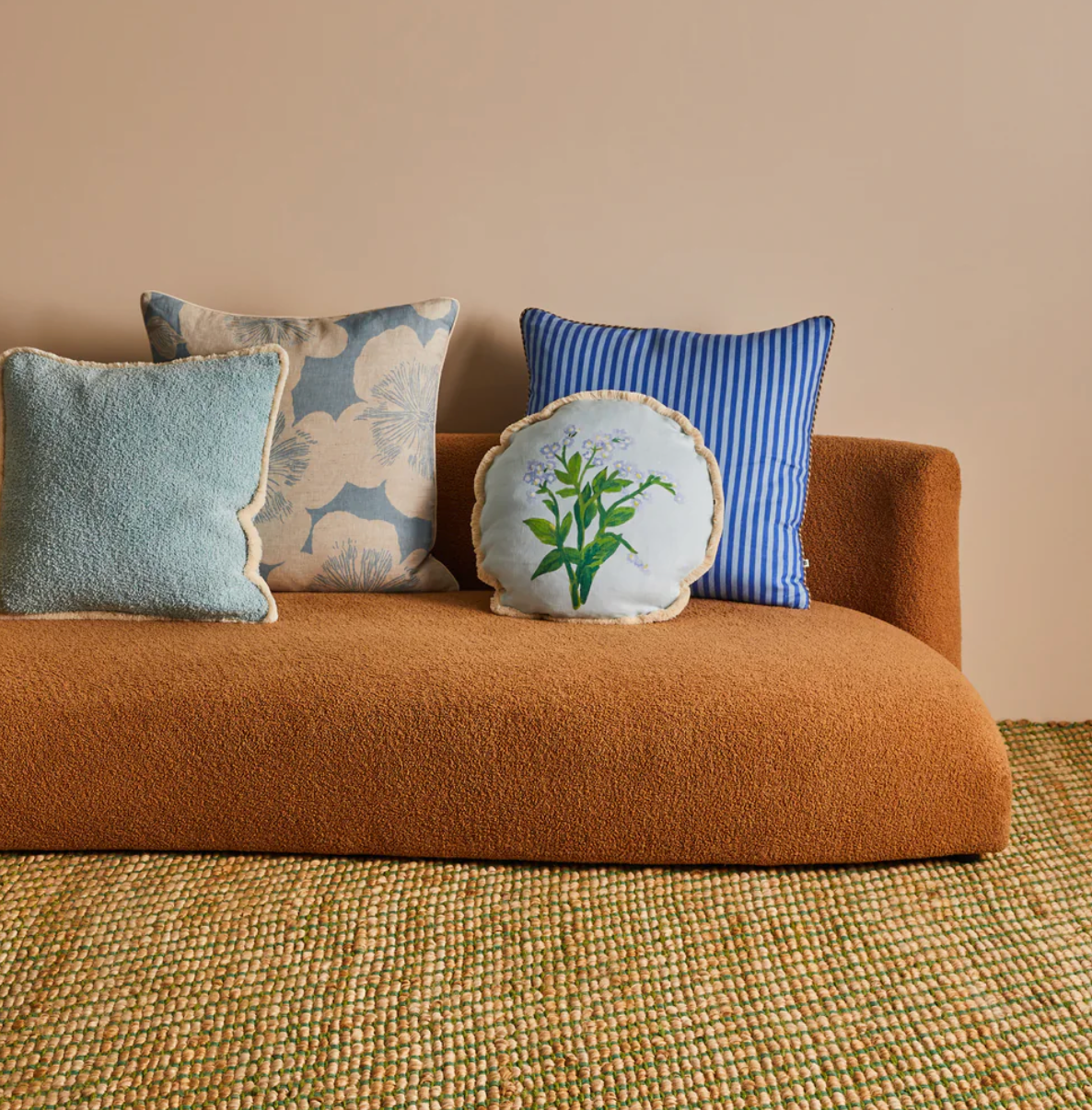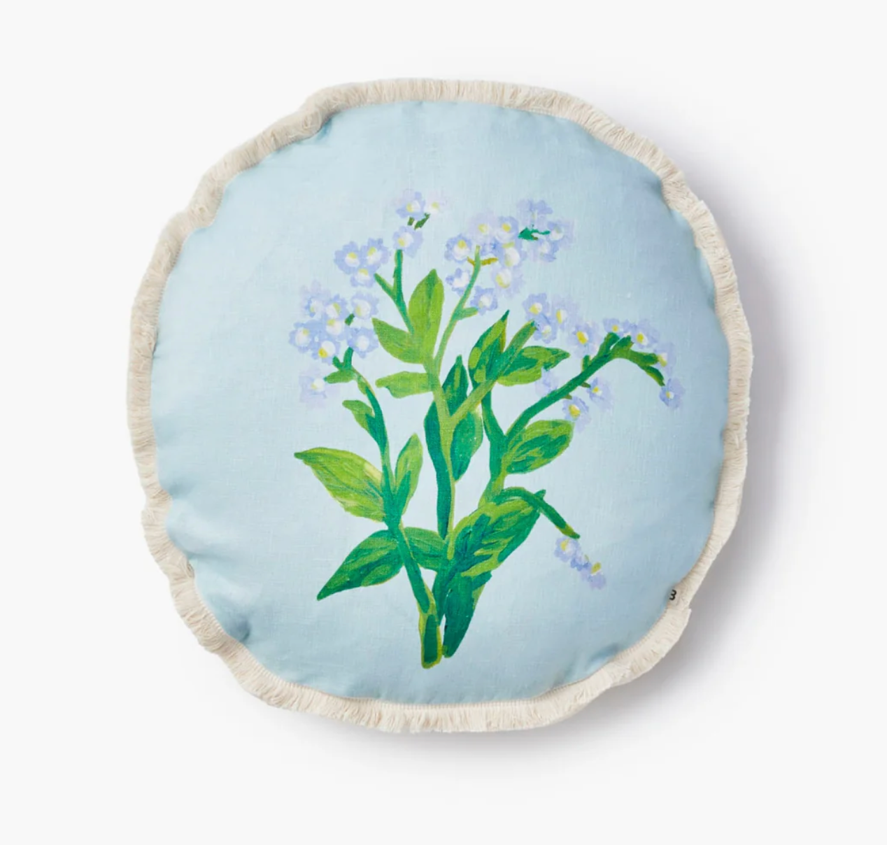 A round linen cushion scattered with blue hand-drawn Forget Me Not flowers. Light and calming, it adds a soft, nostalgic mood to any setting.