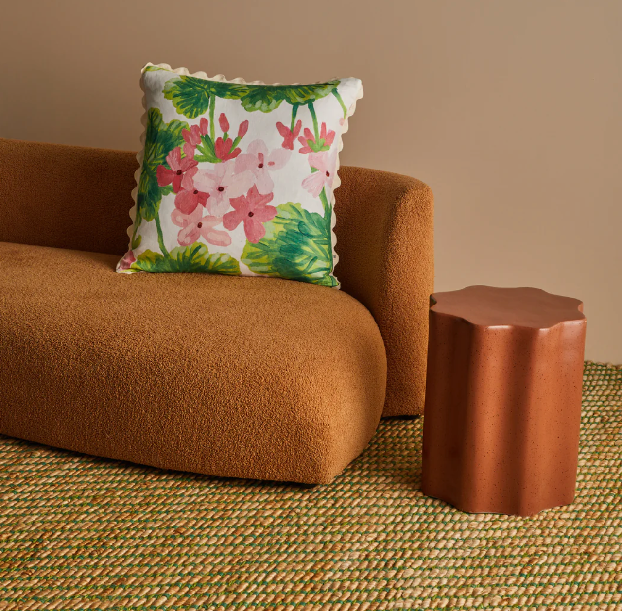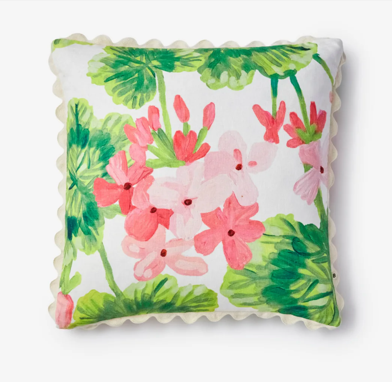 A joyful tangle of painterly geraniums in full bloom, this pink and green floral cushion captures the wild, lemon-scented beauty of overgrown garden corners.