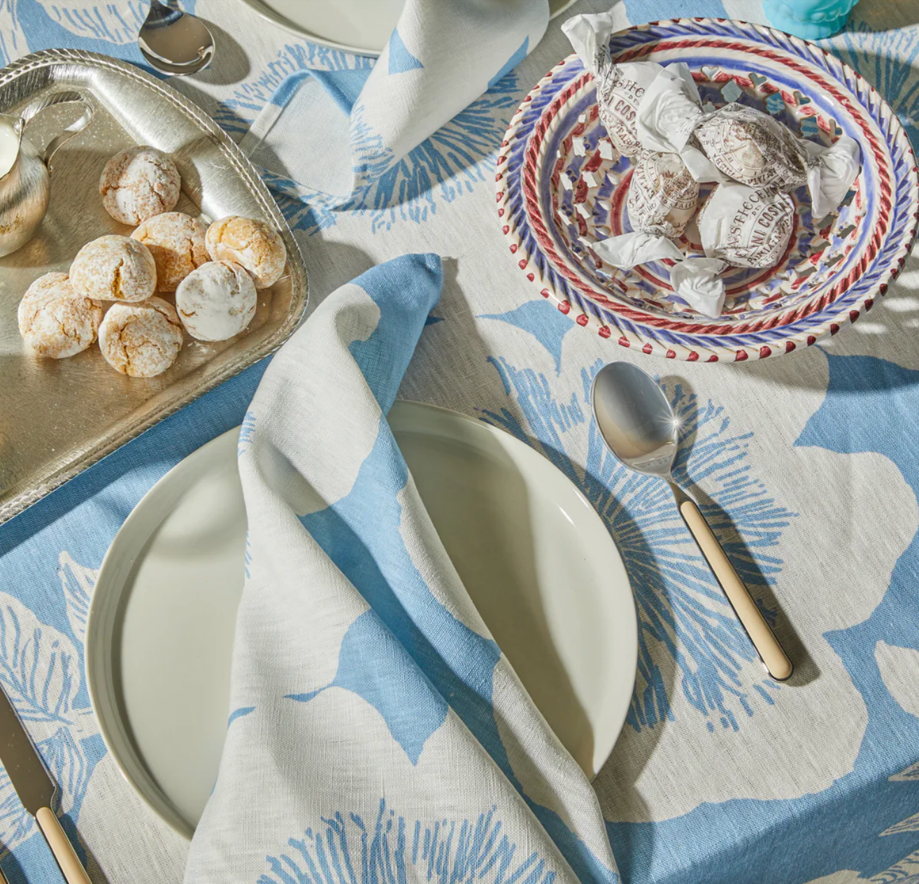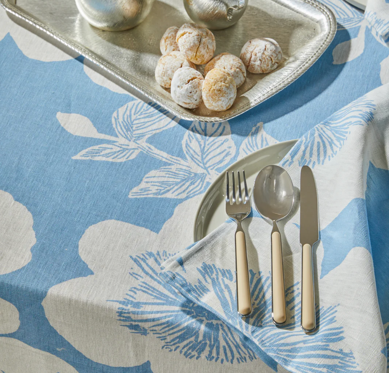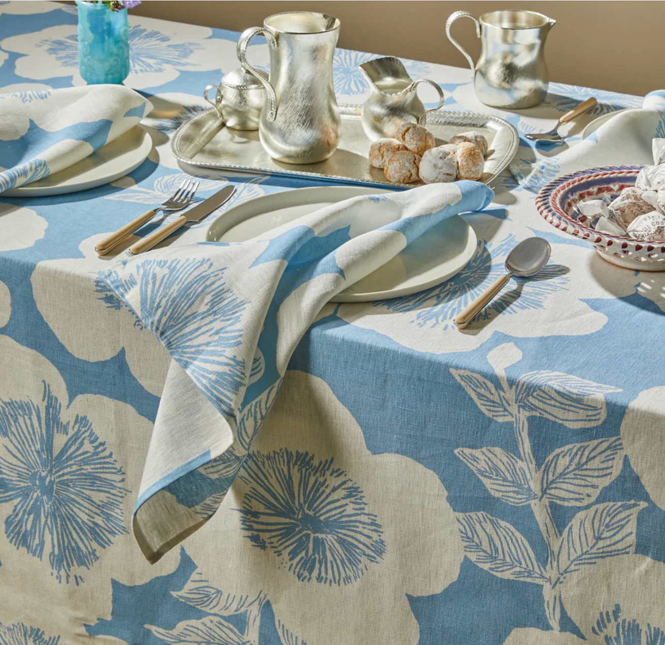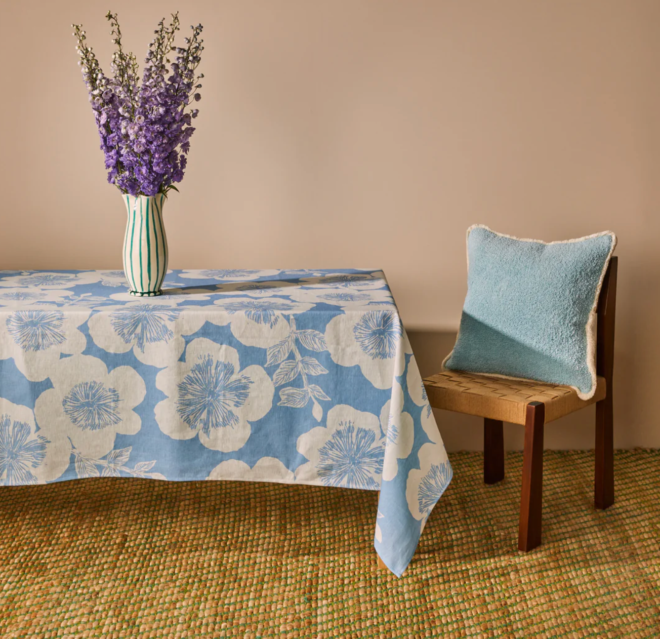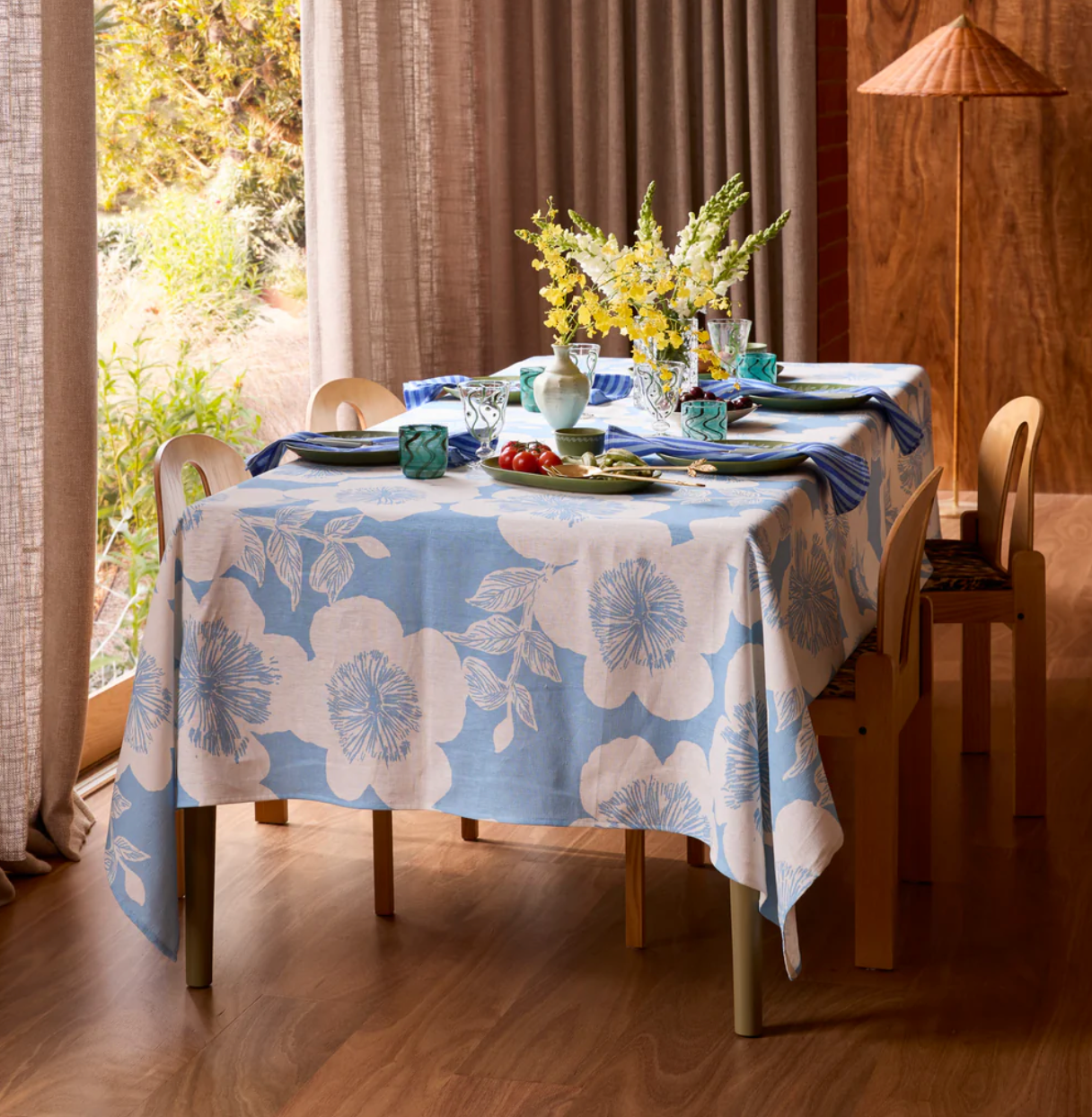 Graphic yet soft, this linen tablecloth showcases sculptural floral design in dove blue tones.