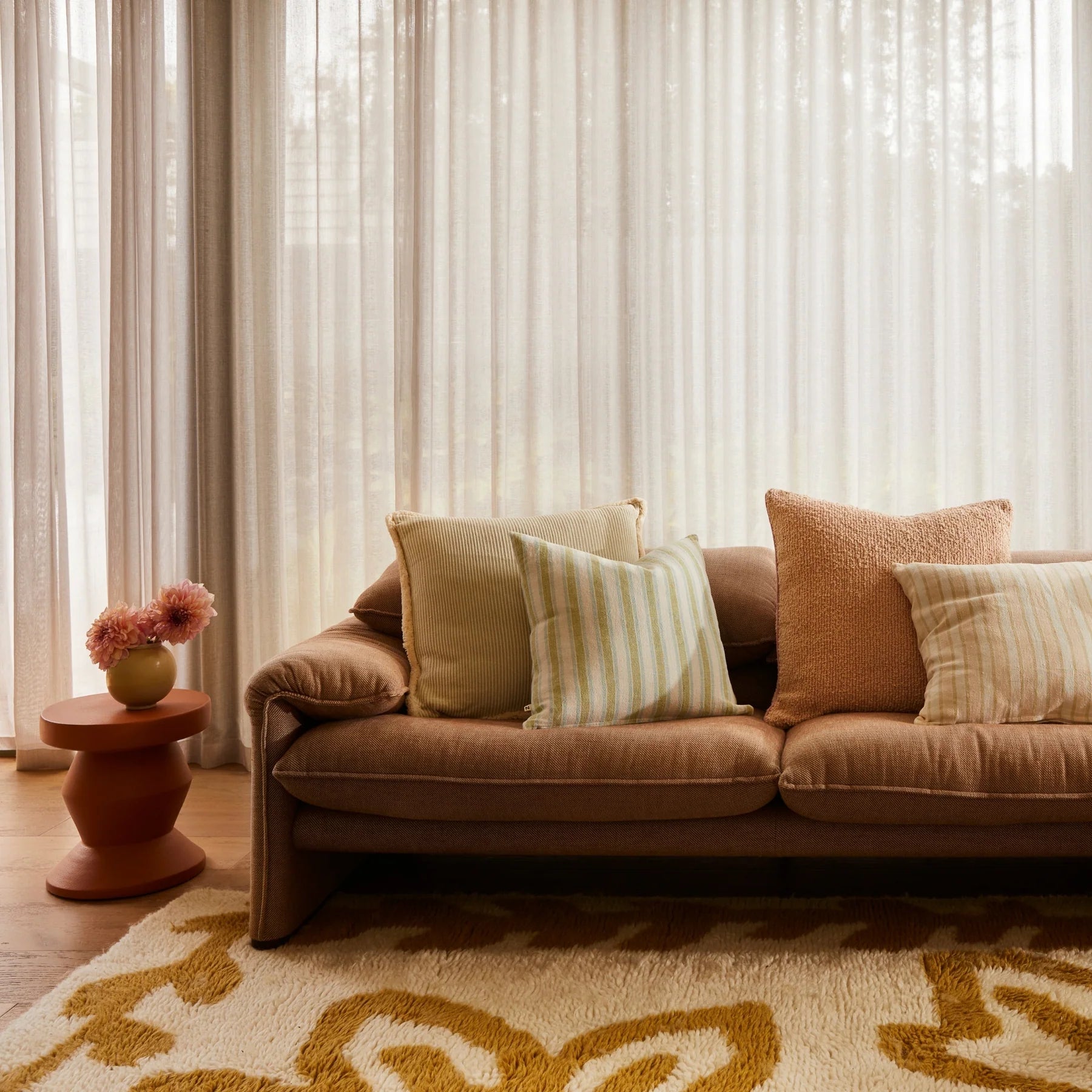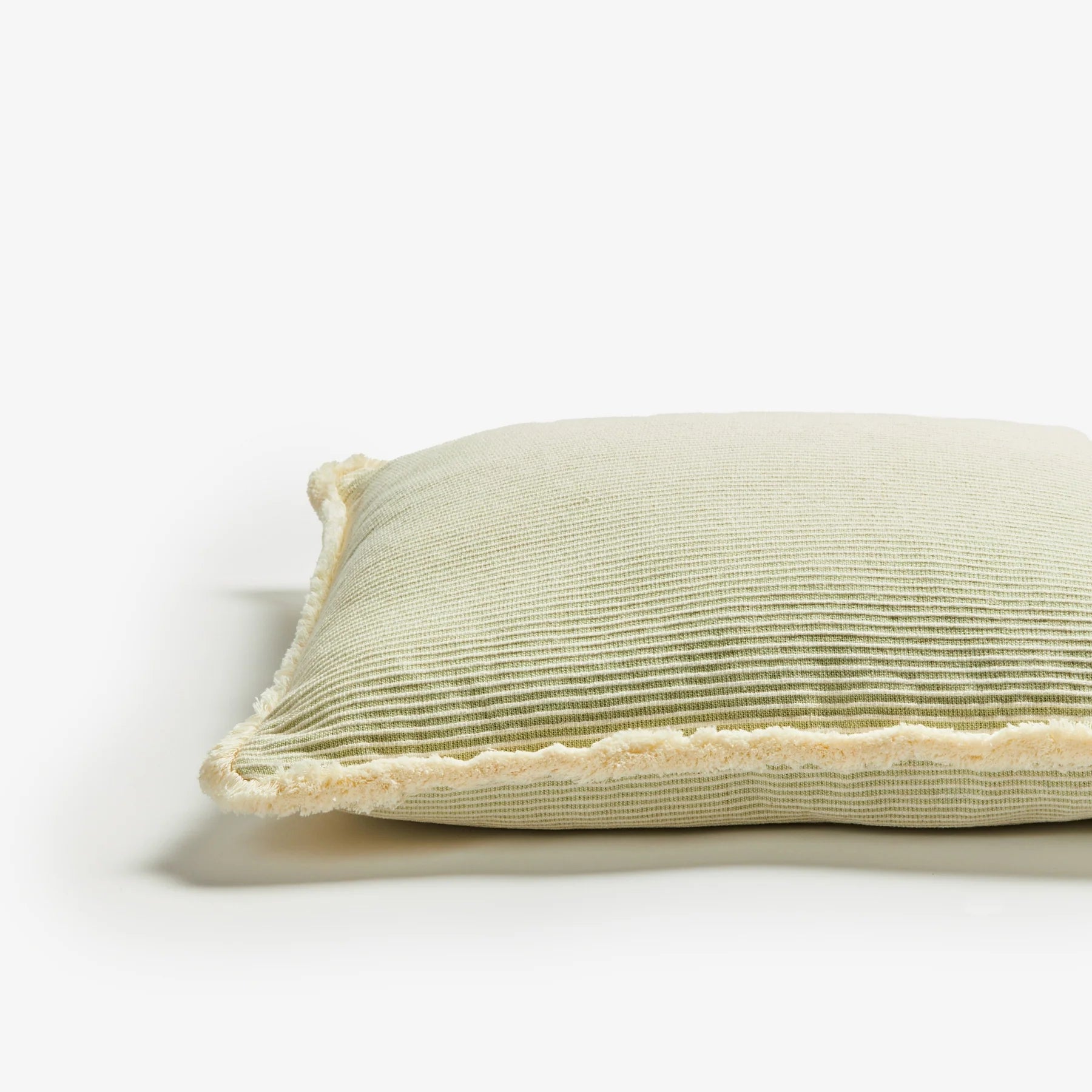 Your new season must-have, our Nile Green Cushion features a raised subtle stripe and thick fluffy cream fringe. The distinctive trim adds a luxurious feel, allowing this green woven cotton cushion to stand out as a focal point or complement rich patterns and vibrant earthy tones on your sofa.