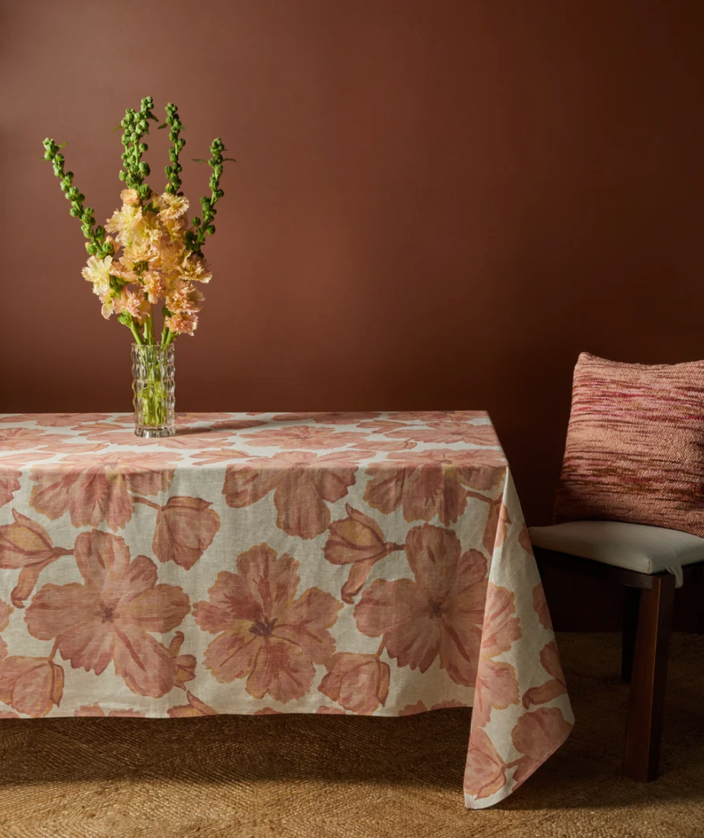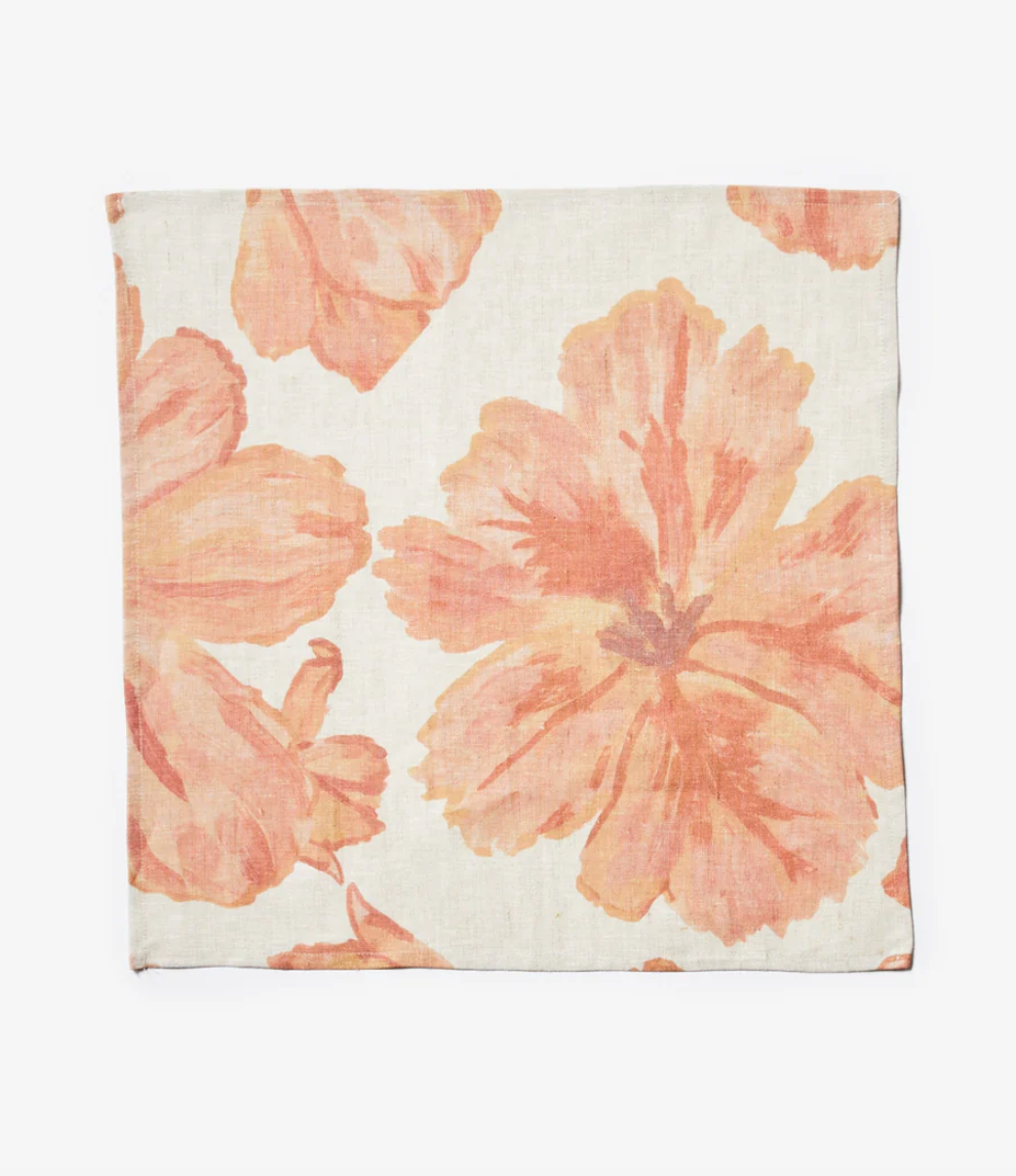 Bringing bold beauty and vintage charm to your dining space, our Tulip Pale Pink Table Linen showcases the dramatic elegance of parrot tulips in full bloom. Painted in a delicate watercolour effect, the ruffled and fringed petals dance across the fabric, capturing the graceful movement of these extraordinary flowers. The soft pink hue adds a romantic touch, while the artistic fluidity of the design ensures timeless sophistication.