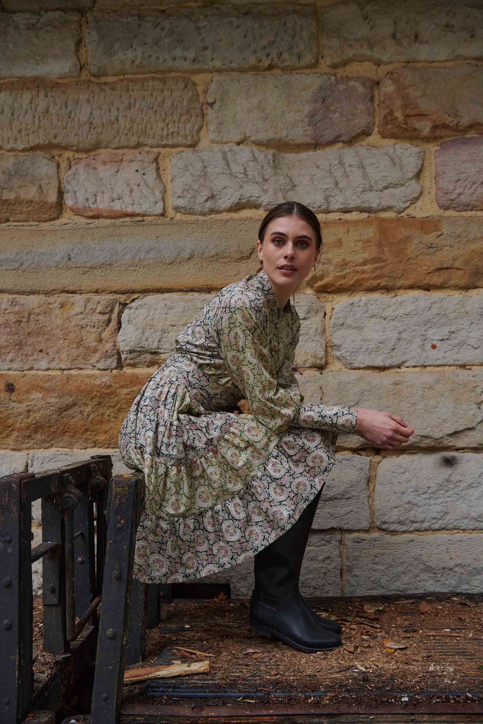 A feminine and beautiful dress crafted in a soft and durable Japanese cotton with a two tone paisley print. Subtle gathering detail on the skirt tiers form fullness and drape fluidly and flounce hem. A matching wide removeable was it tie, mandarin collar and self covered buttons. This piece is locally designed and sampled in our Haberfield Studio and handmade by our skilled makers in Sydney, Australia.