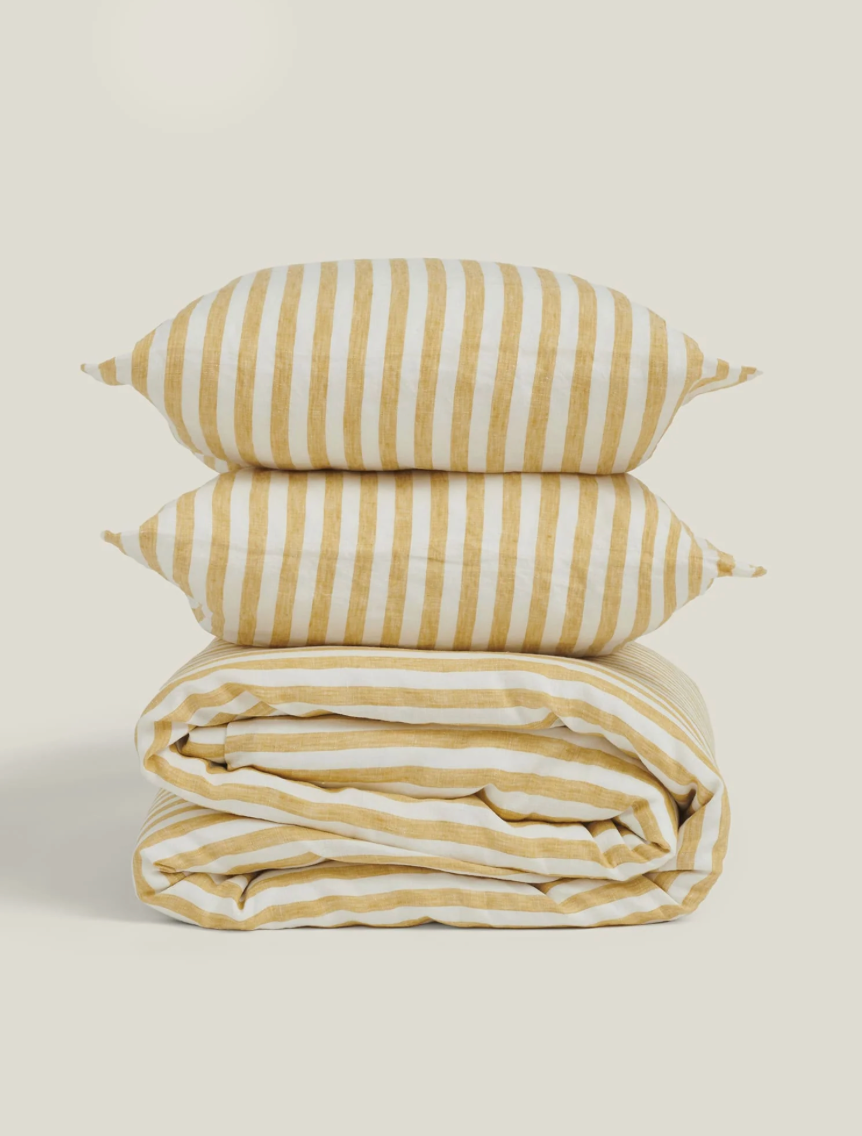 Introducing our luxurious Duvet Cover in Yellow Stripes, designed to elevate your sleeping experience. Crafted from the finest 100% French linen, our Duvet Covers are environmentally conscious and OEKO-TEX certified, which ensures sustainable and ethical production. Each cover, pre-washed with volcanic stones, offers a supremely soft feel from the first touch and gets even softer over time. The smart tie closure ensures effortless bed-making and consistent duvet placement. Perfectly weighted to regulate your body temperature, our Duvet Cover promises cozy warmth in winter and cool comfort in summer. It is delivered in a complimentary reusable linen bag, embodying our commitment to quality and sustainability.