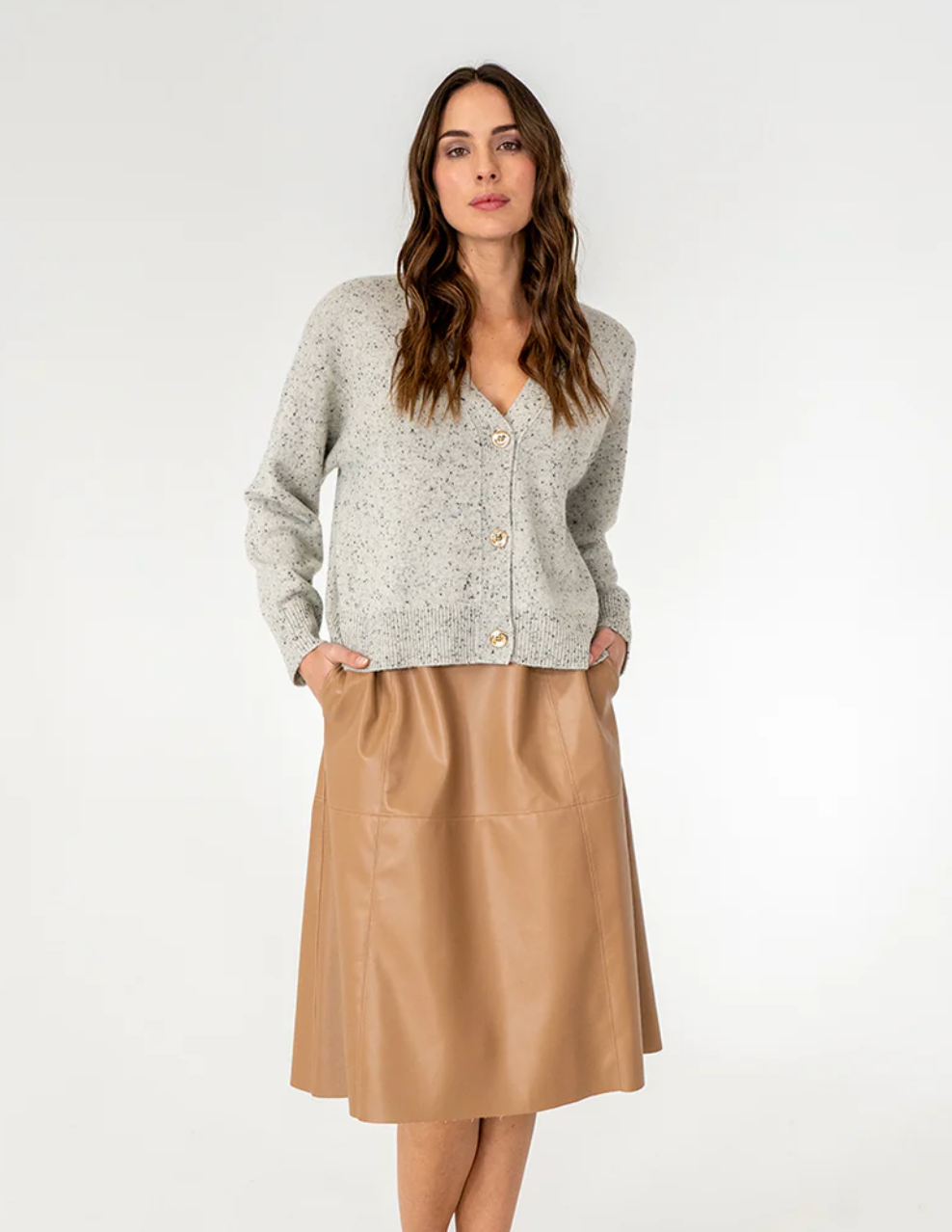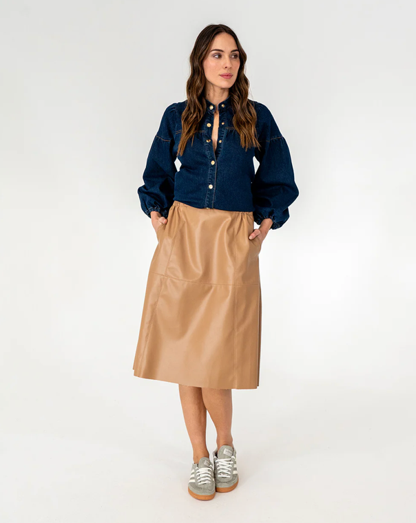 Modern and versatile, the Cooper Row Skirt is crafted from 100% PU faux leather with a soft viscose backing, offering a luxe look with a comfortable feel. Designed in a flattering A-line silhouette, it features a gathered waist that can be worn high on the waist or lower on the hips for a relaxed vibe. Functional side pockets add practicality, while the raw hem lends a contemporary edge. Style it with a tucked-in knit for a polished look or a casual tee for effortless chic.
