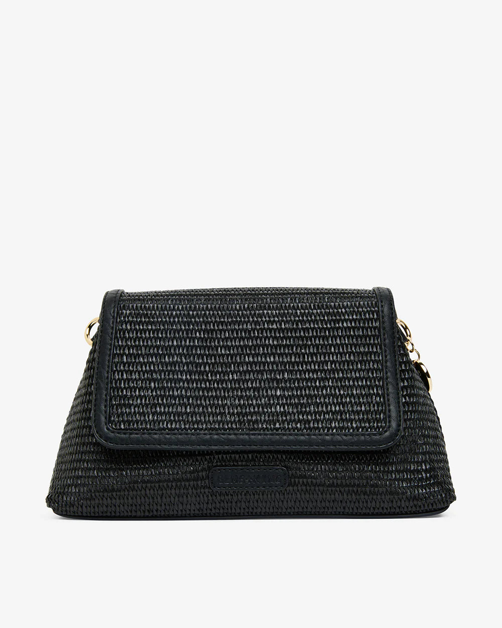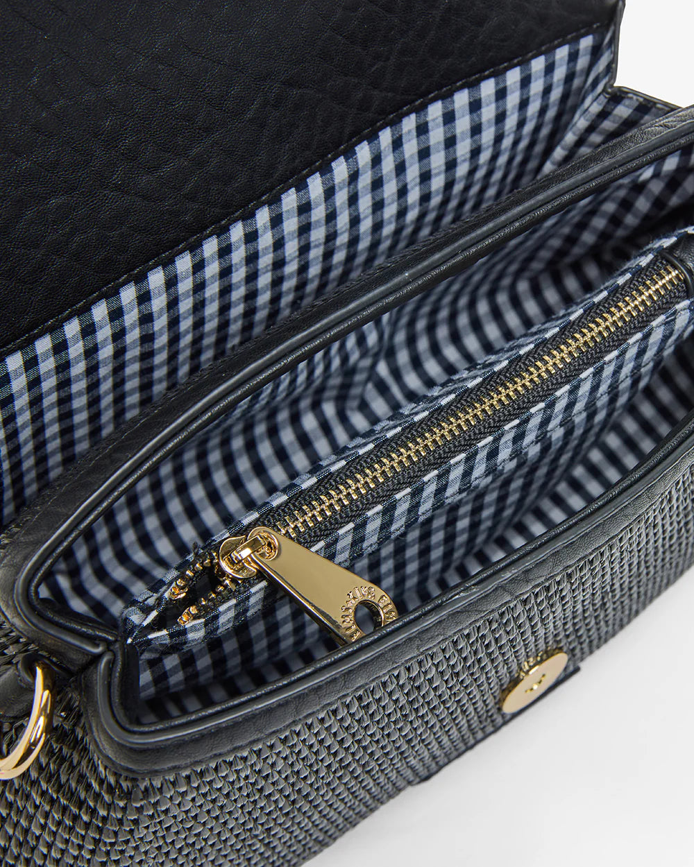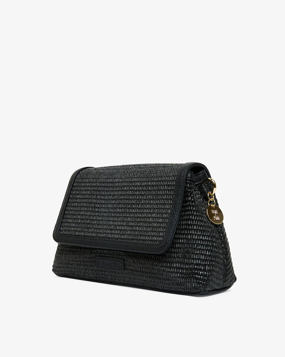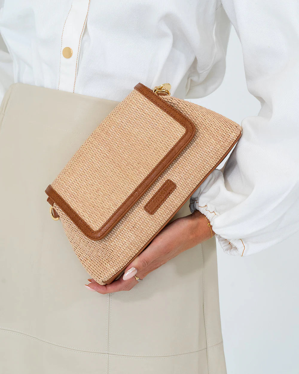 The Elms+King Lugano Crossbody is made from premium 100% recycled polyurethane, paired with woven polystraw and features the signature Elms+King blue & white gingham lining. The Lugano is a compact bag that features an adjustable and removable crossbody strap. The centre compartment is secured with a mag closure and opens to reveal three slip compartments and zipper pocket.
