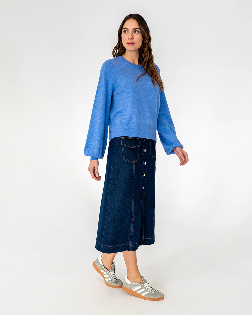 This versatile piece features a crew neckline and blouson sleeves that add a touch of flattering volume, while ribbed trims provide a refined finish. The stepped hem with side splits enhances its layering potential, allowing it to be worn loose or tucked in for effortless styling. Whether paired with tailored trousers or relaxed denim, the Whistler Knit is a wardrobe staple that transitions seamlessly between seasons and occasions.