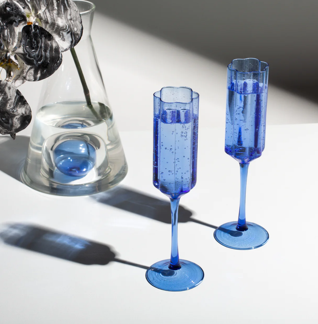 Our Wave Flutes come in sets of 2 and are made from high-quality borosilicate glass.