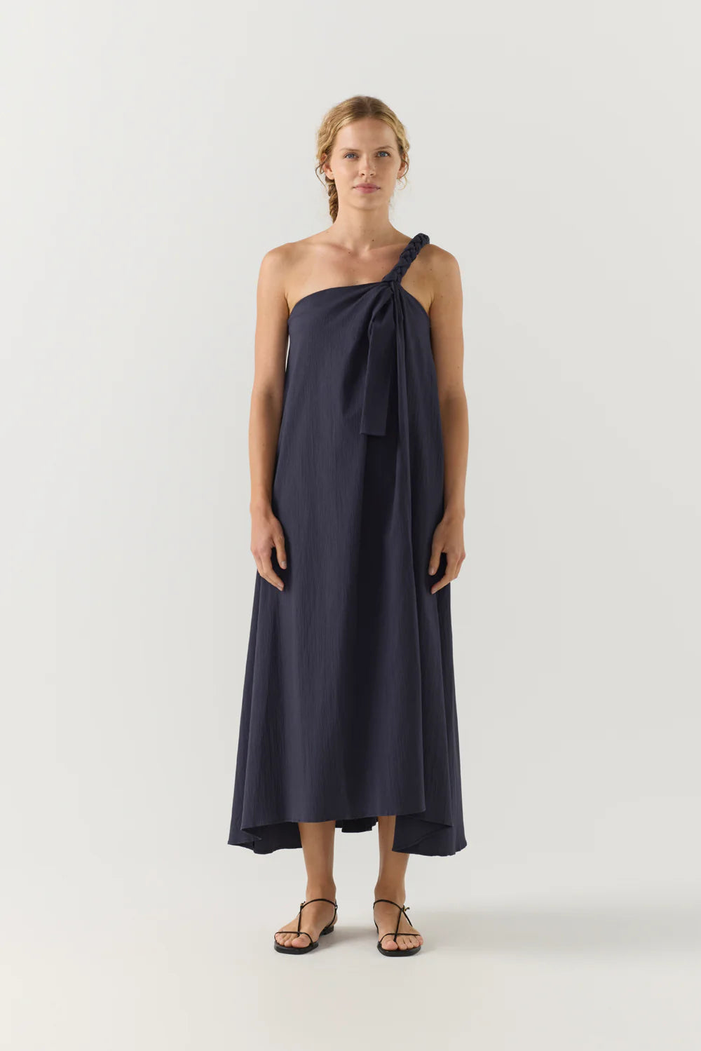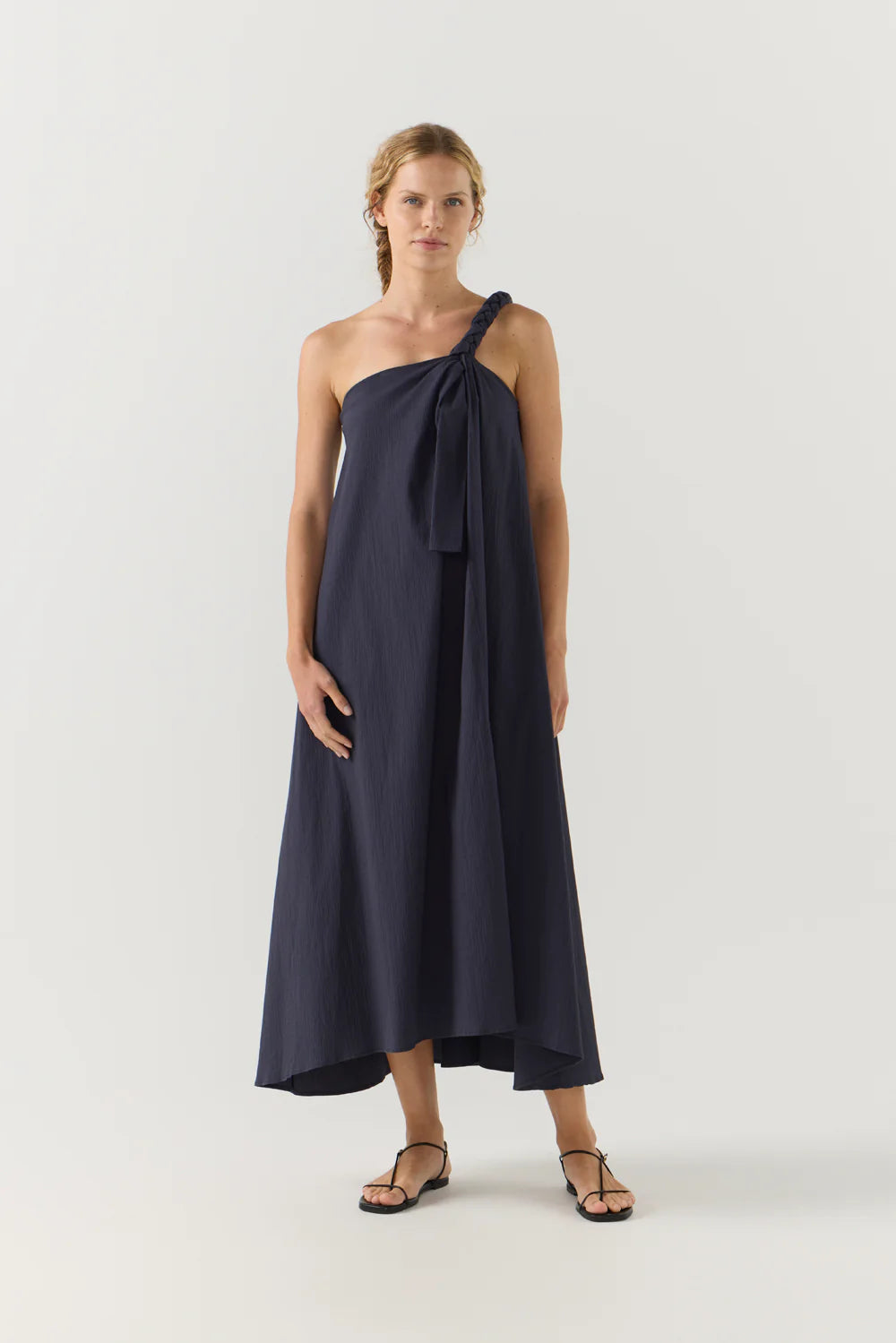 An exercise in asymmetry and ease, the Aria Dress is designed with an artful high-low hem that enhances fluidity. Crafted from crisp textured cotton seersucker, it offers structure with a sense of softness. A plaited one-shoulder strap adds subtle intricacy to the clean, minimal silhouette, while the gently draped shape allows for effortless wear from day to evening.