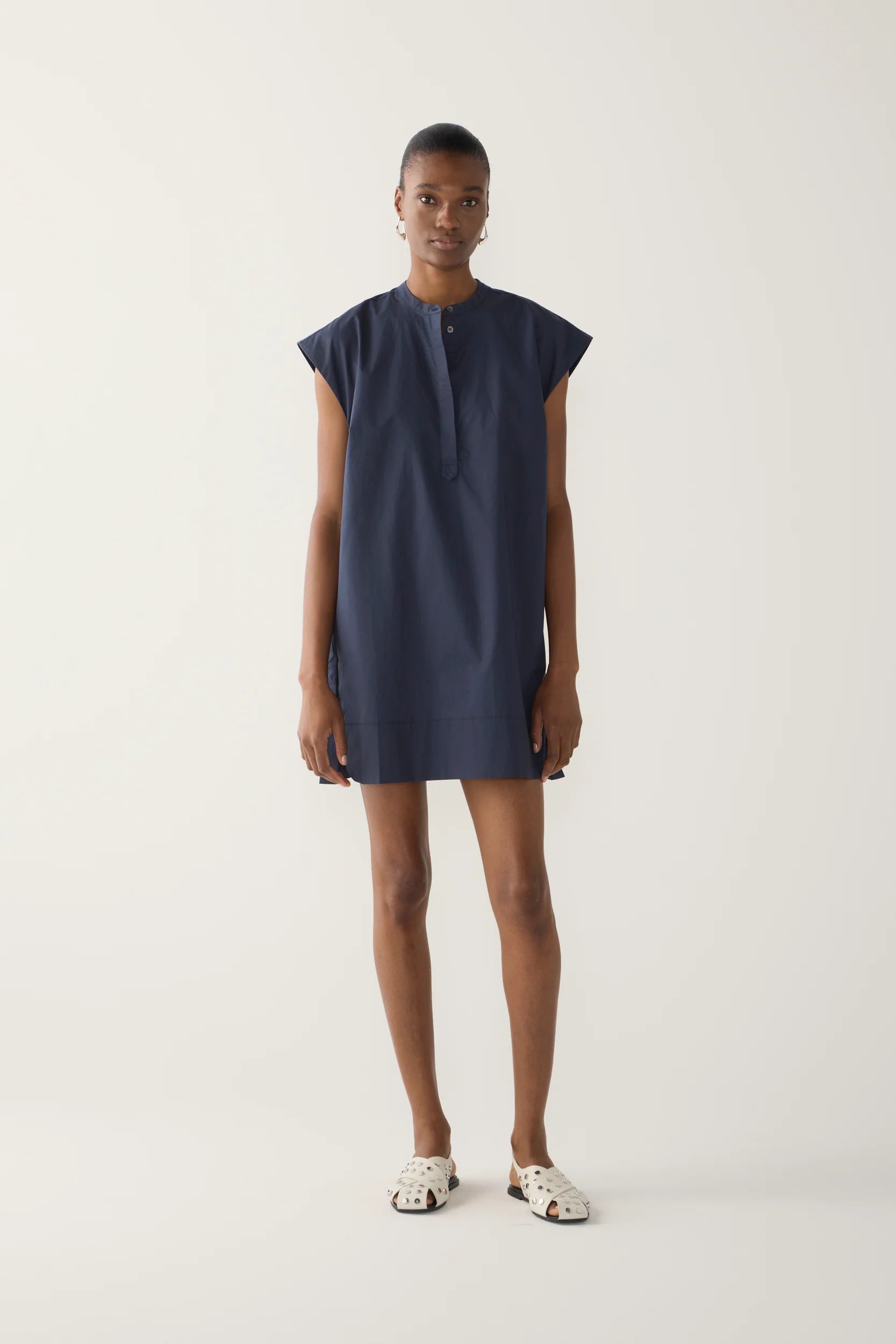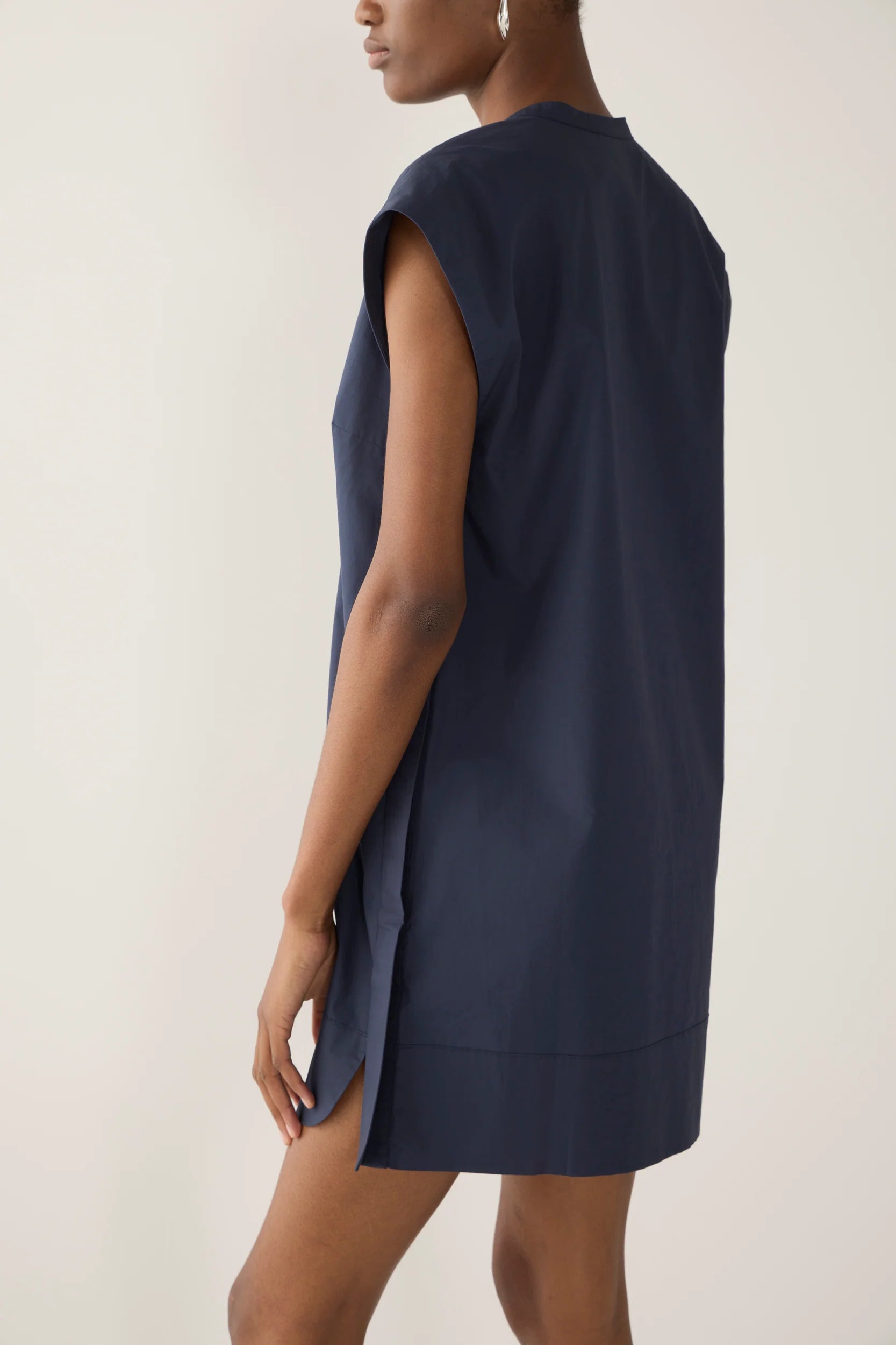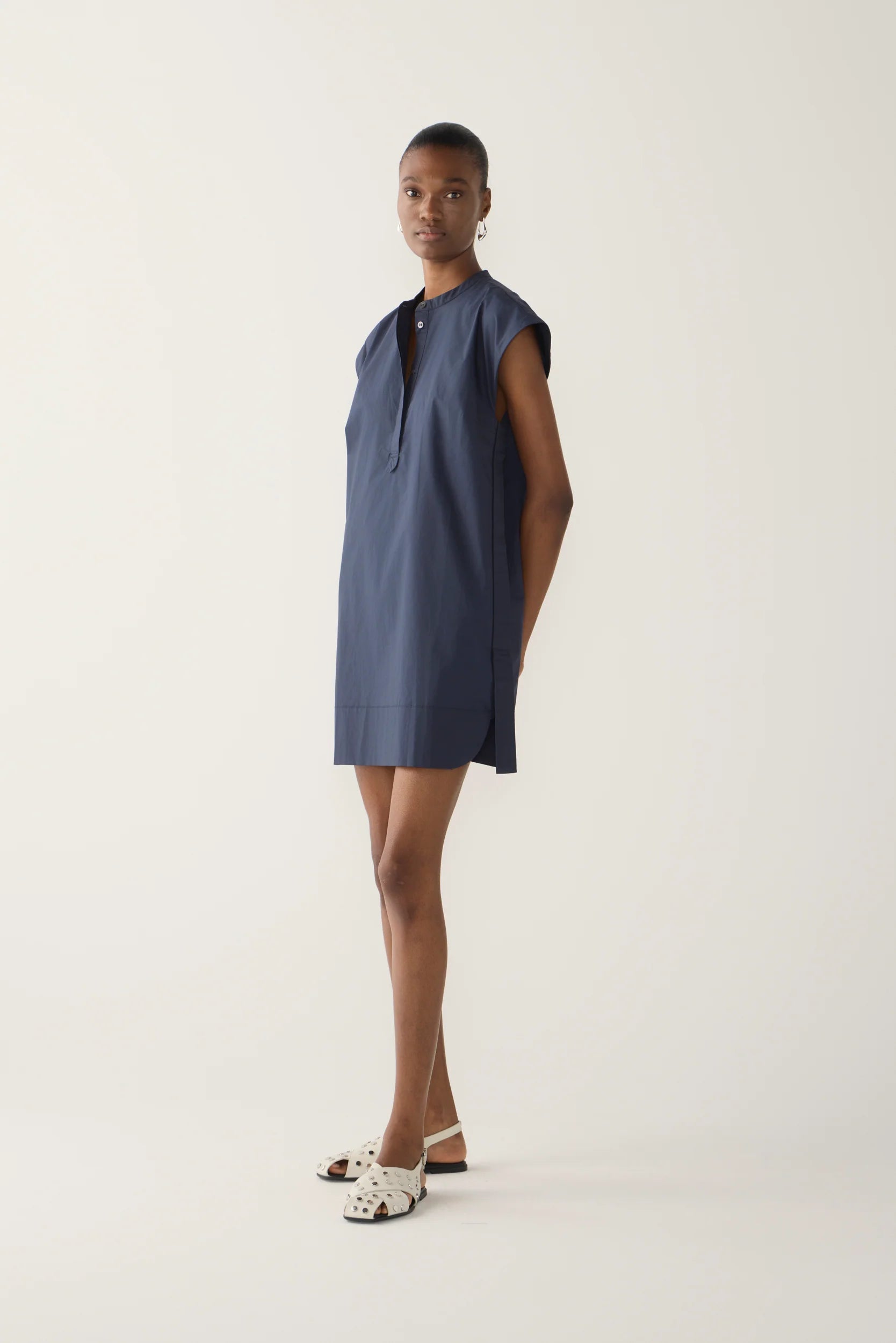 A minimal exploration of proportion and silhouette, the Gia Dress embraces a sculptural sensibility. Crafted in crisp cotton poplin, this mini dress features a batwing sleeve and a deep hemline that curves subtly at the front. A concealed side placket and straight back hem add architectural clarity, while side seam splits enhance ease of movement. A versatile piece that balances structure with lightness.