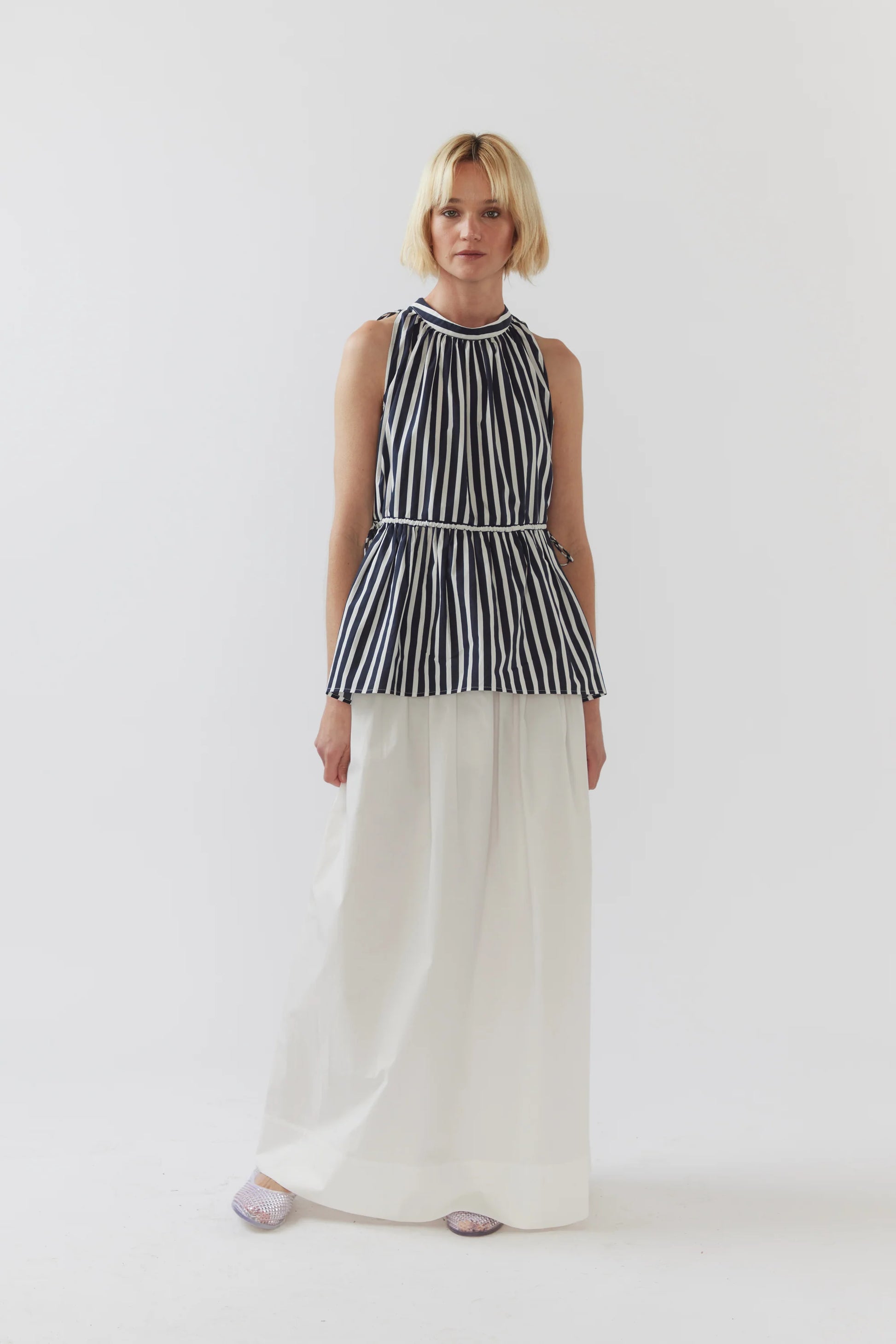 The high neck offers a refined, structured look, while the unique overlap detail on the shoulder adds an unexpected, architectural touch. A drawcord waist allows for an adjustable fit, while the scalloped hem introduces a playful, feminine element.