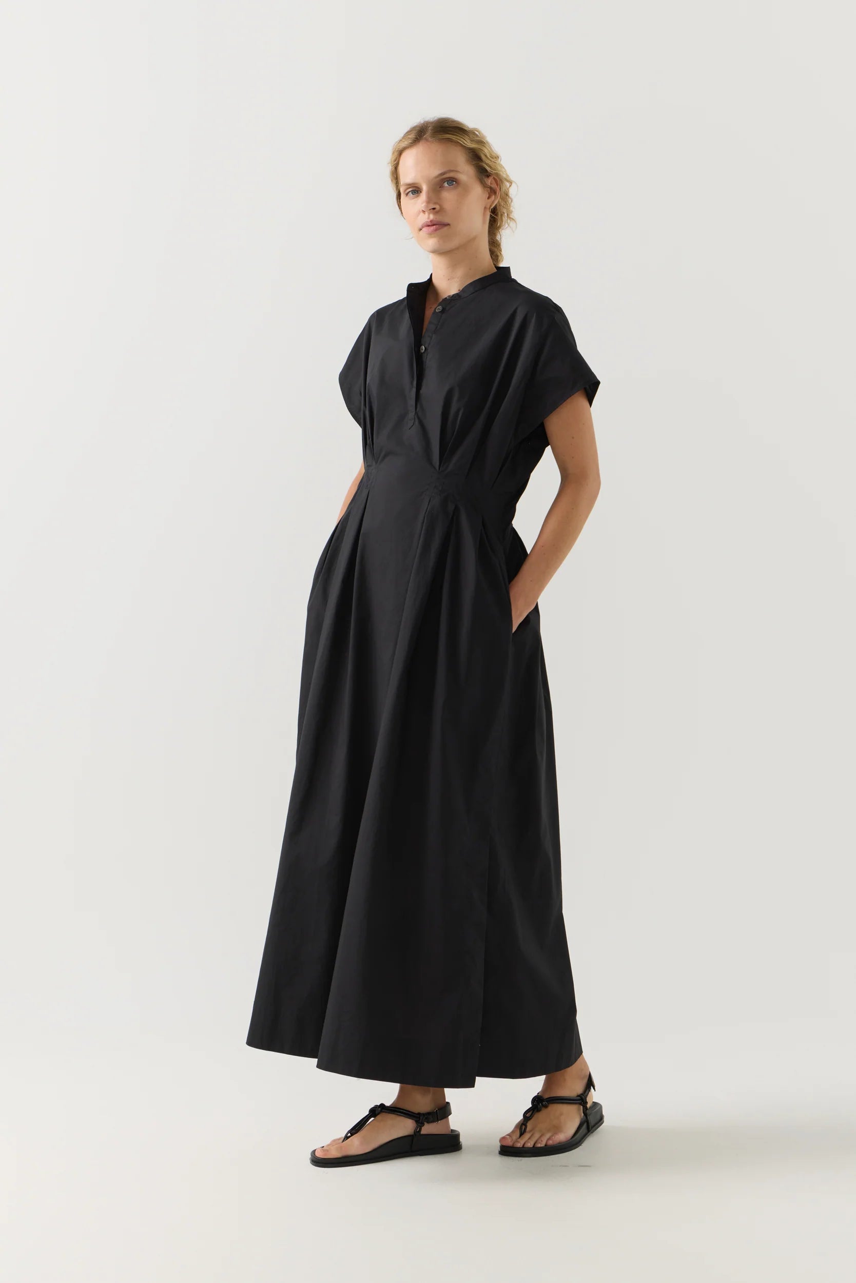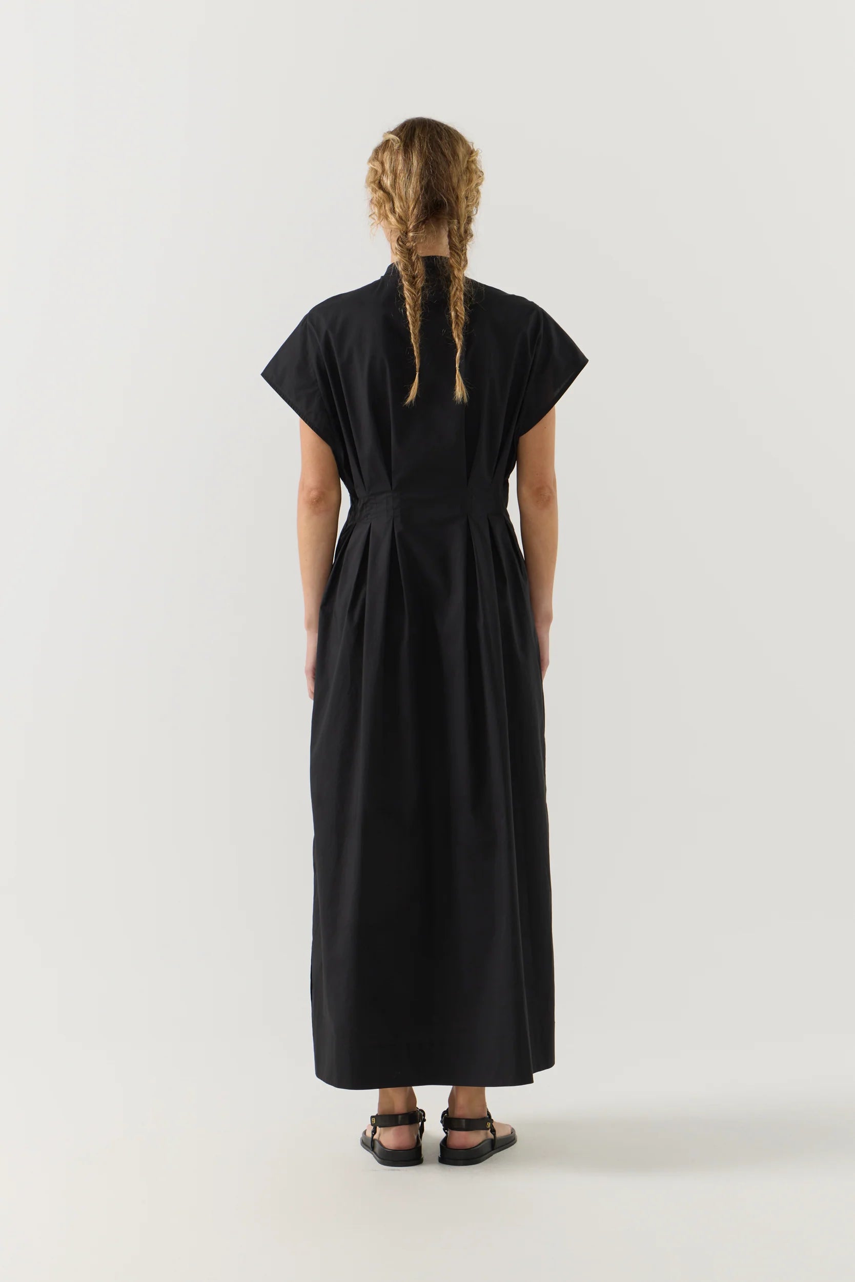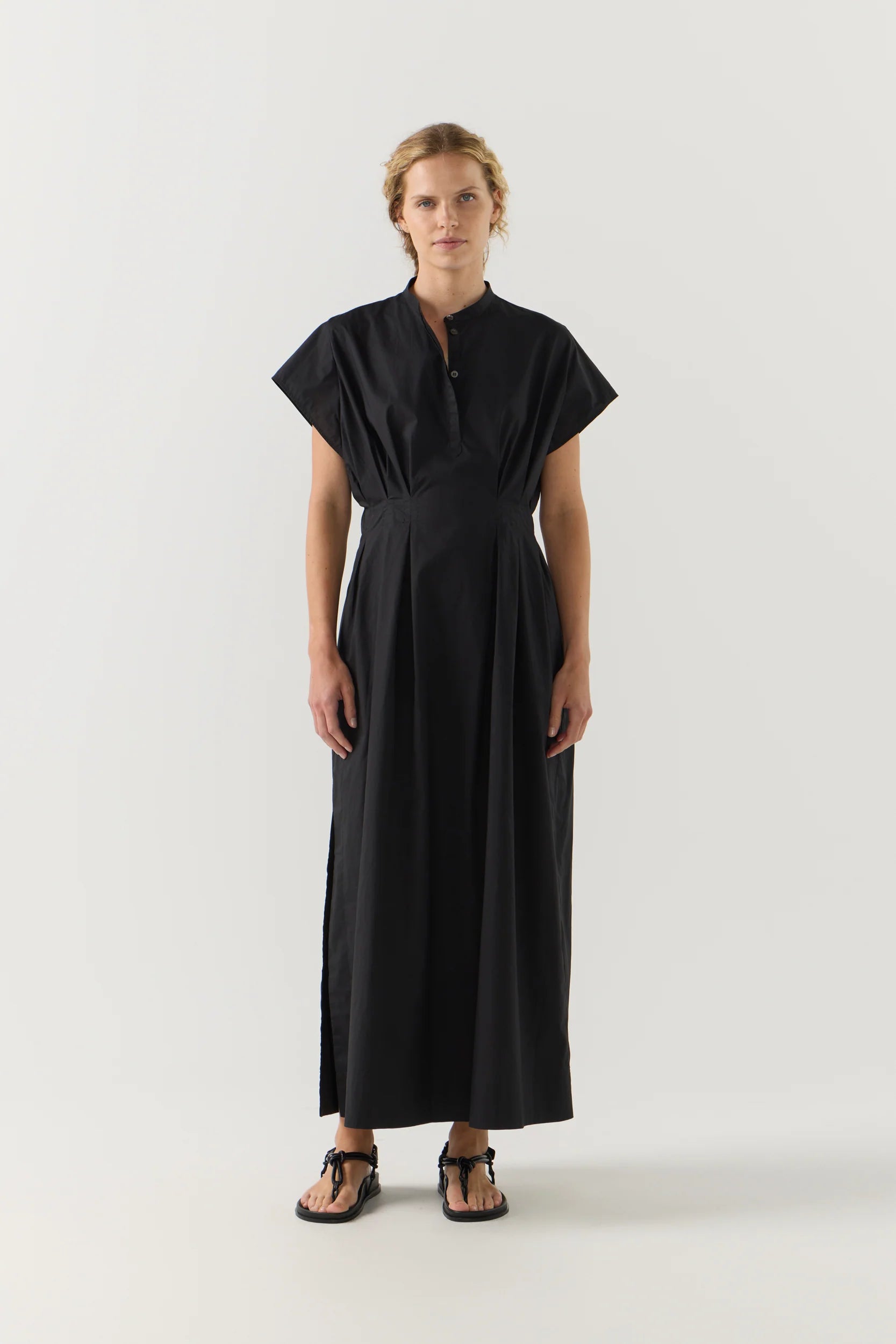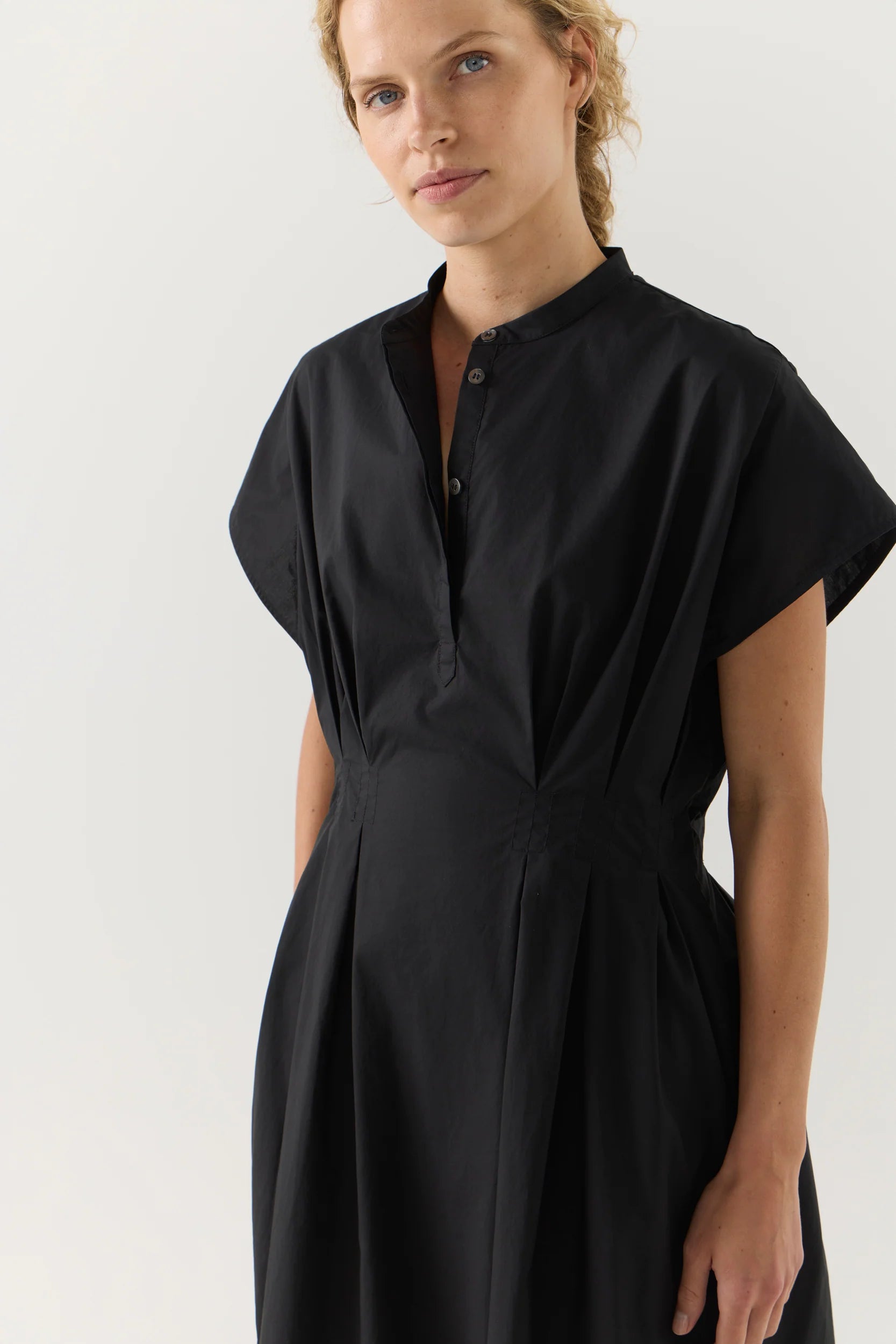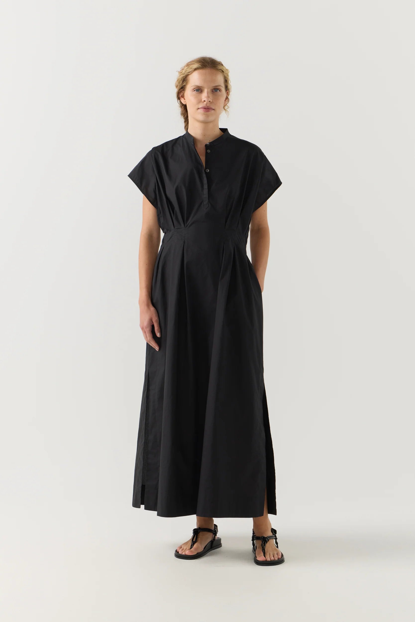 Defined by its soft structure and fluid lines, the Mika Dress features a sculptural silhouette shaped by cleverly placed pleats that radiate from the waist. A short stand collar and concealed placket lend a refined, minimal finish, while wide sleeves and side splits add ease and movement to this elevated everyday piece.
