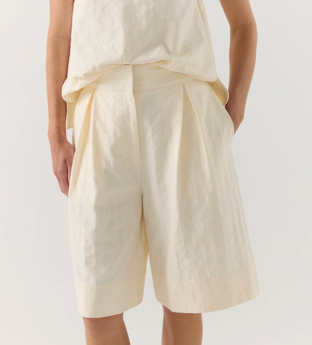 A fresh interpretation of tailored summer dressing, these mid-length shorts are cut from cotton broderie anglaise, offering both lightness and texture. Thoughtfully designed with front pleats, side seam and back patch pockets, and a concealed zip closure, they blend structure with softness. The airy fabrication adds a feminine edge to this otherwise utilitarian silhouette, making them ideal for warm-weather ease.