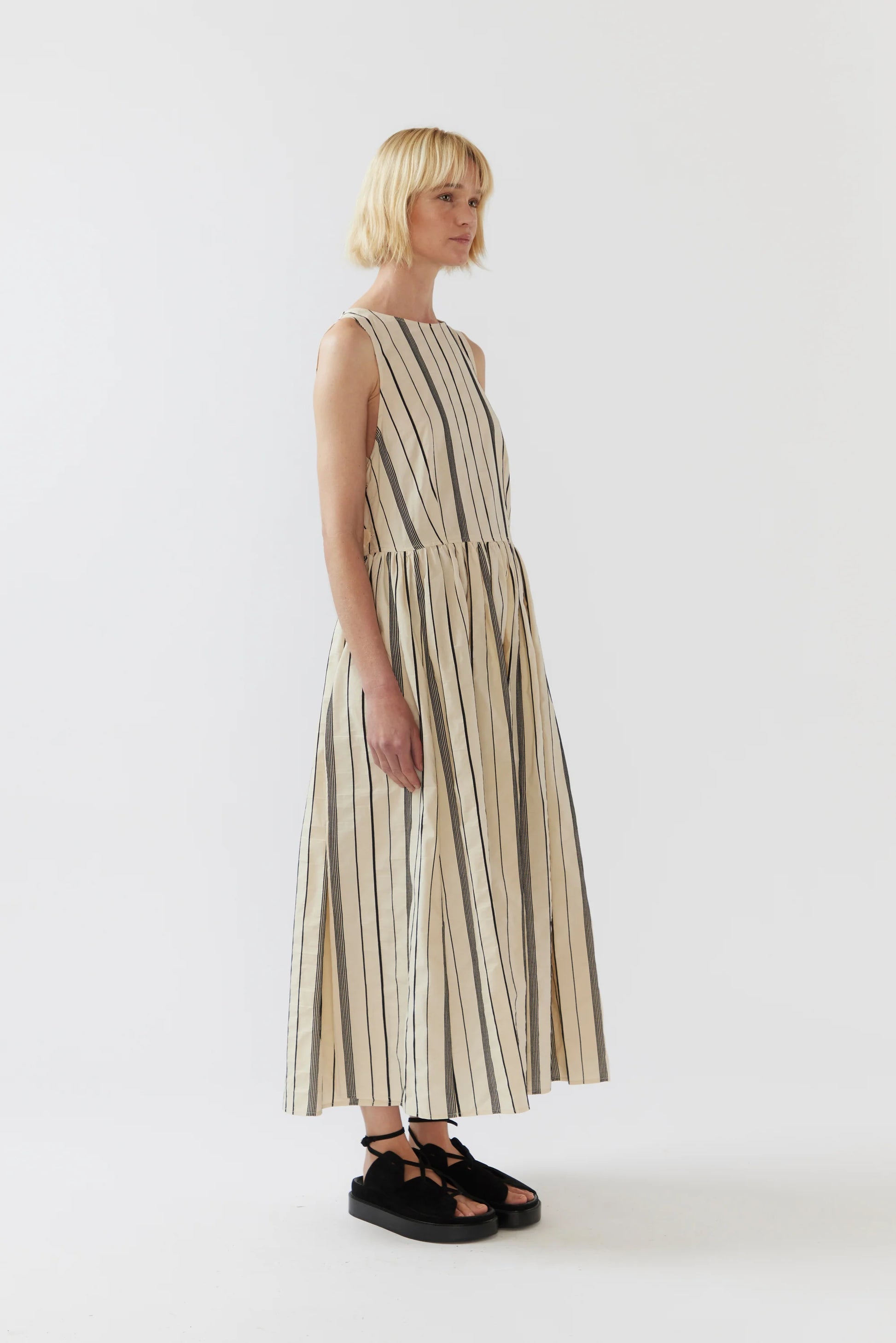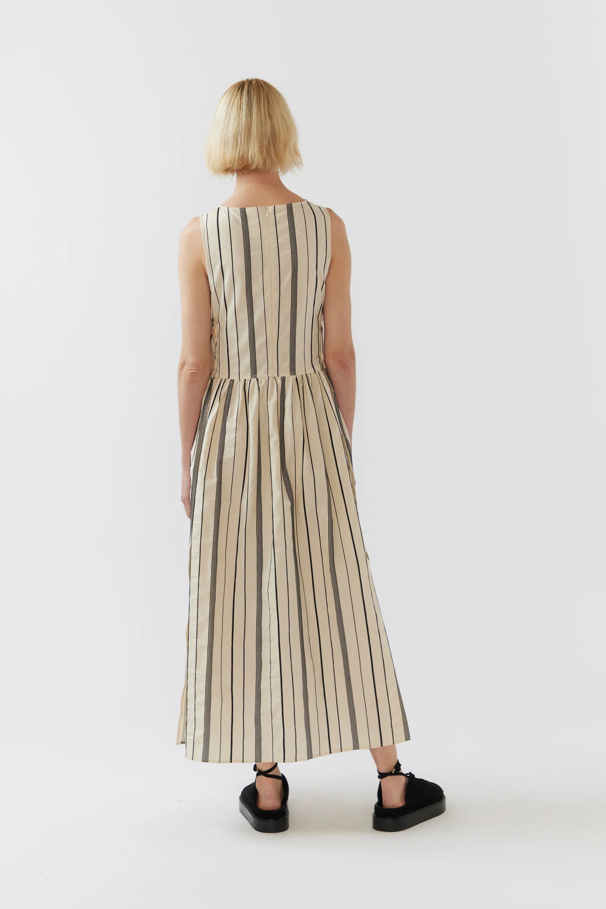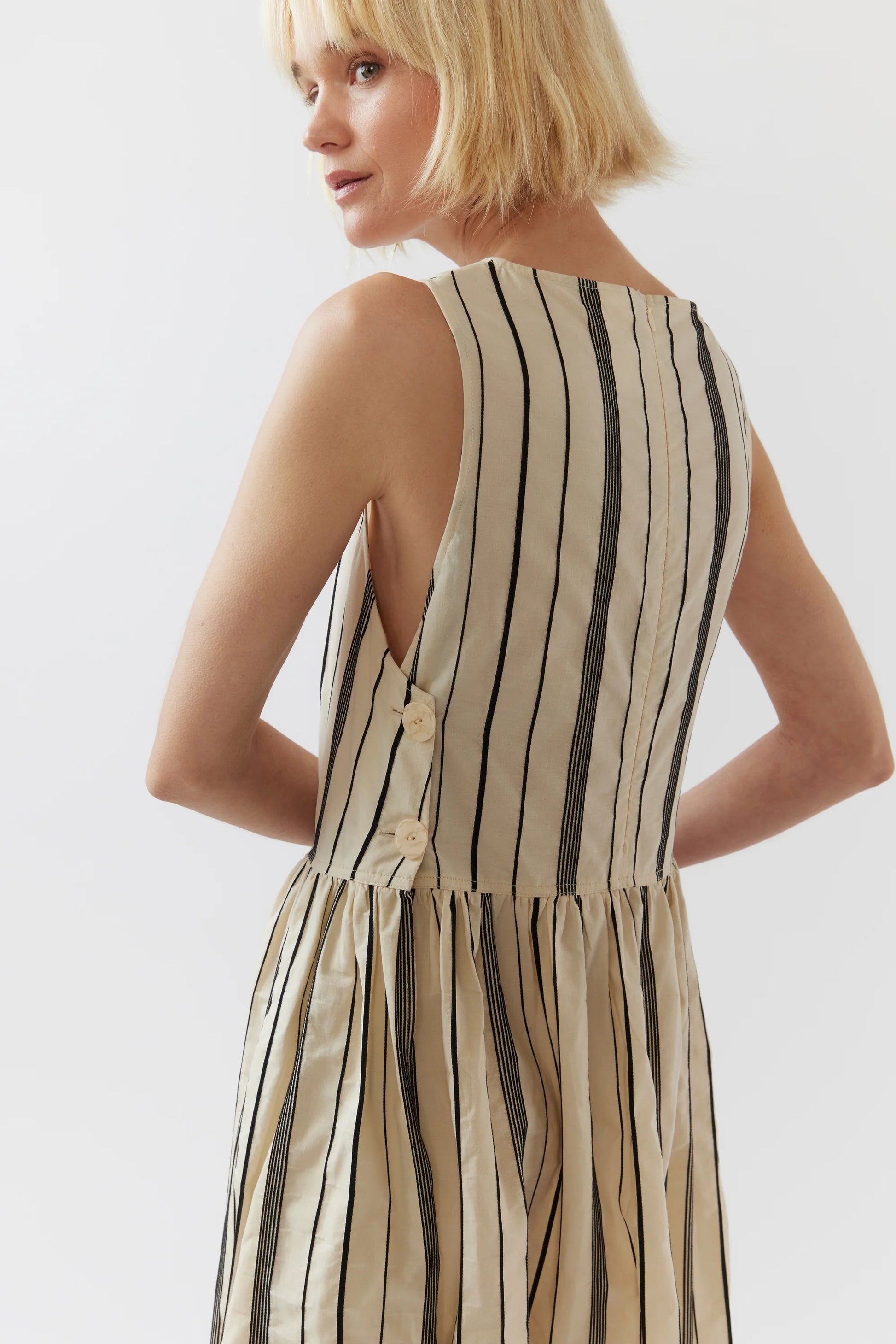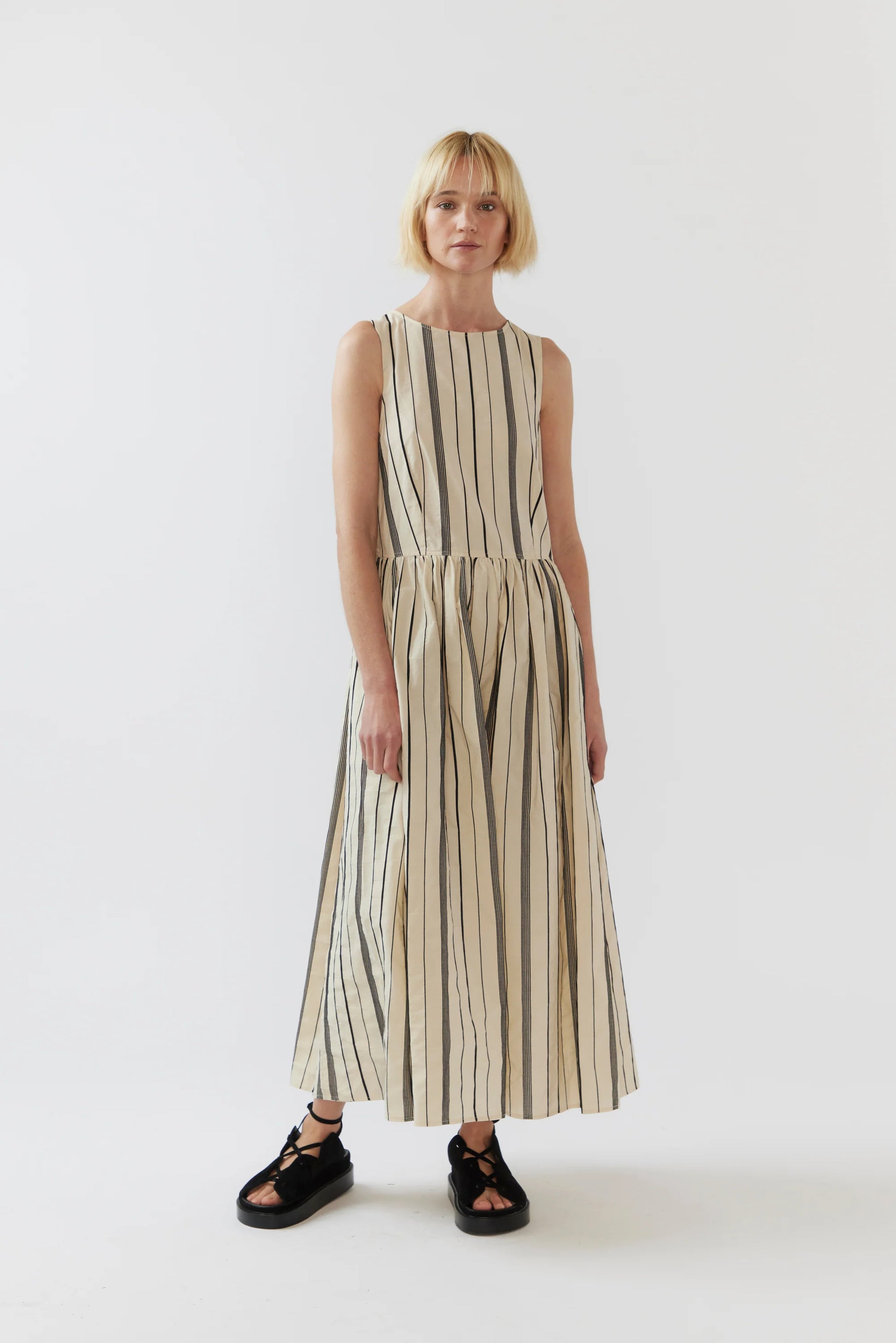 This sleeveless midi dress, crafted from a refined cotton-silk blend, effortlessly combines structure with femininity. Love the weight in this cotton linen combination and jacquard stripe. True to size.