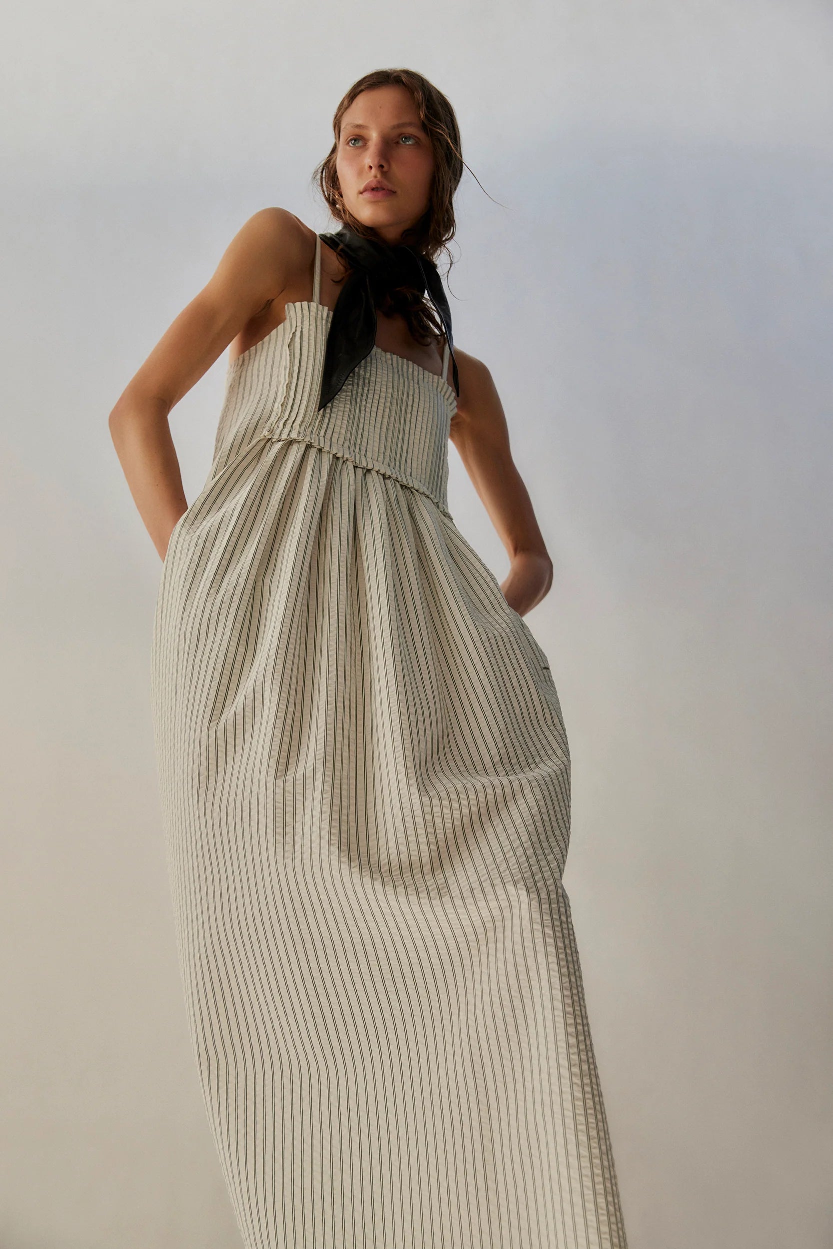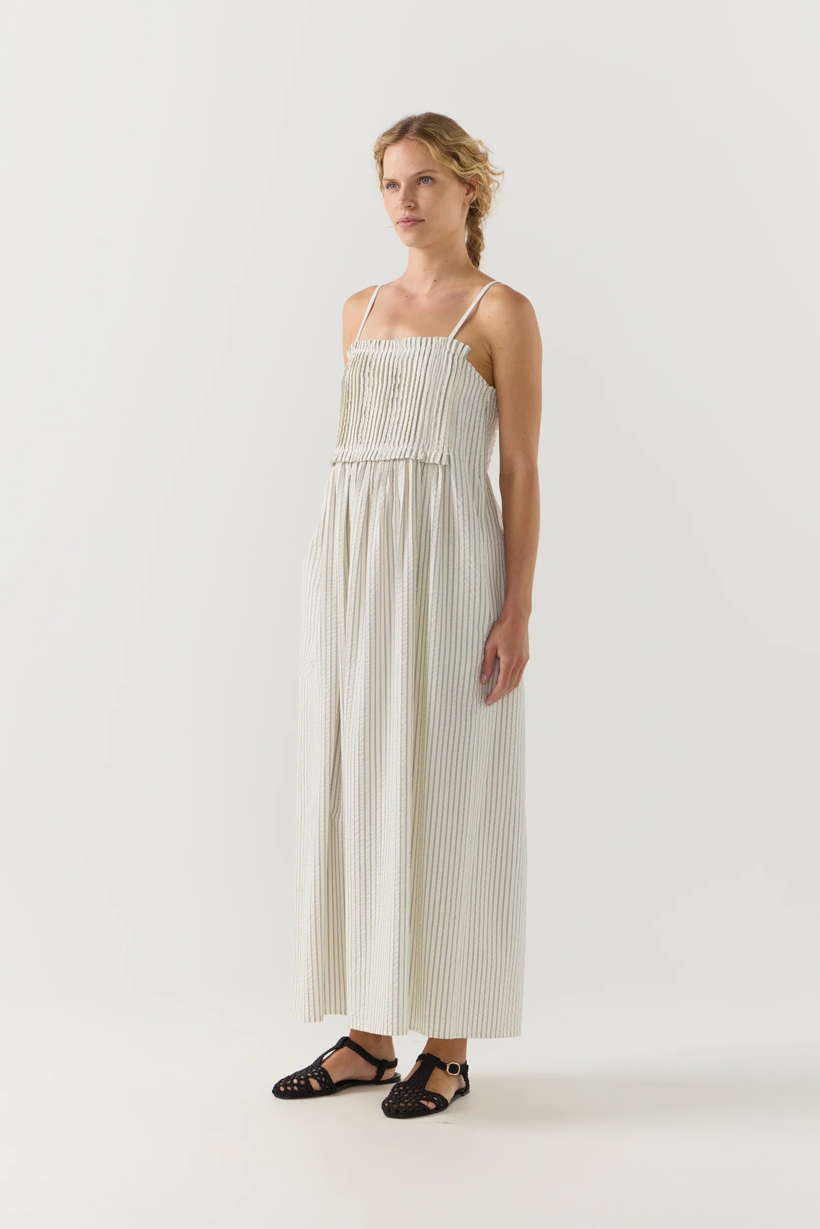 The Sloane Dress embraces structured volume and artisanal detailing in equal measure. Designed with slender straps and a distinctive pleated bodice, it falls into a full-length gathered skirt that moves with ease. Side seam pockets enhance its practicality, making this a bold yet feminine statement piece.