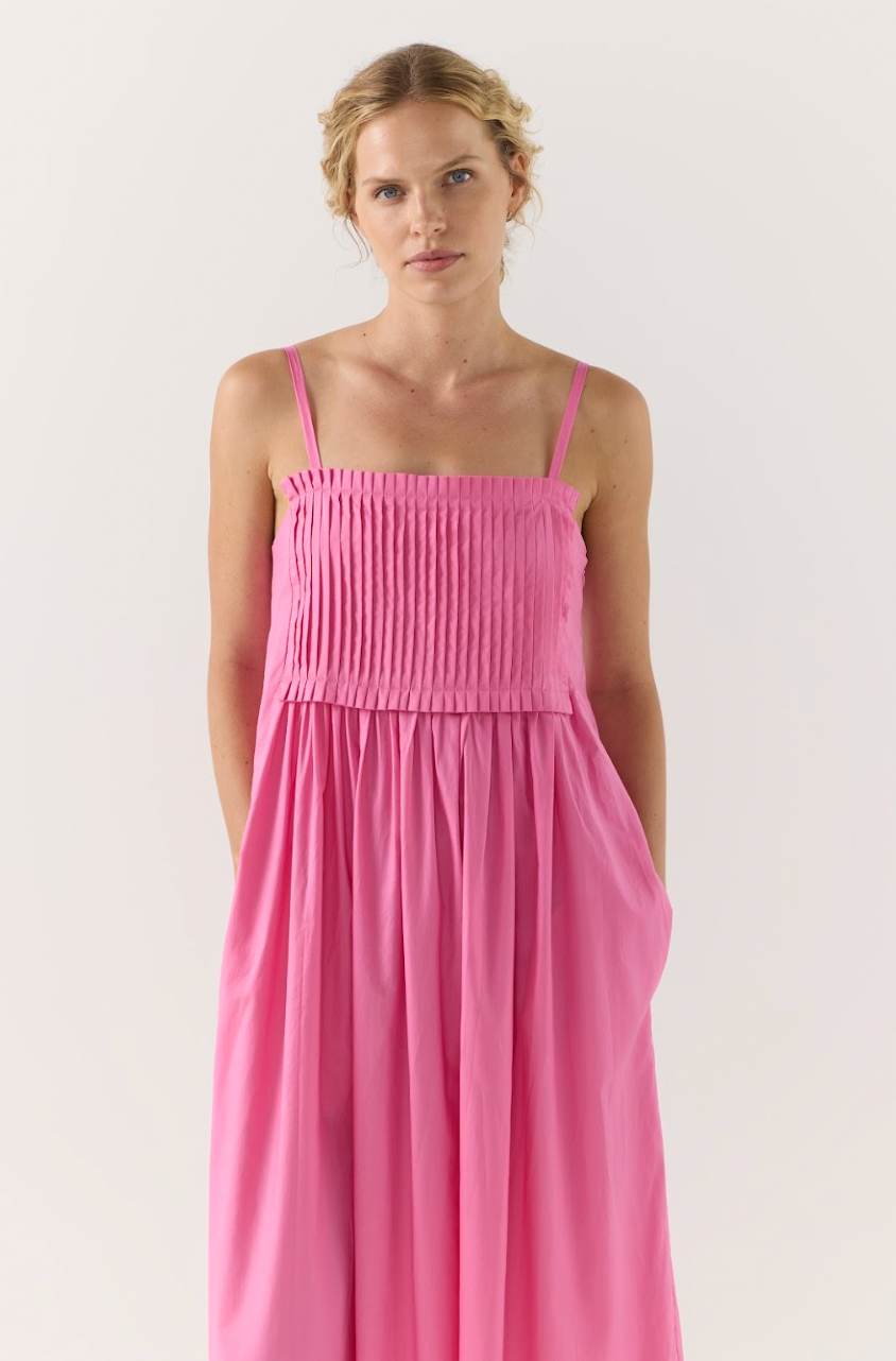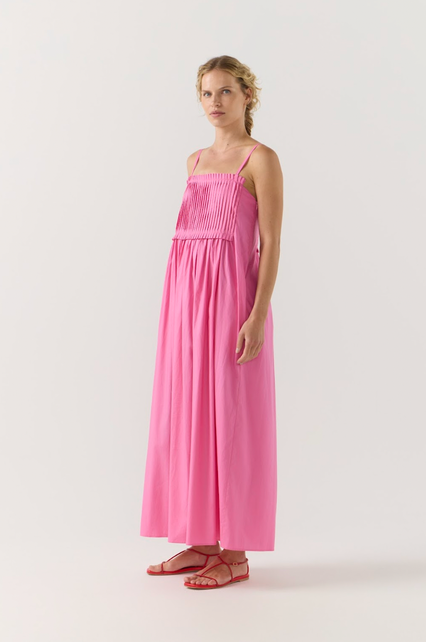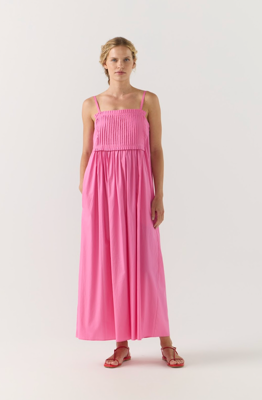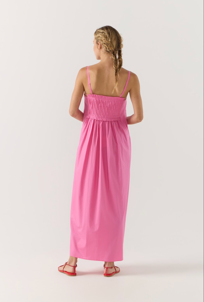 The Sloane Dress embraces structured volume and artisanal detailing in equal measure. Designed with slender straps and a distinctive pleated bodice, it falls into a full-length gathered skirt that moves with ease. Side seam pockets enhance its practicality, making this a bold yet feminine statement piece.