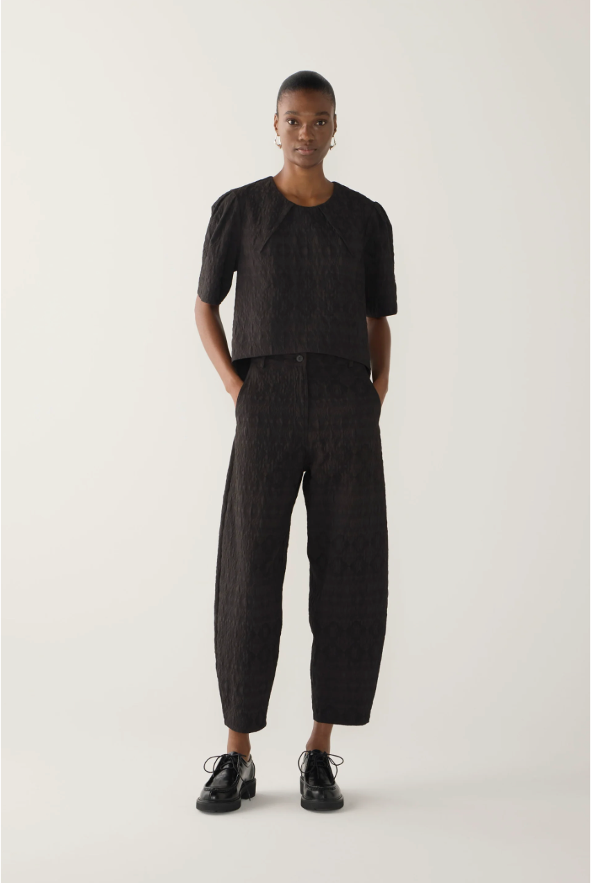 This short-sleeve top is crafted from a softly textured jacquard, offering subtle structure and depth. Thoughtfully detailed with pleats at the neckline and sleeve head, it falls to a clean high–low hem. A back split opening with an invisible zip, allows the wearer to adjust the silhouette for ease or a more sculptural finish - a refined balance of polish and modernity.