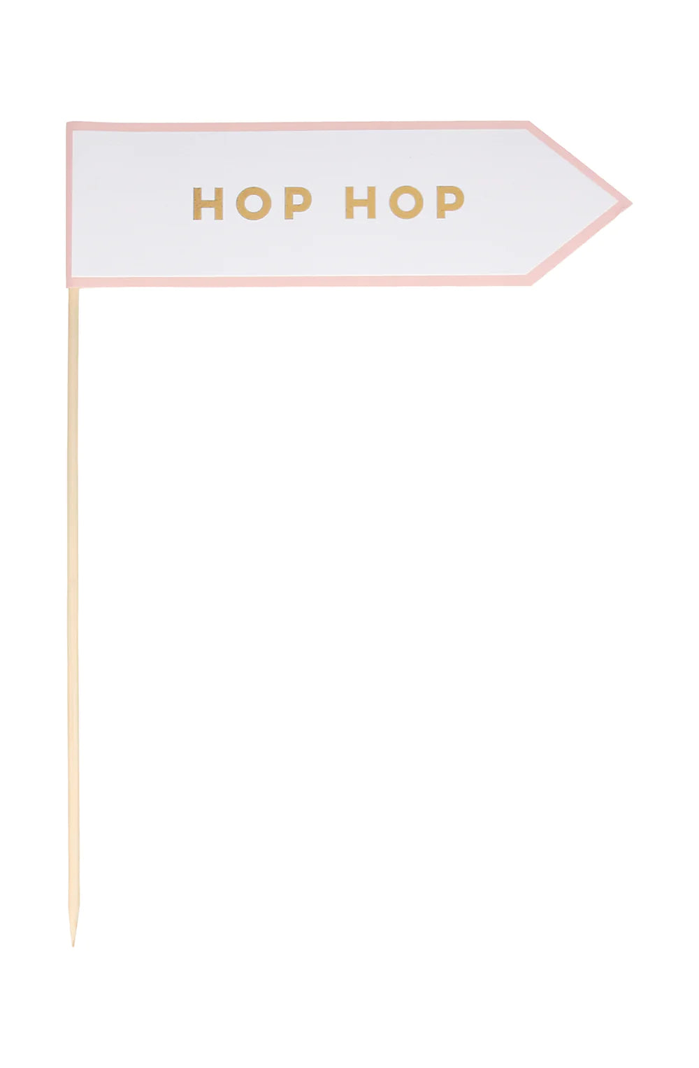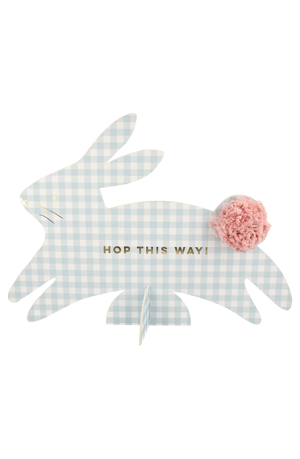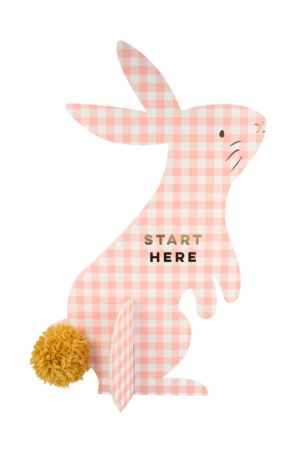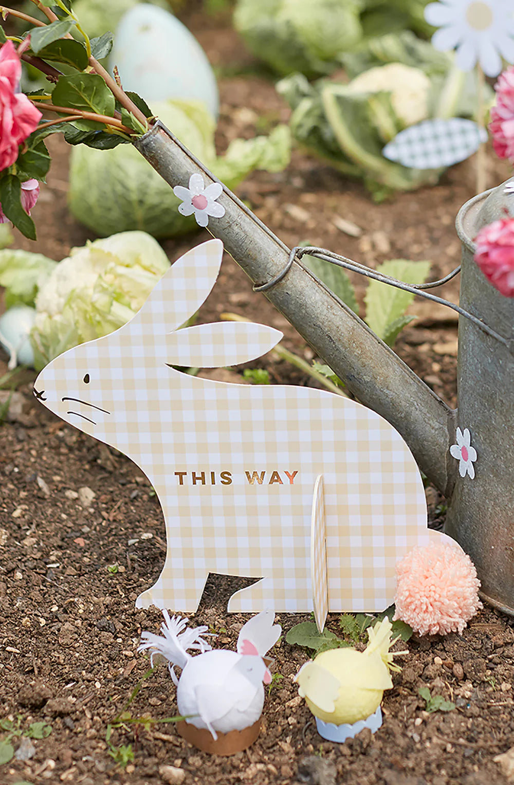 The bunnies look adorable with pompom tails in coordinating colors, Wooden skewers are attached to the signs for you to easily place them in the ground , Gold foil clues are printed on the bunnies, like “This way” and “Over here”.