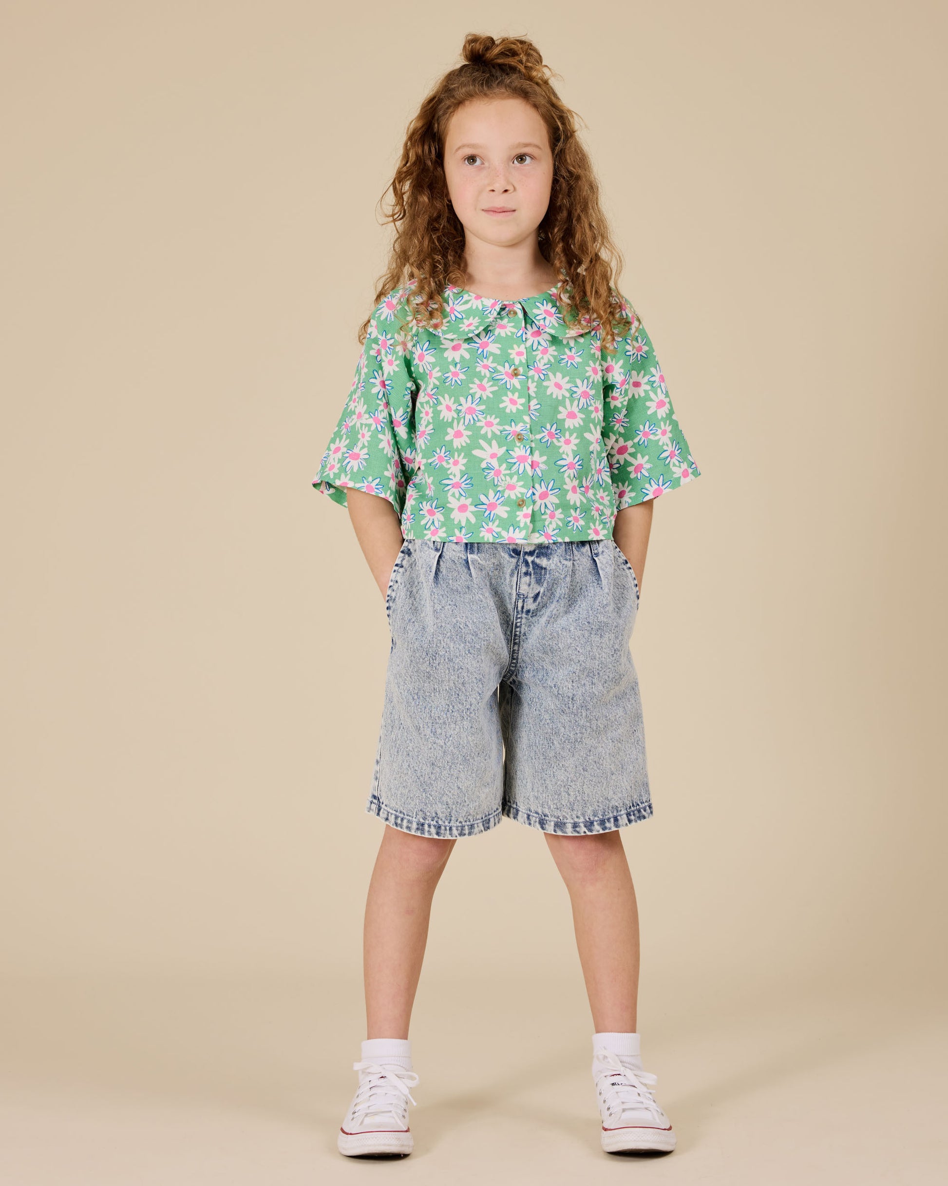 True to size. Boxy fit, button down blouse for easy dressing. Featuring an oversized collar and a hand drawn daisy print.