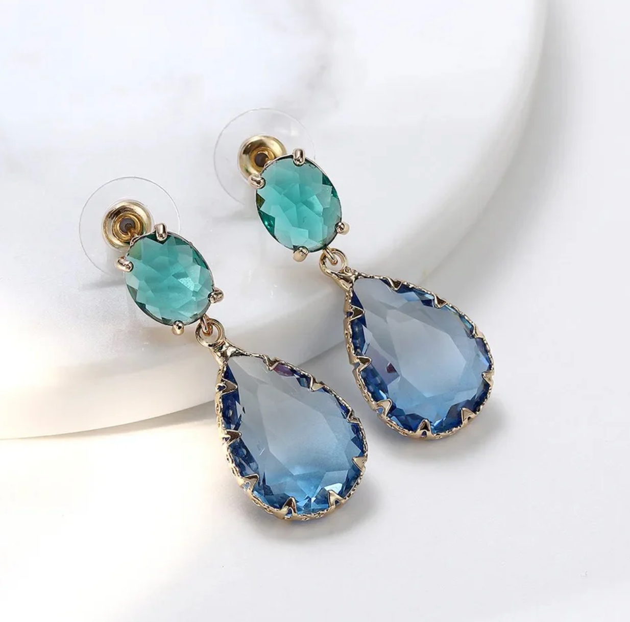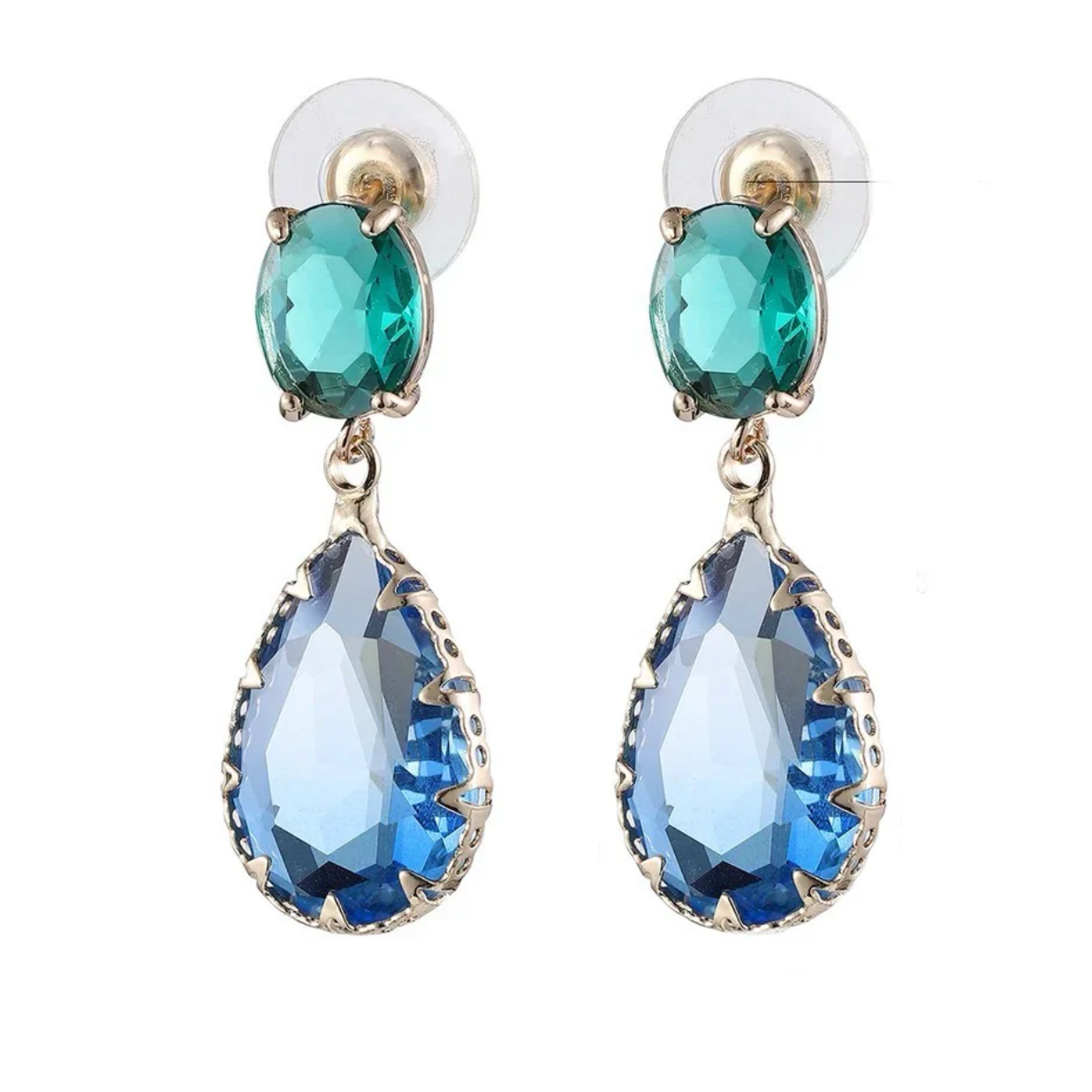 Challenge the norm with our captivating crystal earrings in shades of blue and green, proving that this daring combination is anything but taboo. Set in plated silver, these stunning earrings add a touch of classic elegance to your ensemble. Perfect for fancy occasions or a night out on the town, defy conventions and make a bold statement with this unique and stylish earrings.