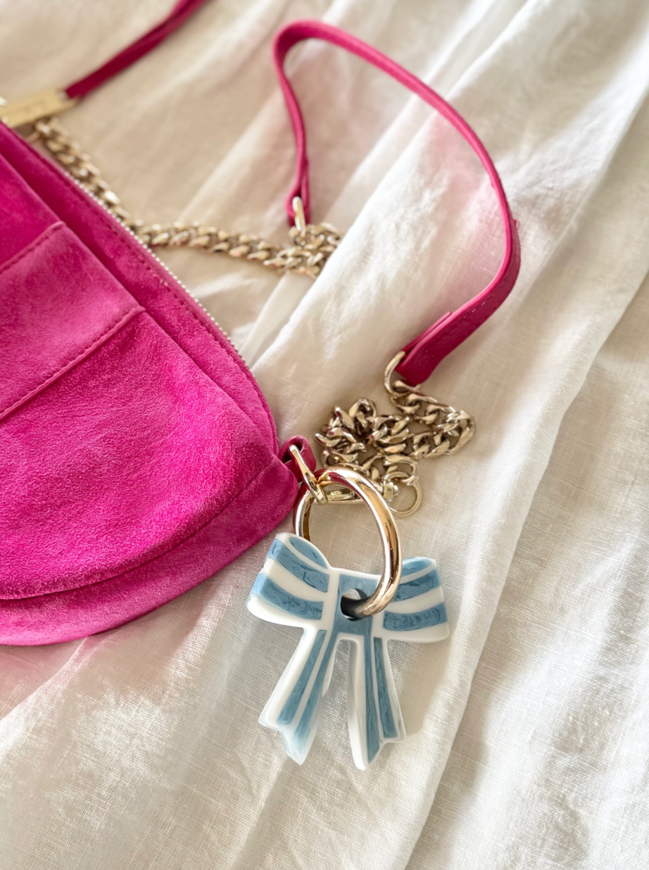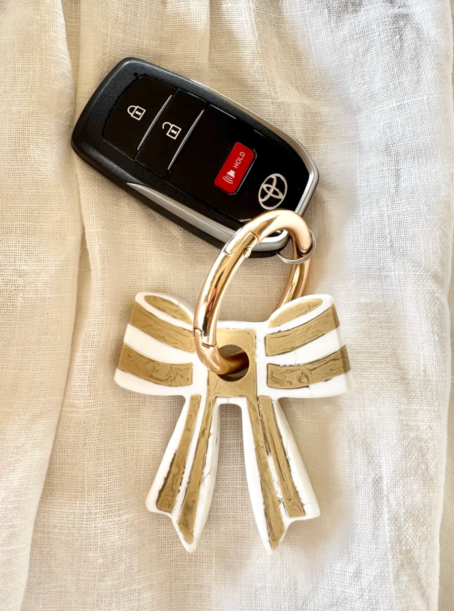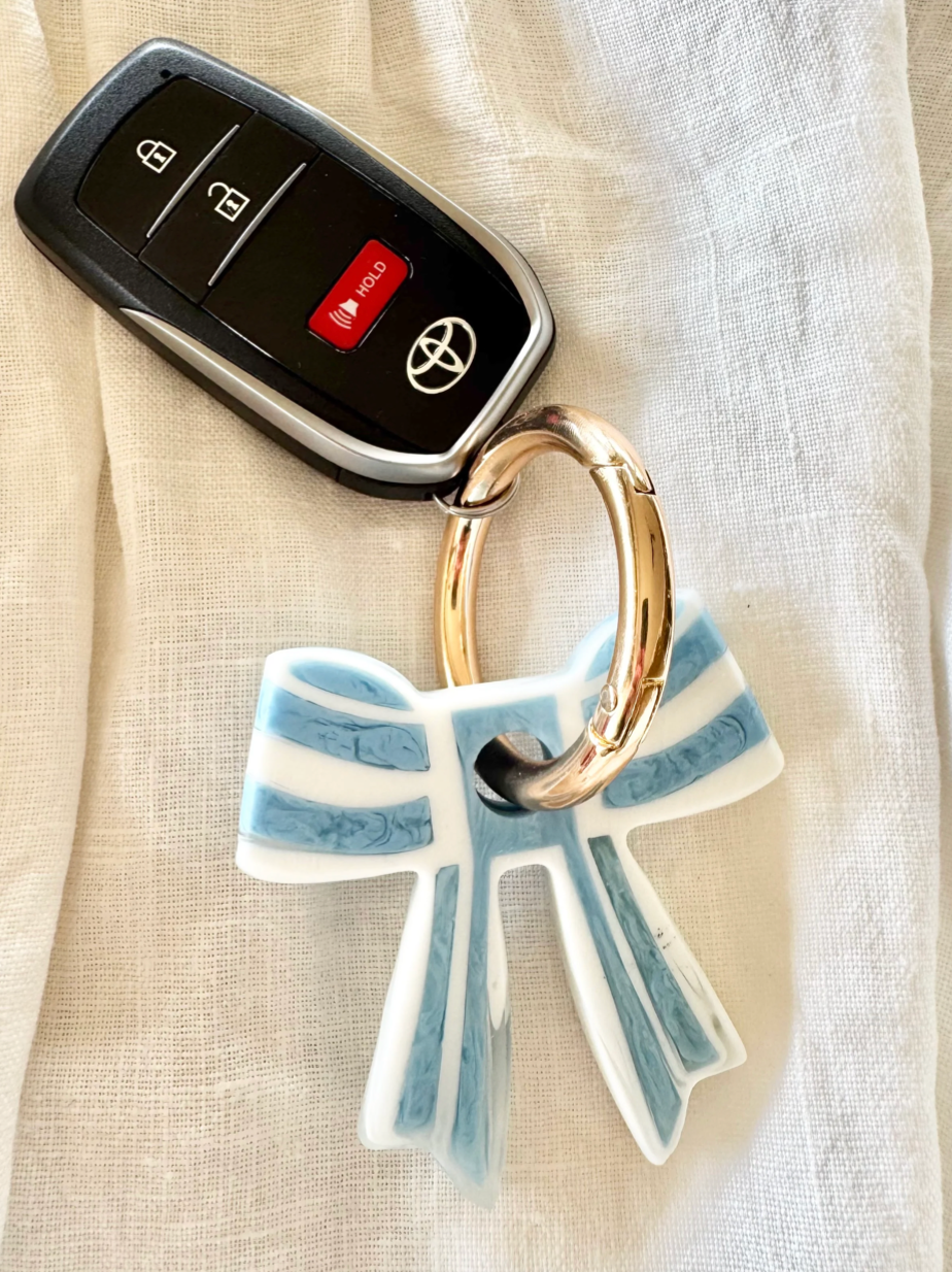 Give your keys a fresh look with our new on trend, stripey bow resin keyrings! Each one is hand-poured and uniquely yours. Available in 7 fabulous colours—brights, pastels, and neutrals—with gold hardware.