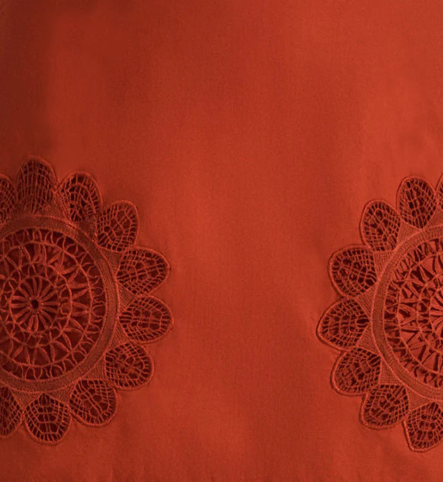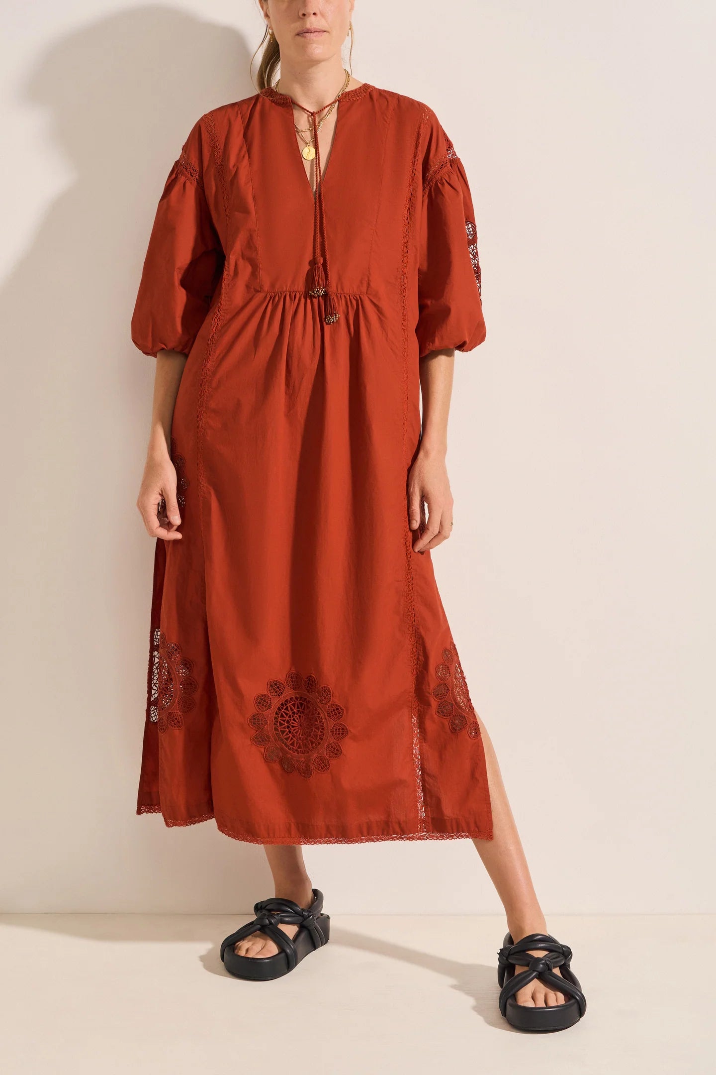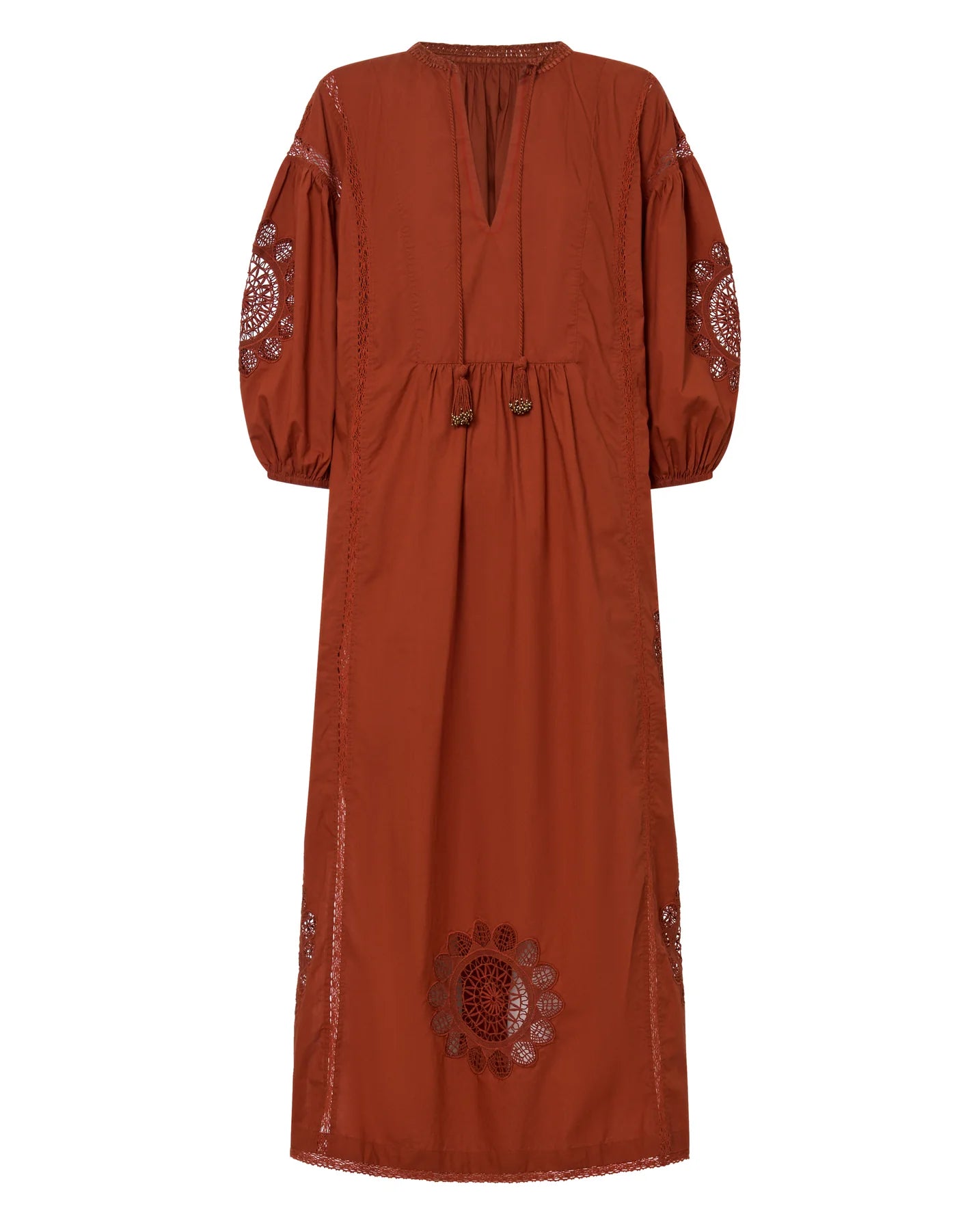 The Circe Dress is a feminine piece crafted from cotton poplin. Adorned with delicate lace appliqué at the sleeves and hemline, and intricate cotton lace detailing throughout, it exudes effortless charm. The dress features a flattering V-neckline with hand-crochet detail and tassels, 3-quarter puff sleeves, and side slits. With its loose silhouette and maxi length, it’s the perfect choice for a summer soirée, blending elegance and ease in a single, stunning design.
