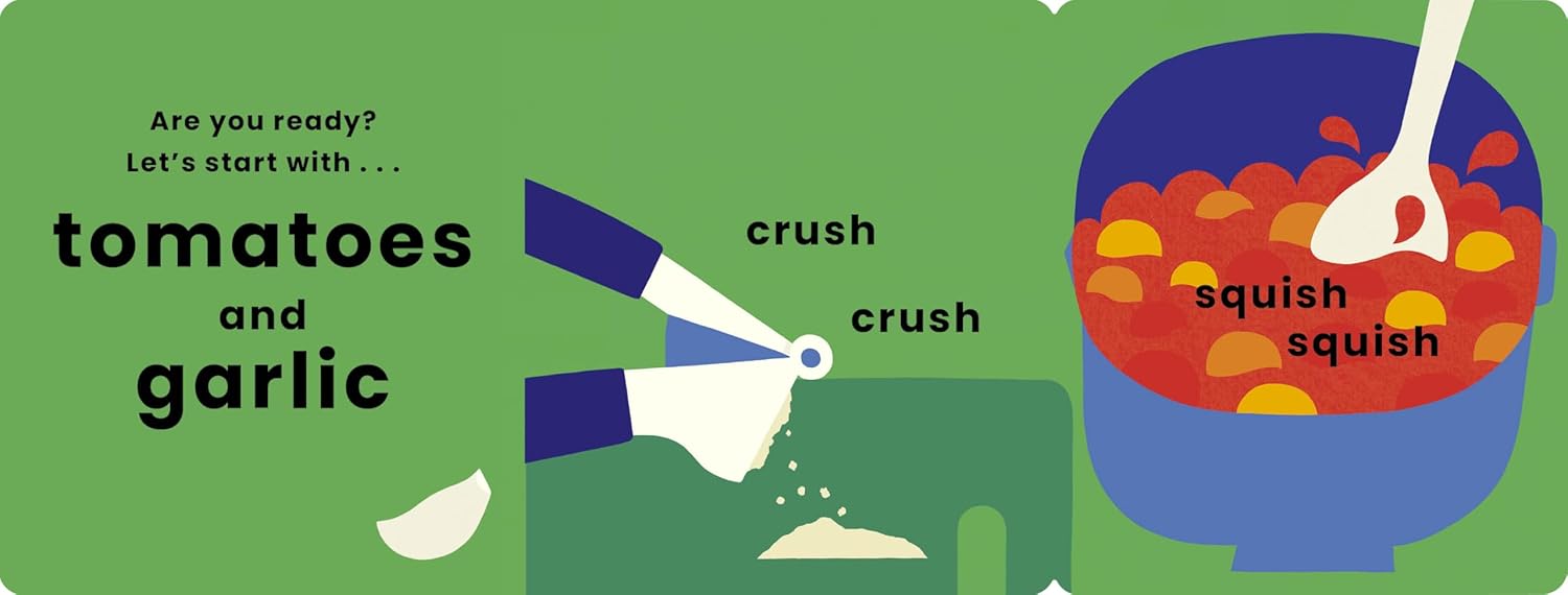 Every page of this sturdy board book features a new read-aloud word to see and say. Then, lift the flap to follow the action: squish the tomatoes, grate the cheese . . . In five simple steps you'll have made tomato pasta. Delicious!