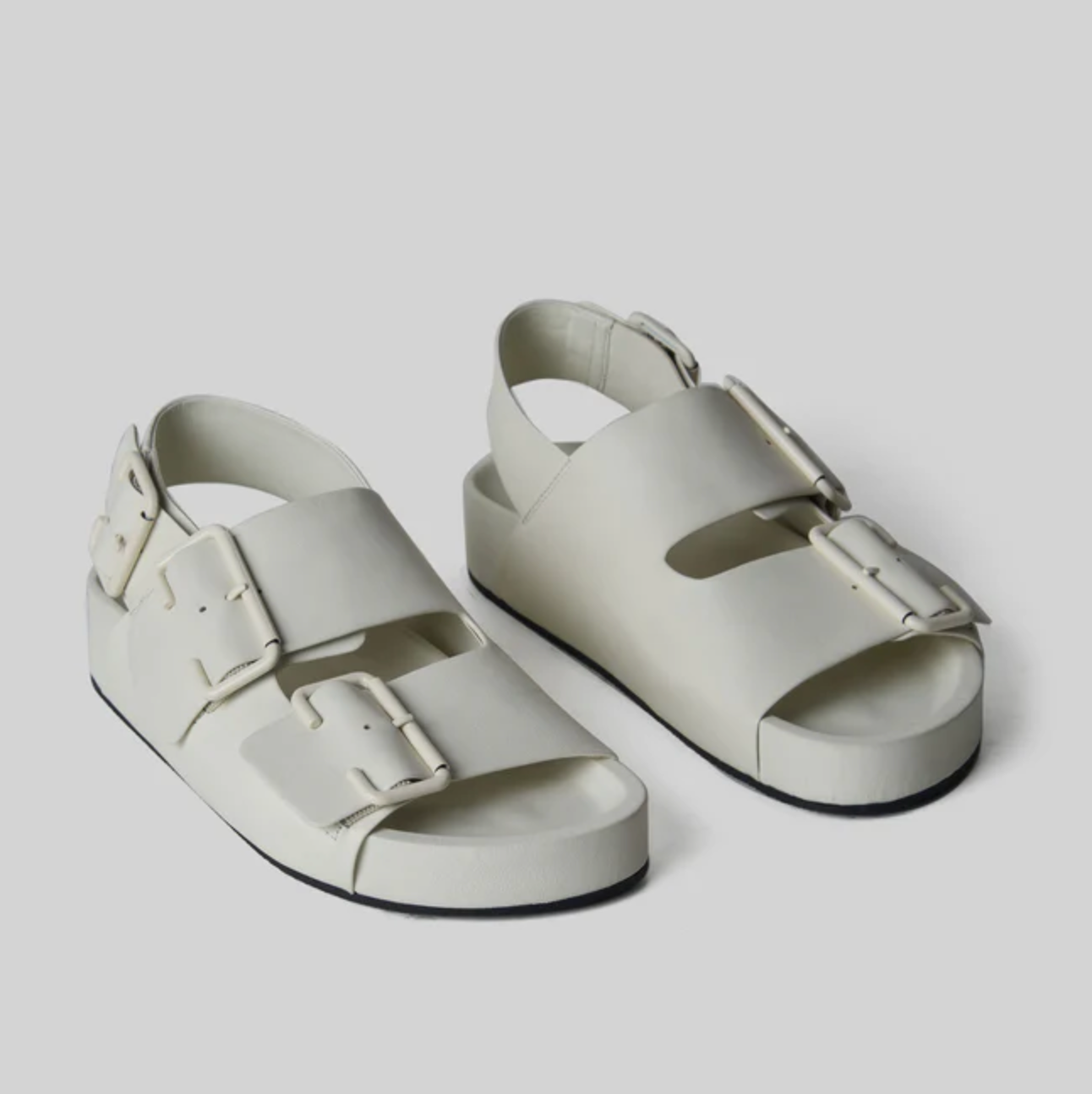 With oversized buckles, wide structured straps and a supportive slingback, it delivers on both design and comfort. The raised sole adds subtle height, while the contoured footbed makes it an easy all-day option. A refined take on the everyday sandal. Wear it with relaxed tailoring, cotton shorts or an oversized shirt for a clean, confident look.