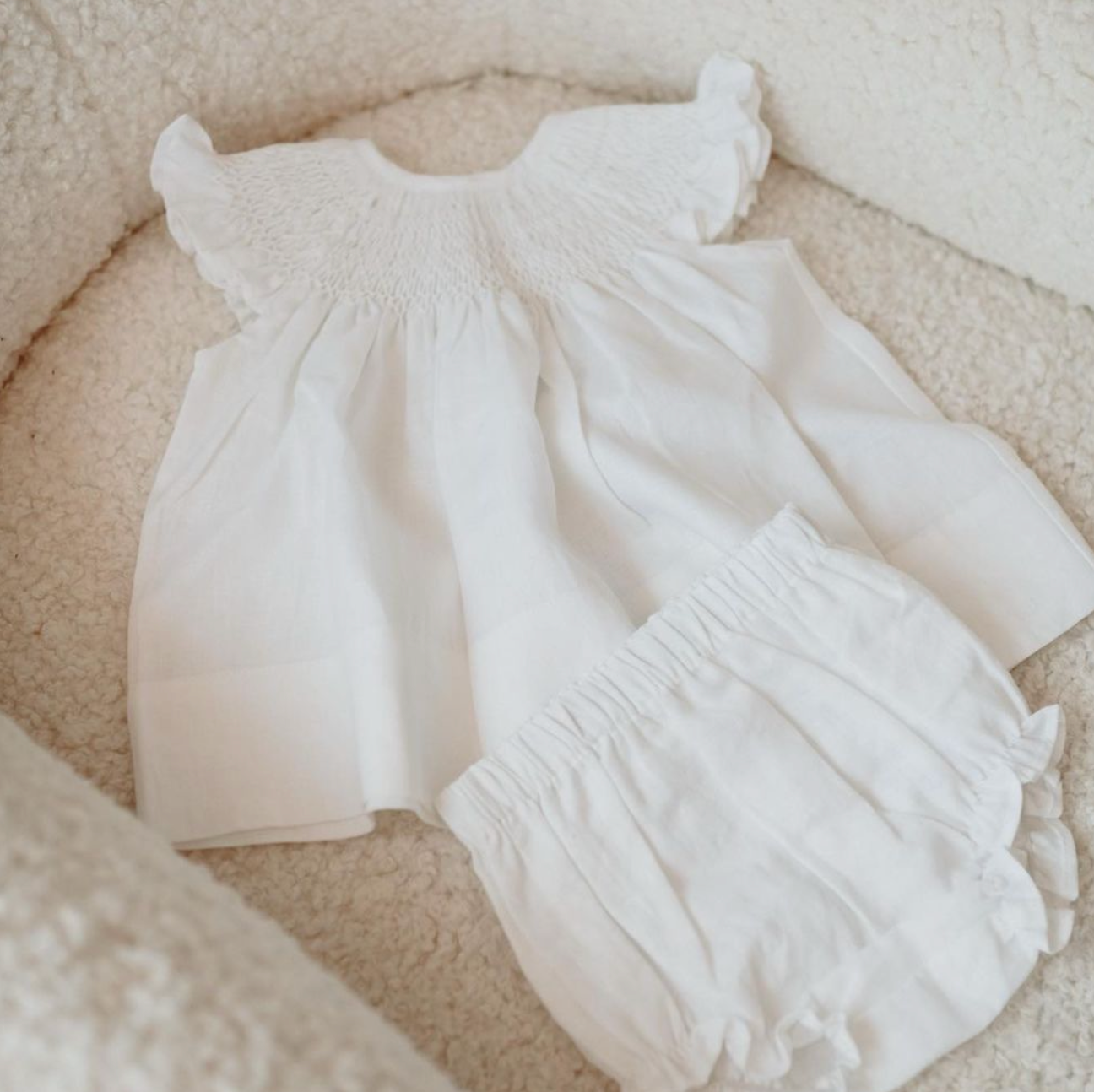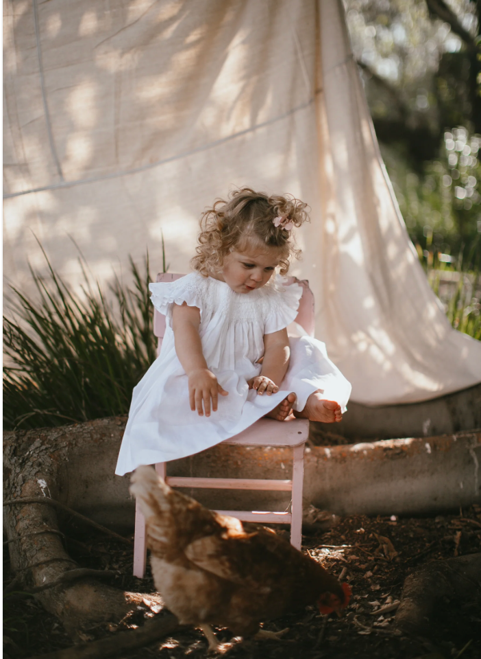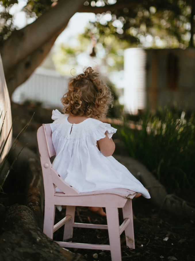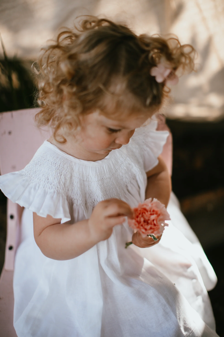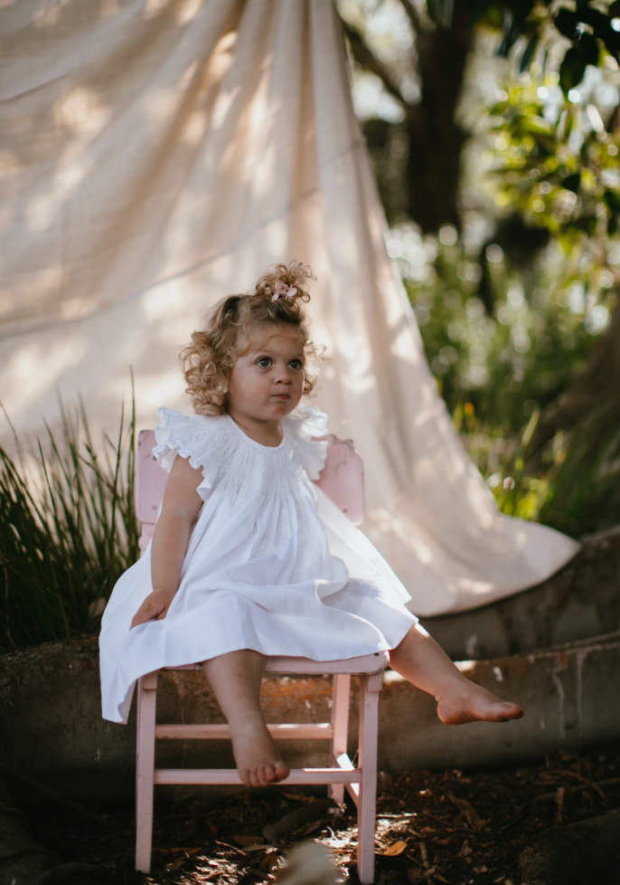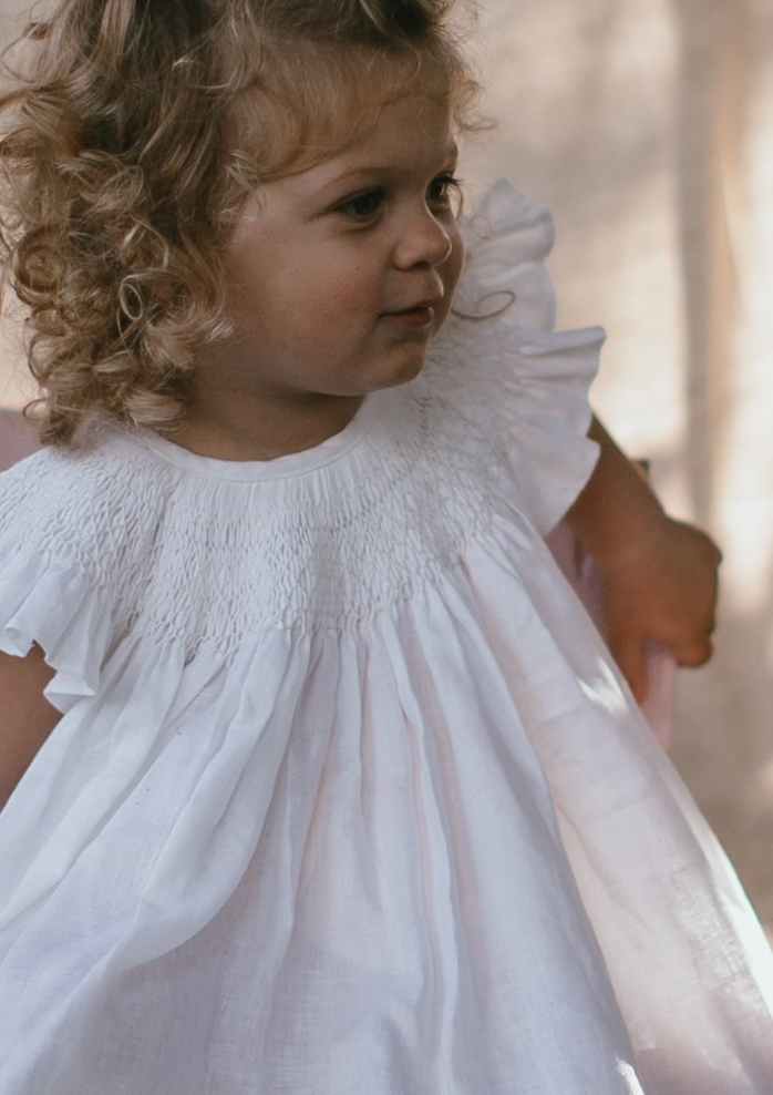 Made from our signature soft 100% Linen with all white, dense smocking detail adorning a bishop neck line. Camilla is a timeless, statement piece. Old world features with a contemporary look, whilst being suitable for easy Summer wear. Perfect for any special occasion from flower girl duties through to dinner with friends on a balmy summer evening.