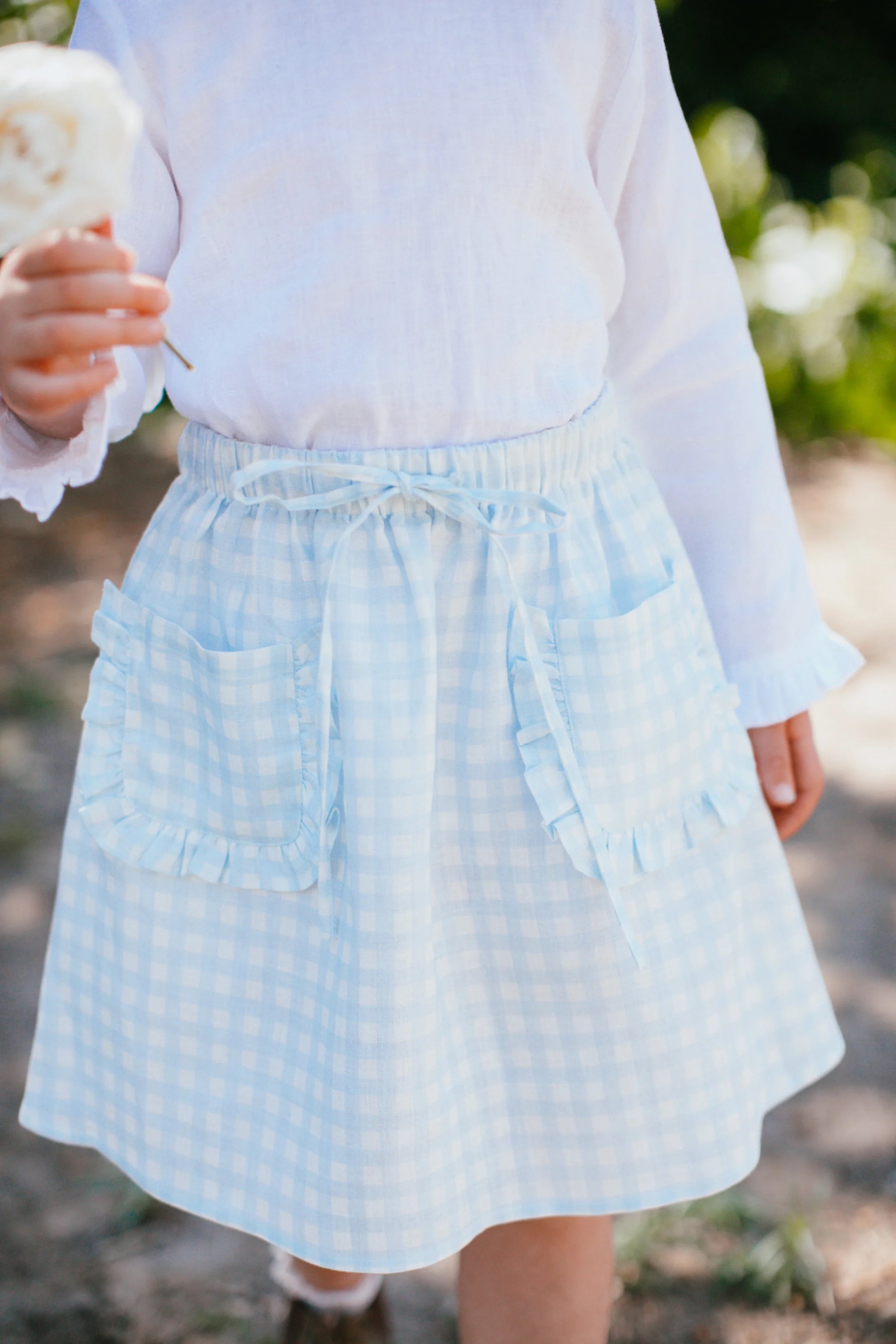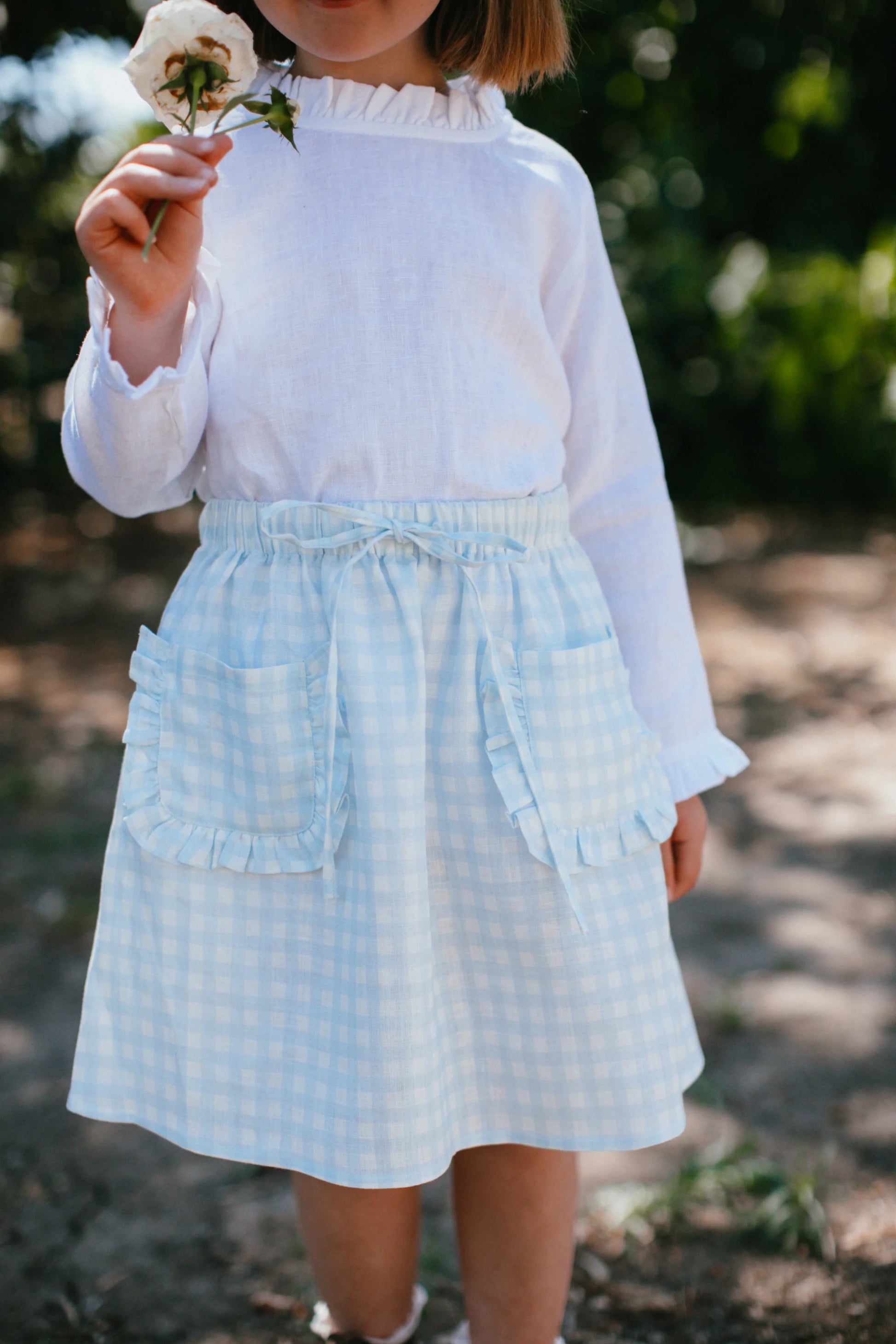 The Valentine skirt has an adjustable elastic waist for ease of wear and comfort and the sweetest ruffle pocket details, perfect for treasure collecting.