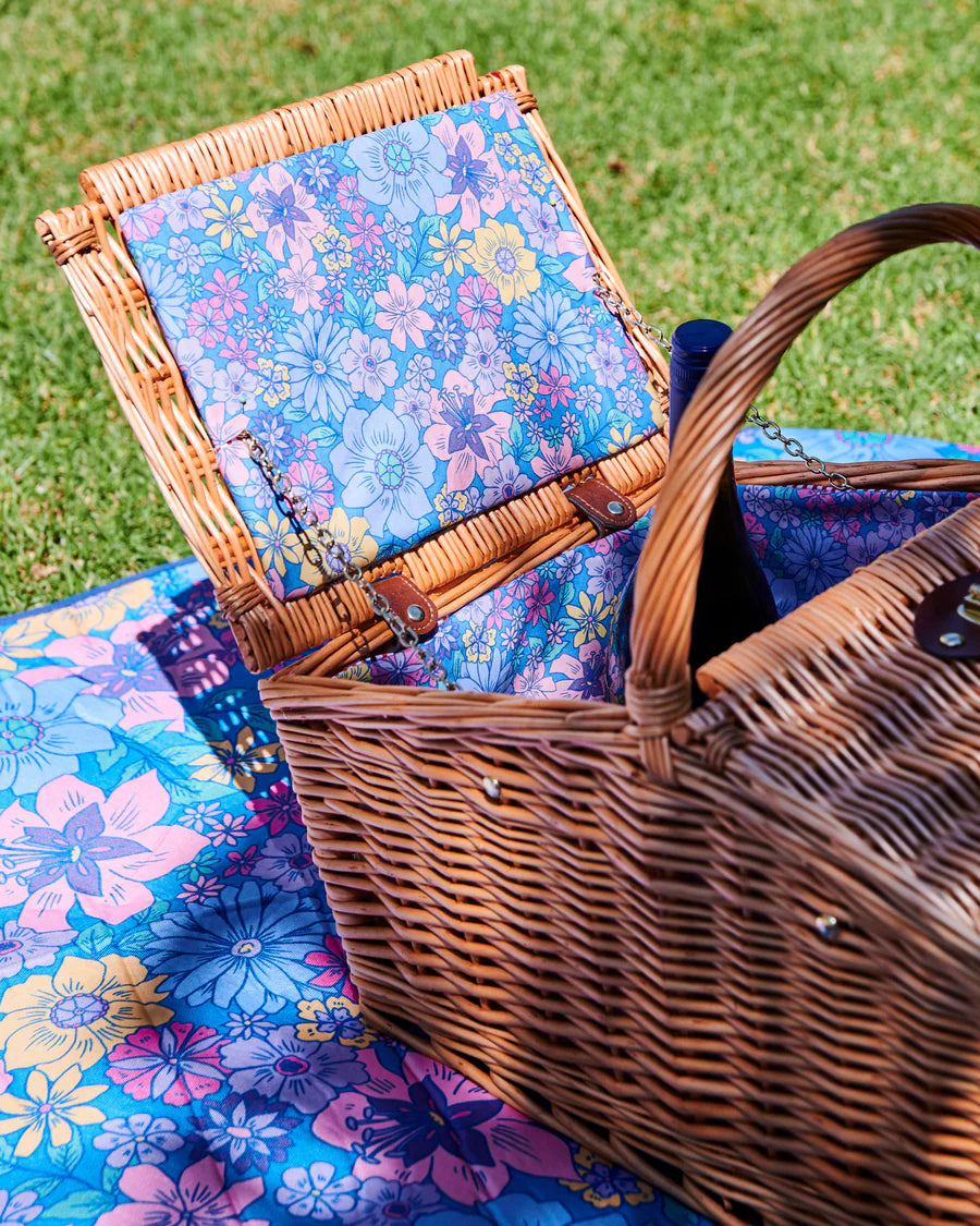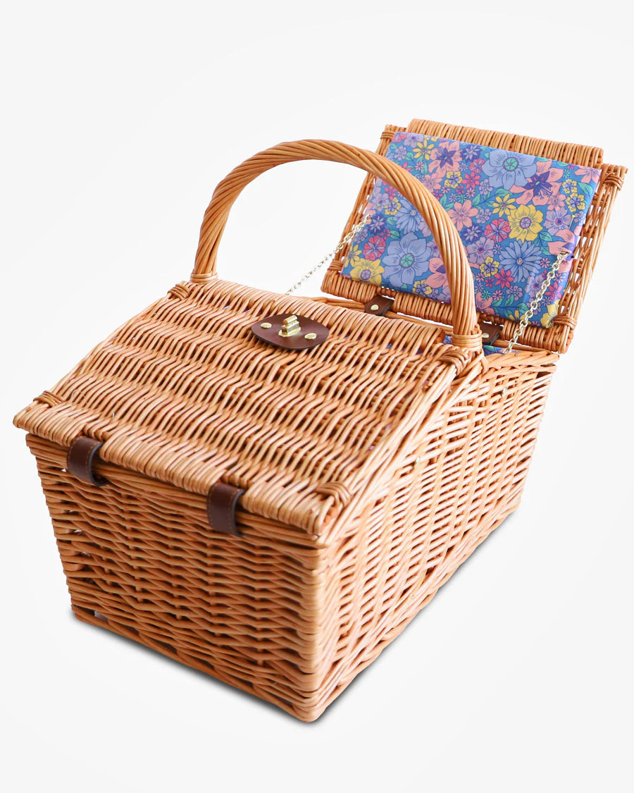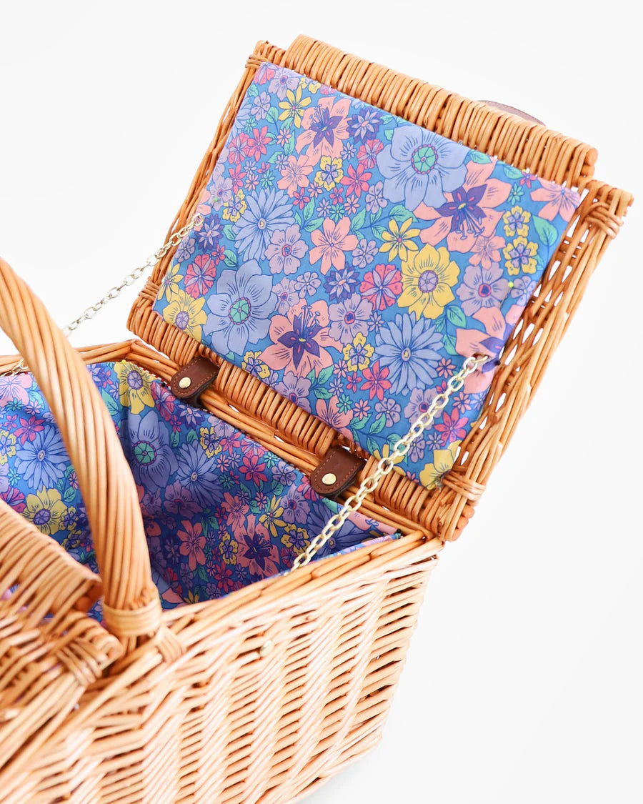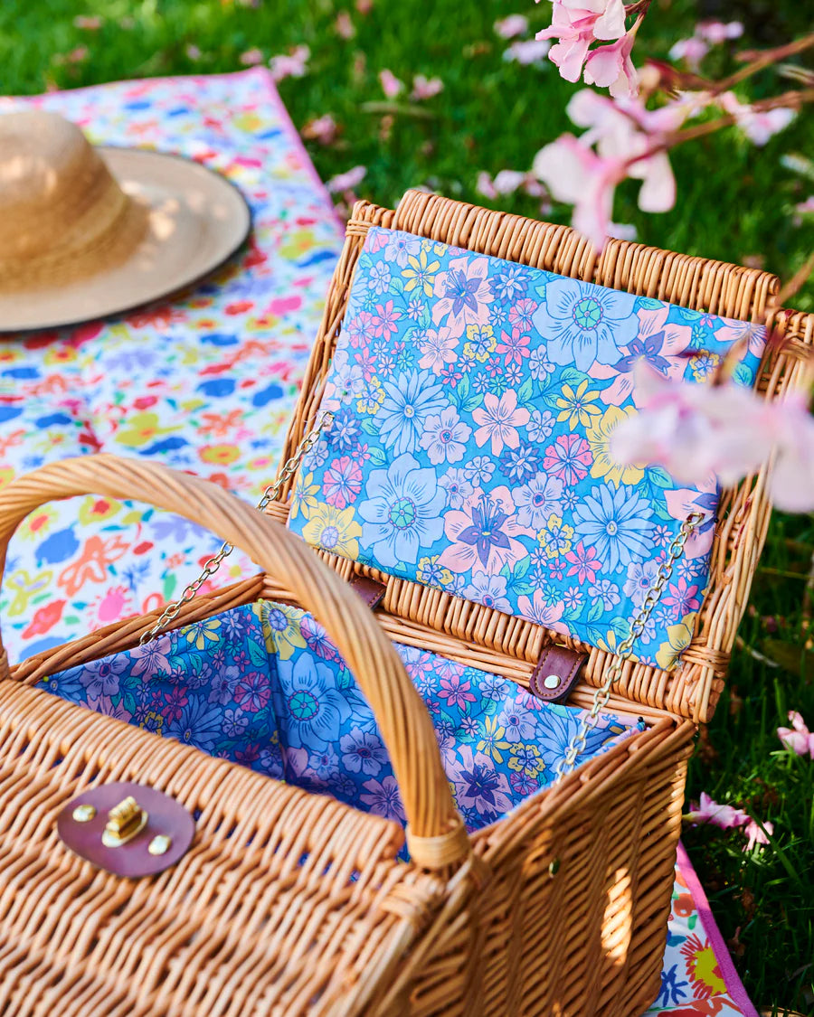 Summer plans are sorted with the Bunch Of Fun Rattan Picnic Basket. Take your dining outdoors and enjoy meals beside beautiful locations, making memories to treasure forever. This picnic basket is hand crafted from natural rattan with a printed cotton lining featuring an assortment of lovely little flowers in pastel tones on a blue base. Pack this basket full with our bamboo melamine for an easy peasy picnicware set. Just add snacks!