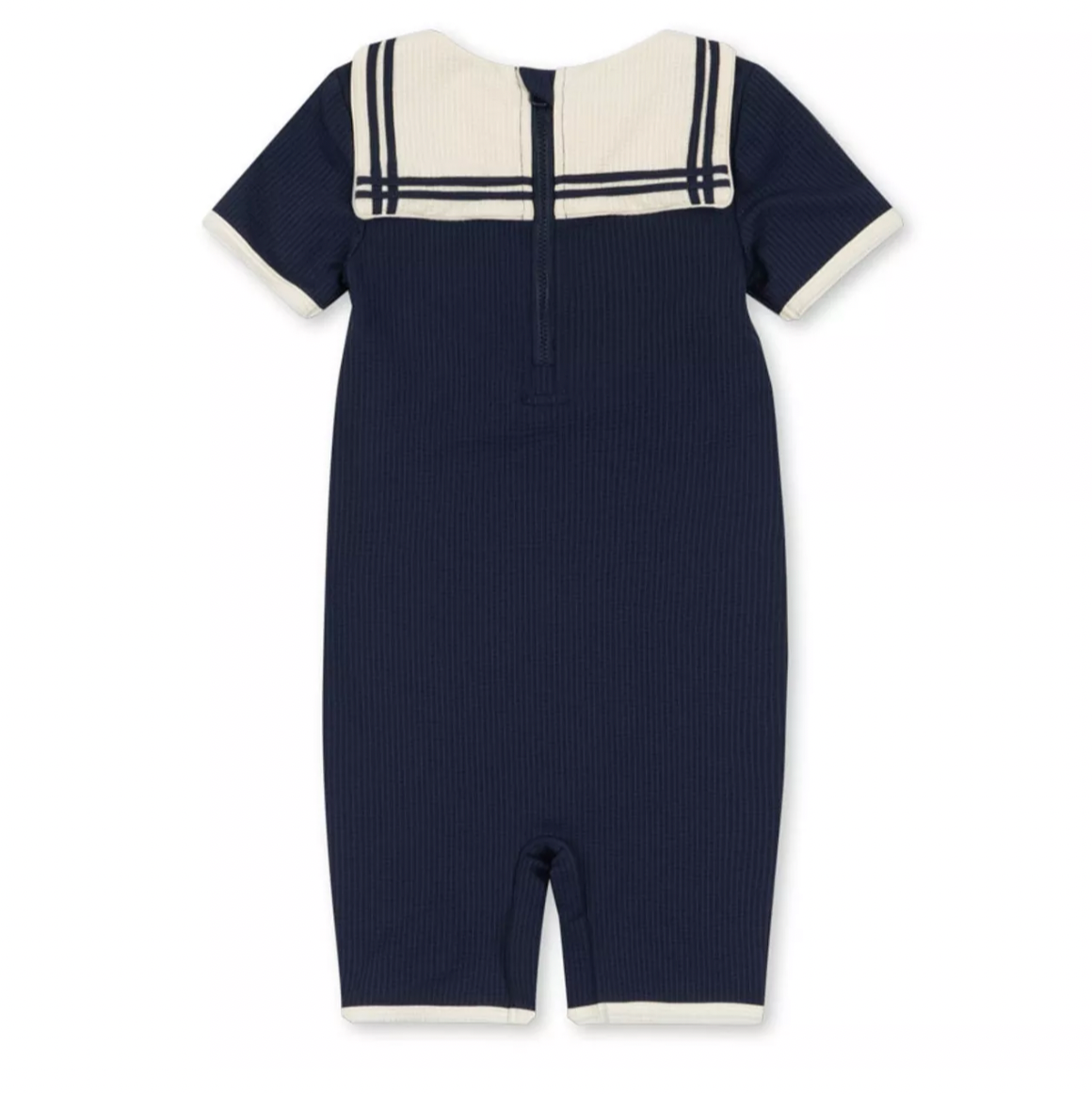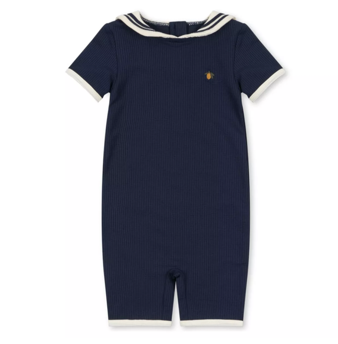 Introduce classic nautical style to your child's wardrobe with the Sailor Navy Blazer swimming costume from Konges Slojd. This one-piece with short sleeves and an adorable sailor collar is made from a pleasant seersucker fabric that adds a lightweight and unique touch.